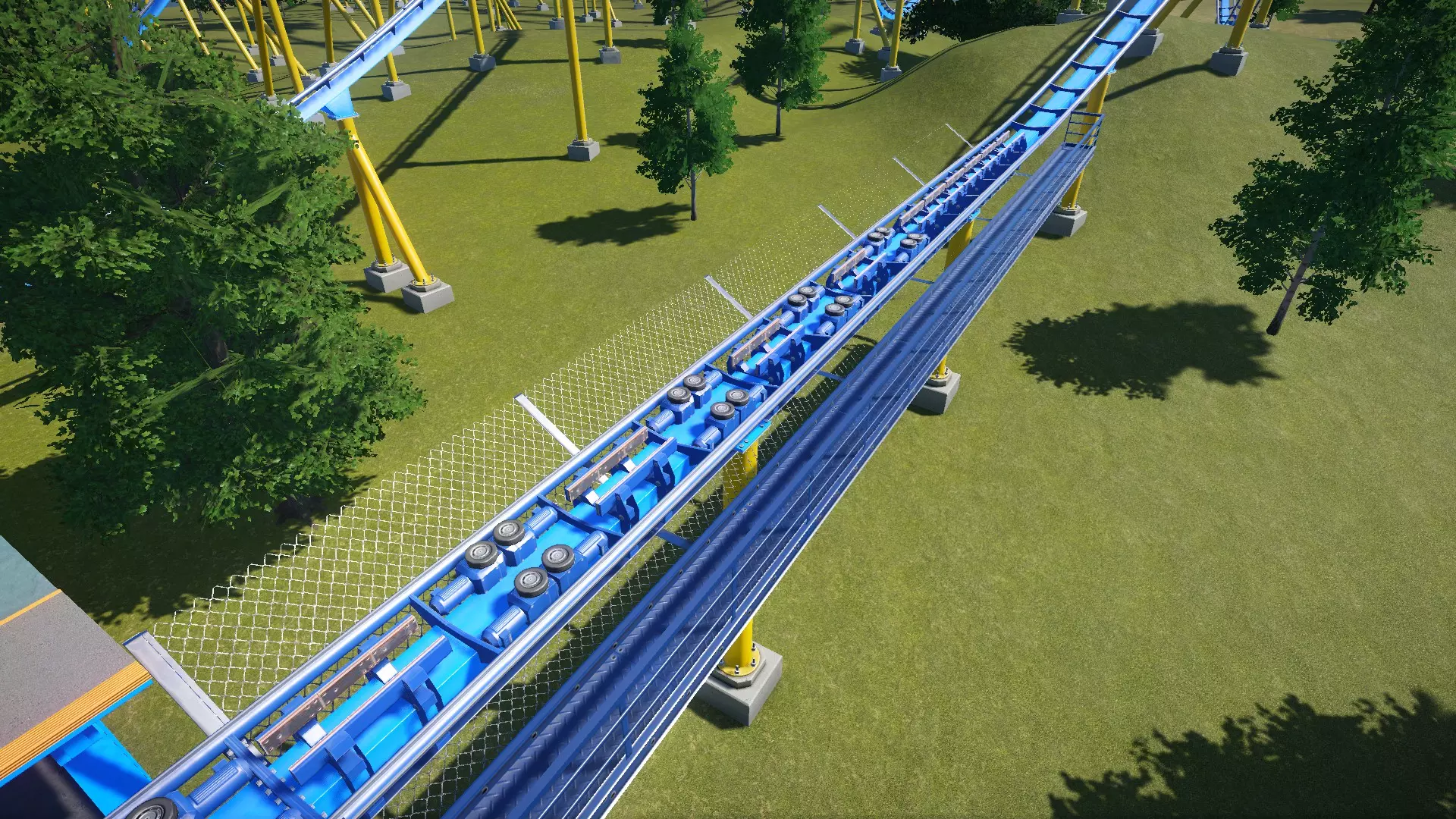 过山车列车本身没有驱动电机来沿轨道行驶,它们依靠重力和轨道上的机械装置保持运动。列车从车站出发时会获得一个初始的低速推力,但这个初始推力远远不足以让过山车带来刺激的乘坐体验。那么,如何获得让过山车完成整个轨道所需的速度呢?一种方法是使用链提升坡。链提升坡是一个大型的斜坡(实际上是过山车上最大的一个斜坡),其底部到顶部装有电动链条。列车会与链条相扣,由链条将其载至坡顶,随后列车与链条分离,在重力的作用下开始沿着第一个陡坡下滑。提升坡通常紧随车站之后,但有时车站与提升坡底部之间会有一个小落差(10-20英尺/3-6米),可能还会有一个弯道或一小段连续弯道。 链条的运行速度在4-14英里/小时(6-23公里/小时)之间。现实中大多数链条的运行速度低于8英里/小时(13公里/小时)。 缆绳提升:缆绳提升坡与链条提升坡的基本原理相同。不同之处在于,列车不是与持续旋转的链条相扣,而是与一个捕捉机构相扣,该机构将列车载至顶部后返回底部,以迎接下一列列车。你可以将链条提升想象成“过山车自动扶梯”,而缆绳提升则像“过山车电梯”。缆绳提升机比链条提升机更快(最高速度为17英里/小时/27公里/小时),但在游戏中仅用于少数过山车。 提升坡指南 大多数标准尺寸的过山车提升坡高度在120英尺-200英尺(36米-60米)之间。列车在第一个下坡底部的平均速度应在50-70英里/小时(80-115公里/小时)左右。速度过慢,列车可能无法以合理速度完成轨道运行(甚至根本无法完成)。速度过快,则除非将所有设施建造得异常巨大,否则很难将重力加速度控制在合理范围内。 如果是较小尺寸的过山车(如儿童过山车、自旋过山车,有时也包括木质过山车等),其提升坡高度通常在75英尺-120英尺(23米-36米)之间。这类过山车的最高速度通常保持在35-50英里/小时(60-80公里/小时)范围内。超级过山车和巨型过山车的设计特点是体型庞大且速度极快。超级过山车的最高点在200英尺至299英尺(61米至91米)之间,而巨型过山车的最高点则在300英尺至399英尺(92米至122米)之间。这些过山车通常能达到75至95英里/小时(120至155公里/小时)的速度。 单座过山车很少设置多个链条或缆绳提升坡。你应该计划在开始时使用一个提升坡,之后依靠重力完成其余部分。 虽然游戏中允许,但链条提升坡几乎从不设计成弯曲的。 虽然这在游戏中不会真正影响任何东西,但通常认为列车以过高速度接近链条而“撕裂”链条是不良设计。你希望列车以与移动链条大致相同的速度接近提升坡。链条/缆绳提升装置设置 两种提升类型都允许你控制提升速度。这个选择主要取决于你自己。只需记住,提升坡的EFN评分会较低,而且如果爬上提升坡的时间过长,过山车的最终评分将会受到负面影响。通常,你希望在30秒或更短时间内通过提升坡。 缆绳提升装置有一个链条提升装置没有的额外设置——返回速度。这决定了牵引机构在将列车运送上坡后返回坡底的速度。只需确保速度设置得足够快,以便牵引机构在下一列列车接近之前回到坡底。 驱动轮(轮胎...驱动轮的设计目的是在轨道的特定区段以低速推动列车前进。它们既不是提升装置,也不是速度助推器!如果您试图在过山车中这样使用它们,乘坐体验将会非常令人失望。驱动轮仅用于防止列车因动量损失而在水平或缓坡轨道上完全停止,例如主制动段和车站之间的轨道区段。 动力发射