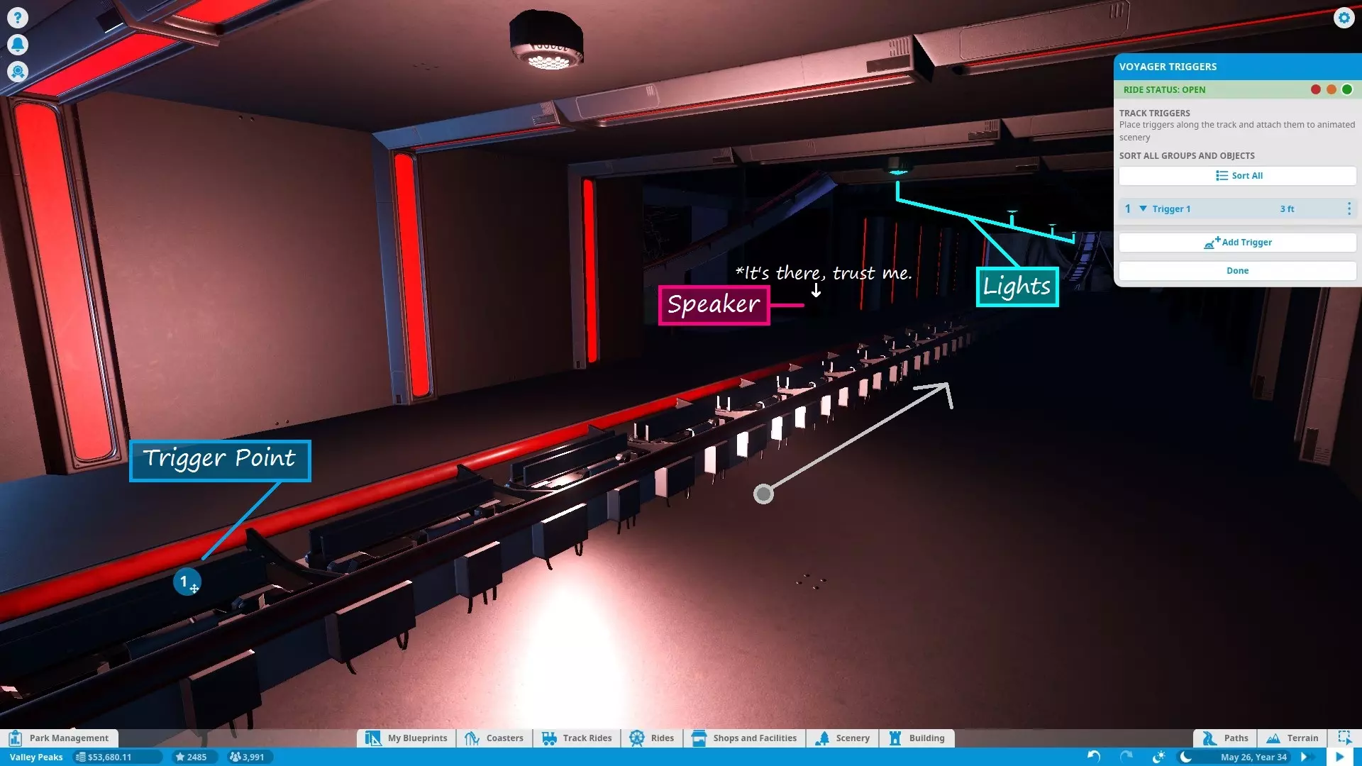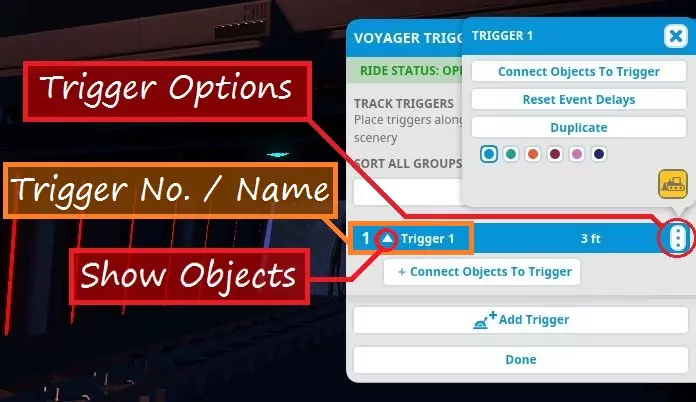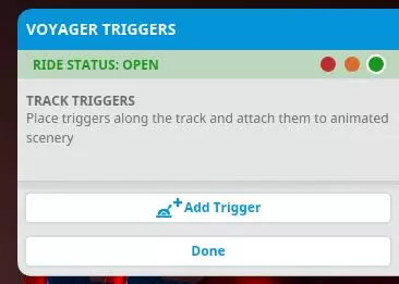 你可以关闭链条(这会关闭所有同步的过山车)、测试链条或打开链条(这会打开所有同步的过山车)。当链条处于打开状态时,只要满足加载条件,所有链式过山车都会同步启动。 你也可以查看各个过山车的状态,但无法在此处打开/测试/关闭它们。你必须前往特定过山车的信息面板才能打开/测试/关闭它。如果链条中的某个过山车发生故障,其他过山车将照常运行。 最后,你可以根据需要添加/移除链条中的单个过山车,只要链条中至少有2个且不超过5个过山车即可。你也可以移除整个链条,此时过山车将恢复独立运行。触发事件 也许你打造了一个科幻主题过山车,想让乘客体验一场史诗般的太空战斗!或者你希望当乘客经过时,北海巨妖从深海中崛起。又或者你想在乘客乘坐地下设施时突然惊吓他们。再或者,你只是想让 ride 以五彩纸屑和泡泡结束。 无论如何,你都可以使用 ride 触发器实现一些令人难以置信的定时效果和事件。触发器是轨道上的特定点,当过山车列车经过时会激活场景。你可以使用游戏中的任何特效、电子动画和灯光。对于音频效果,你必须使用【公园扬声器 - 触发式】。你可以设置多个触发器,也可以将多个项目链接到一个触发器。你可以点击场景项目来调整激活持续时间。设置场景