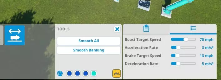 在建造车站或轨道的发射段时,你可以在实用设置中选择【目标加速速度】。这是过山车应达到的最大速度。需要经过几次通过才能达到该速度。如果你发现列车未达到目标速度,请增加通过次数。