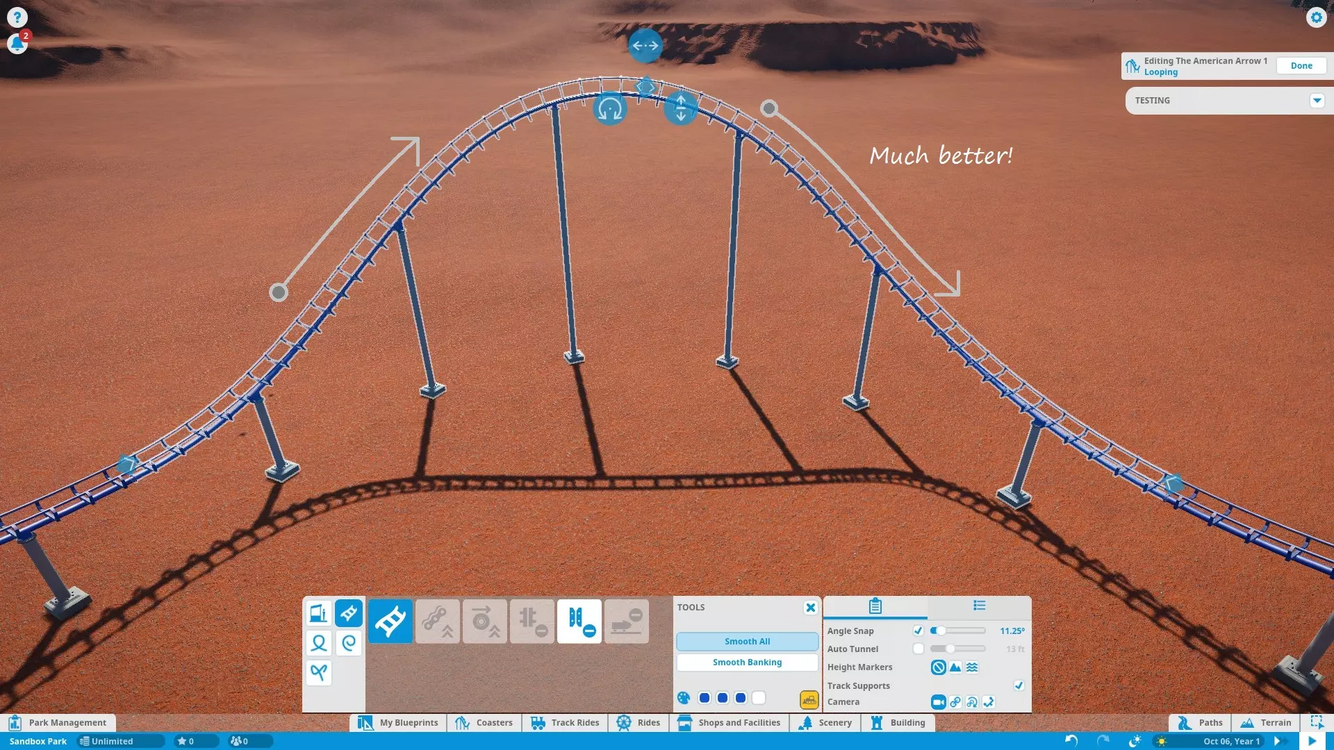 在建造轨道(尤其是弯道、坡道和自定义翻转轨道)时,【平滑所有】和【平滑倾斜】工具非常实用。它们能缓和所选轨道段之间的过渡,打造出更平滑、更高质量的过山车。这里我特意强调“更高质量”,而非“更真实”。现实中就有不少过山车在某些地方本可以使用平滑工具。如你所料,【平滑所有】会平滑所有参数(坡度、倾斜度和曲率),而【平滑倾斜】仅平滑倾斜度。你可以反复点击任意一个按钮来增强效果。 请注意,平滑工具不会影响预制轨道段或与其相邻的轨道块。此外,请注意,选择并平滑大型轨道段可能不会得到你预期的结果。轨道平滑(尤其是在大型轨道段上)的常见副作用包括曲线变陡、自定义翻转轨道被取消翻转,以及直线轨道上出现奇怪的渐进倾斜(通常出现在进入或离开倾斜曲线的位置)。为获得最佳效果,请分小部分平滑轨道。 注意: - 编辑过山车时,任何阻碍轨道的景物必须在建造轨道前手动移除。如果你不介意游客撞到树枝、岩石、建筑物等,你可以在游戏设置中关闭碰撞检测。当然,这样做也有合理的理由。 - 你可以使用CTRL+Z和CTRL+Y来撤销/重做你的上一步操作。这几乎适用于游戏中所有形式的建造和编辑。车站