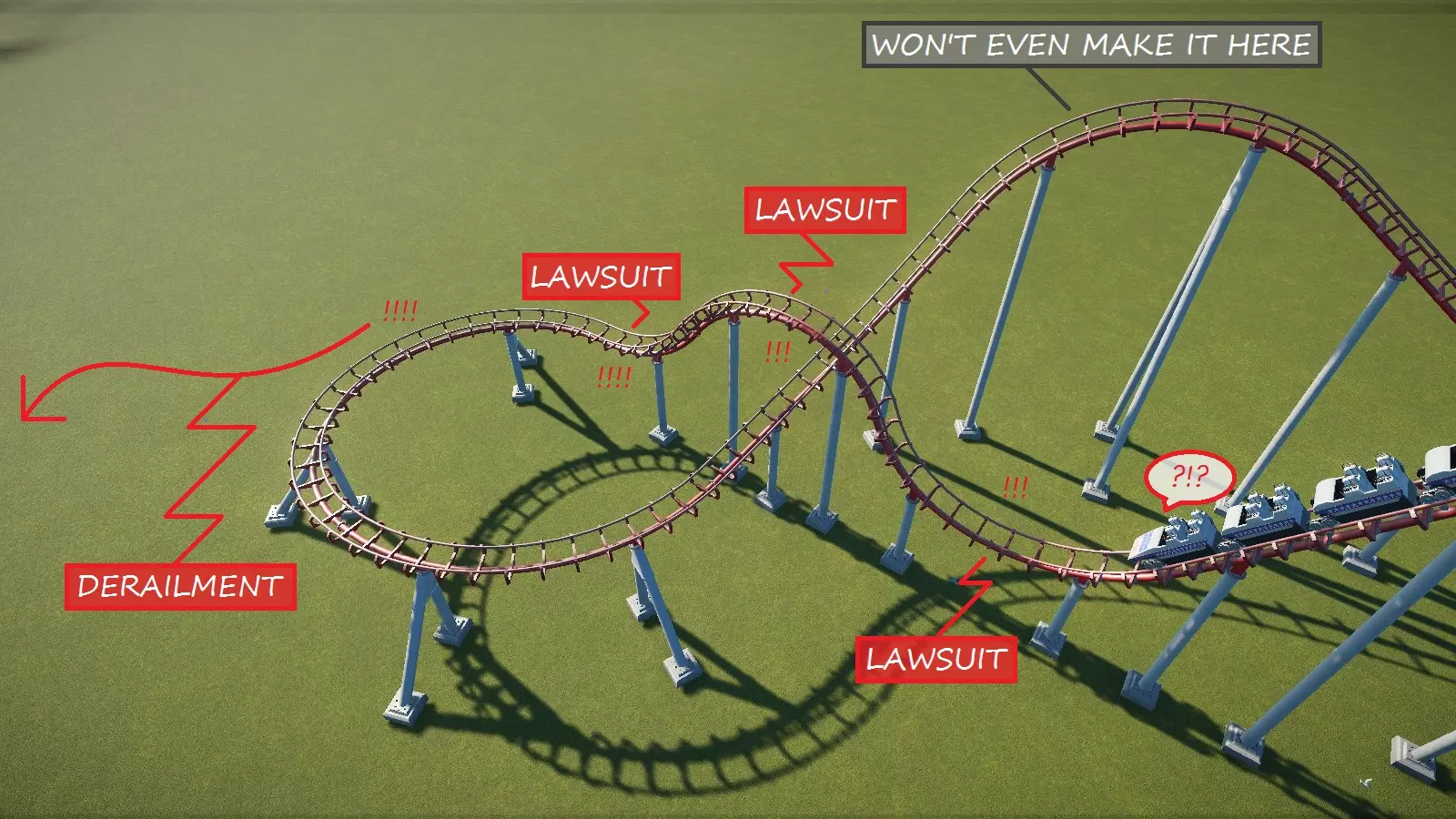 中等(橙色)的兴奋度或恐惧感并不总是坏事;许多游客仍然会乘坐。 典型的G力限制: 正向:+5.5G 负向:-1G 侧向:约2至3G (部分过山车可能因其特性而略微超过这些数值。) 选择轨道类型时,请自问: 我能负担得起哪种类型的过山车?(在沙盒模式中无关) 这款过山车的目标人群是哪些? 我希望这款过山车有多大?我希望它占用多少空间? 它是完整循环式还是双向式?(这点很重要,因为每种轨道类型只能设计为其中一种,不能两者兼具!) 我希望这款过山车与地形/景物有互动吗? 我想要哪种座位位置(轨道上方、悬挂式、翼乘式、飞行式等) 常见问题:我可以建造多个车站吗?不行,过山车只能有一个车站。 我可以建造同步(对决)过山车吗?可以。有关更多信息,请参阅【对决过山车】。 为什么我的过山车会驶过车站并卡住?这听起来像是你将双向过山车类型用于了完整循环布局。 为什么我的过山车无法爬上提升坡?可能有以下几个原因: 1. 没有链条或缆绳提升机制——确保你对该坡道使用了缆绳或链条提升轨道。列车无法在标准轨道上自行爬升。 2. 使用了驱动轮——它们并非设计用于牵引列车爬升,而是用于在水平轨道上保持列车运行。 通用提示:在转弯处倾斜轨道,以减少横向G力和高恐惧值。大多数过山车高度不超过200英尺/60米,除了超大型、巨型和 strata(冲刺500)过山车。它们的高度峰值分别超过200英尺/60米、300英尺/90米和400英尺/121米。 使用摩擦制动器可大幅降低列车速度,使用微调制动器可略微降低速度。 阻挡制动器会降低列车速度,必要时会使列车停止,直到前方轨道上没有其他过山车列车。通常在运行多列列车时需要使用。有关进一步说明,请参见【阻挡制动器】部分。 结论和其他指南信息