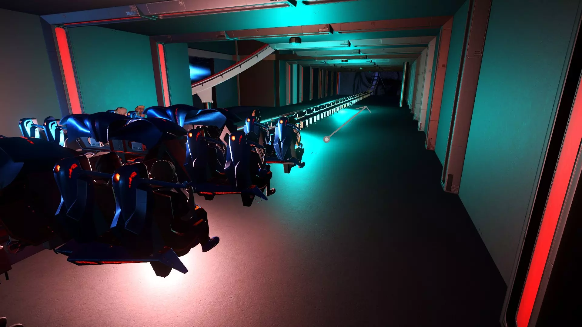 在本节中,我们将以我在编写本指南前制作的一个公园【山谷之巅】为例。在这个公园里,我建造了一个名为【旅行者】的科幻风格发射式翼过山车。该过山车从一个发射隧道中出发,隧道内的蓝色灯光会随着过山车加速驶出而依次点亮。