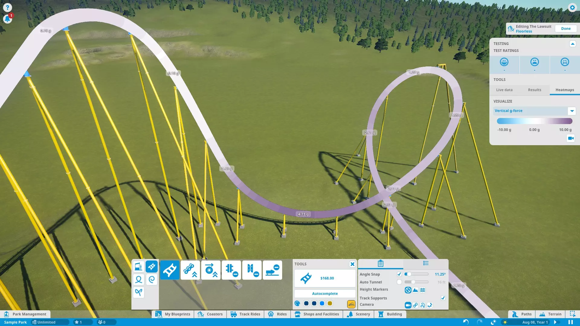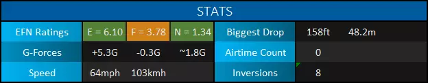 注意到坡道底部有更大的过渡区域以及更大的俯冲环。同时注意到重力加速度值显著降低:原本的+10Gs 现在约为+4.75Gs,+6.6Gs 现在降至+2.4Gs。虽然无需展示每一张热力图的截图,但需要说明此路段的平均恐惧值已从7+降至5(这是个好现象)。兴奋度也从9略微下降到8,但从整体来看影响不大。负重力加速度也适用同样的调整原则。