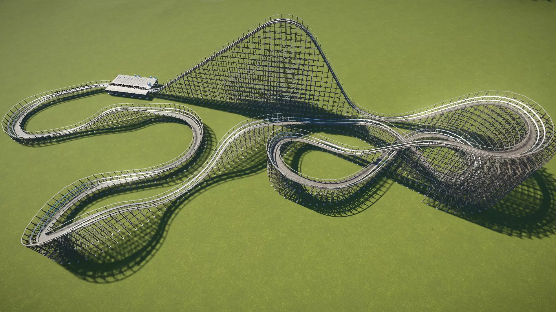数据统计: EFN 评分:E = 6.81,F = 4.01,N = 1.32 最大重力加速度:正向 = +4.8Gs,负向 = -0.8Gs,横向 = 1.6Gs 最高速度:67 英里/小时(108 公里/小时) 最大落差:150 英尺(45.7 米) 翻转次数:5 次 空中时间次数:3 次(总时长 2.5 秒) 关键特点(**适用于大多数过山车,不仅限于此类布局) ** 站台位于轨道布局的外侧。不一定必须放在外侧,但位置应便于进入且远离轨道和支架,通常这样是最佳的。 ** 站台和链式提升机之间常有小落差和弯道,但主要用于方向控制。这些落差和弯道不会产生大量的刺激感或恐惧感,若包含在内,应设计得简短。 ** 轨道通常会相互交织并循环穿梭。这样既美观又能节省宝贵的公园空间。为了达到更真实的视觉效果,请尽量避免移除轨道支架。不过也不要因此限制了你的创造力,少一个支架通常不会有太大问题。 轨道在整个 ride 过程中会有一个整体的上下起伏运动。过长的水平轨道段可能会降低【EFN 评分】。 大型翻转元素(如 loops、hammerheads、cobra rolls 等)、大转弯和高坡最好安排在 ride 的前半段,此时列车速度最快。小型翻转元素(如 corkscrews、inline twists、cutbacks 等)、转弯和坡道则更适合放在中段制动块之后(或在没有中段制动块的布局中,大约在轨道的中间位置),因为此时列车速度较慢。刹车被放置在车站前方,以防止列车猛烈撞击车站。 非翻转轨道布局(及木质过山车):下一张截图展示了一个木质过山车的轨道布局。