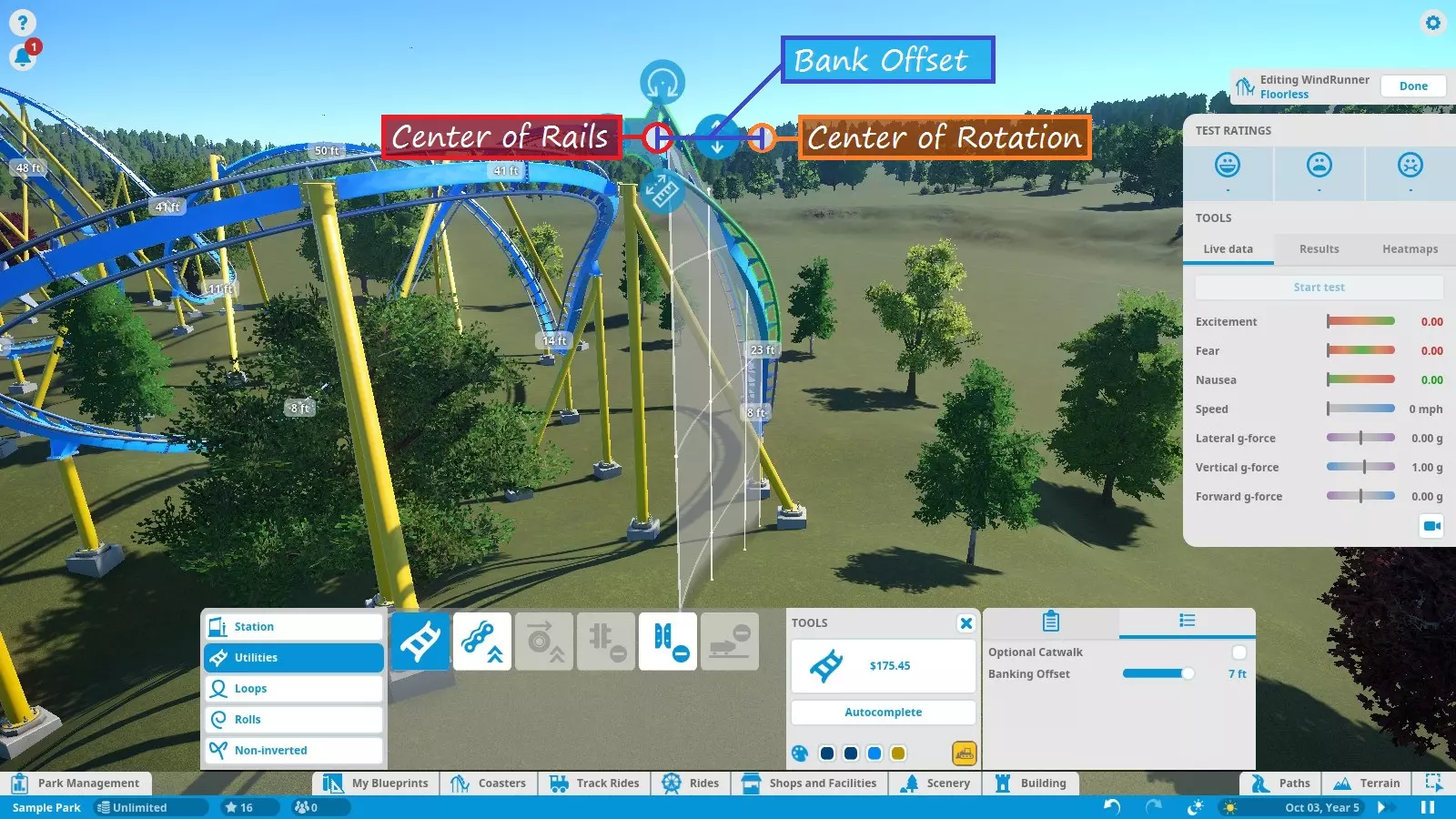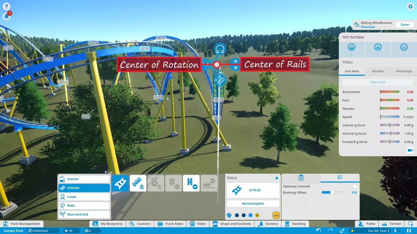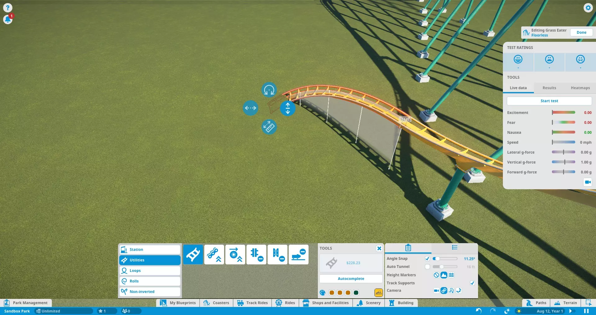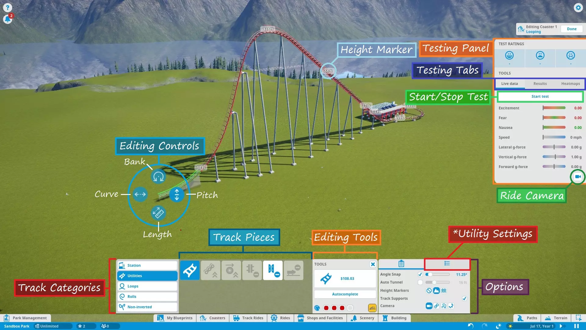 Here's a rundown of the labeled parts of the screenshot above: TRACK CATEGORIESAll of the track parts and pieces fall into one of the five categories: Stations (choosing the entrance/exit sides) Utilities (standard track, lift/launch mechanisms, and brakes) Loops (predefined vertical loops and loop variations) Rolls (predefined twists and other non-loop inversions) Non-Inverting (predefined track segments that do not bank more than 90 degrees)NOTE: Loops and Rolls will not appear if the track type you're working with does not allow inversions. TRACK PIECESShows all the available track pieces for a given category. All the various pieces outside of "Utilities" don't really need individual explanation. Utility pieces are explained in their respective sections later in this guide. EDITING TOOLSButtons that assist in track building: Build Button - Shows the type of track piece you're building and its cost. Click to build the previewed track piece. Delete Button - Yellow bulldozer button in the lower-right corner. Click to remove the currently selected track segment from your existing track. Autocomplete - Attempts to connect the track back to the station (or fill in a gap between existing track segments) using standard track. Be careful when using this tool! Autocomplete attempts to find the simplest route, not necessarily the best. Also, note that autocomplete will not consider modifying the terrain to find a solution. If you're building an underground tunnel and try to autocomplete the track, it will fail. Color Swatches - Allow you to choose the colors of the track piece you are currently editing. See "Ride Customization" for recoloring the entire coaster. EDITING/TRACK OPTIONSThis panel features 2 tabs each with options to fine-tune editing and track pieces. In the 'Settings' tab, you have: Angle Snap - Locks the track editing controls to specific angles. Check the box to turn angle snap on for simpler and more consistent building. Uncheck the box to turn angle snap off for complete control and precision. Auto Tunnel - Automatically digs a tunnel when building a track into the terrain. Use the slider to set the tunnel width. NOTE: Occasionally, if you leave this option on when building close to the ground or water (but not into/under it), the game may tell you that the track piece is "obstructed" even though it isn't. Try turning off auto-tunnel to fix this. Height Markers - Markers along the track that inform you of the track's elevation either above the ground or sea level, depending on which option you choose. You can turn them off altogether as well. Track Supports - Turns track supports on or off. No, your coaster isn't going to fall apart if it doesn't have supports. They are purely aesthetic. Camera - Choose how the camera moves as you build, or if it moves at all. The 'Utility Settings' tab has options specific to track pieces in the 'Utilities' tab. I marked this one on the diagram because I will refer to it several times throughout the guide. Options like catwalks, chain/launch speed, brake settings, etc. are found here. EDITING CONTROLSAllow you to modify the shape of a track piece before building it. Simply left-click one of circular buttons and drag in the appropriate direction to modify the track. Here are the control functions, starting from the top and moving clockwise: Bank (twist) Left/Right Slope Up/Down Lengthen/Shorten Track Piece Curve Left/RightWhen building a predefined track piece you are given a different set of controls: Resize Larger/Smaller Angle Left/Right (relative to the last placed track piece)You can also select existing track sections (usually a selection of two or more track segments) and adjust their shape/position using yet another set of controls: Move Left/Right Raise/Lower Bank Left/Right (not applicable to predefined pieces) Resize Larger/Smaller (predefined pieces only) Rotate Left/Right (predefined pieces only) TESTING PANELGives you all the stats on your coaster as you are editing. Press the "Start Test" button to load up test dummies and take them for a spin! The test will repeat until you stop it with the "Stop Test" button or leave the editor. At the top of the test panel are the EFN ratings. The train must complete a full circuit before these stats can be determined. Any time you edit the track, the results are cleared and have to be recalculated. Under the EFN ratings are 3 tabs: Live Data - Displays data as the test train travels around the track. Results - Displays stats after the test train has completed a full course. Heatmaps - Takes live data and uses it to create an overlay on the track so you can see how the data changes over the course of the ride. Useful for finding sections of your coaster that may need improvement. As of Update 1.3, you now have an option to choose between "Live Data" and "Previous Run Data". "Live Data" draws the heatmap during a test in progress and clears the heatmap at the start of each test. "Previous Run Data" creates/updates the heatmap at the end of each test. Finally, in the Testing Panel you have a ride camera. This lets you hop onboard and experience your own creation! From a editing perspective, the ride cam can help test for rough spots in the track and test trigger timing (discussed later) to make sure riders get the experience you want them to have. And, of course, it's sometimes just fun to ride what you build! Just be careful if you're the type who gets queasy easily. The simulation may suddely become way too real way too fast. NOTE: Test coasters will crash if the track isn't complete. In an open and operational park, the derailed test trains may plow through your crowds of innocent guests! The guests don't seem to mind this though and actually celebrate once they get up off the ground. Living in an E-rated game must be very pleasant... Coaster Editing 2: Building and Editing Tracks Now that you know what everything does, let's talk about how to make tracks! Laying Down and Removing Tracks