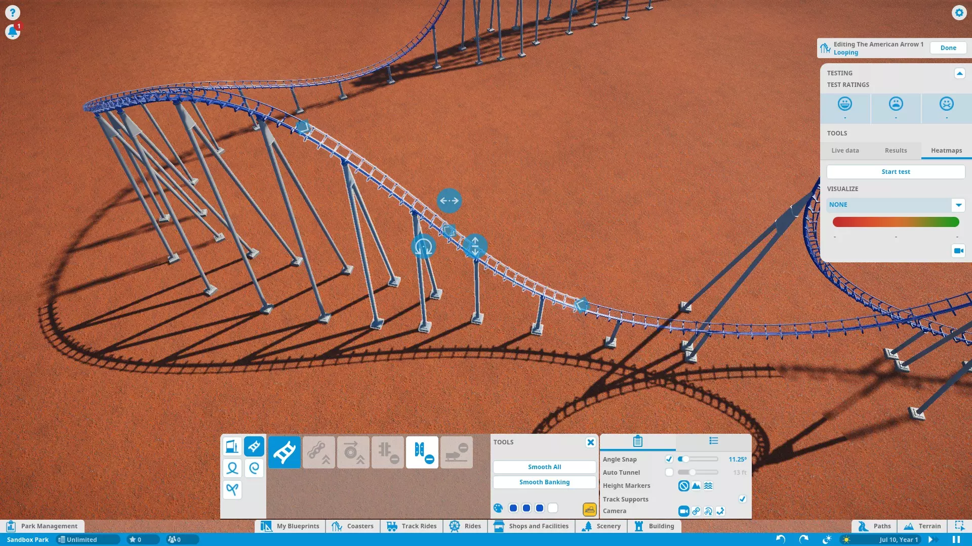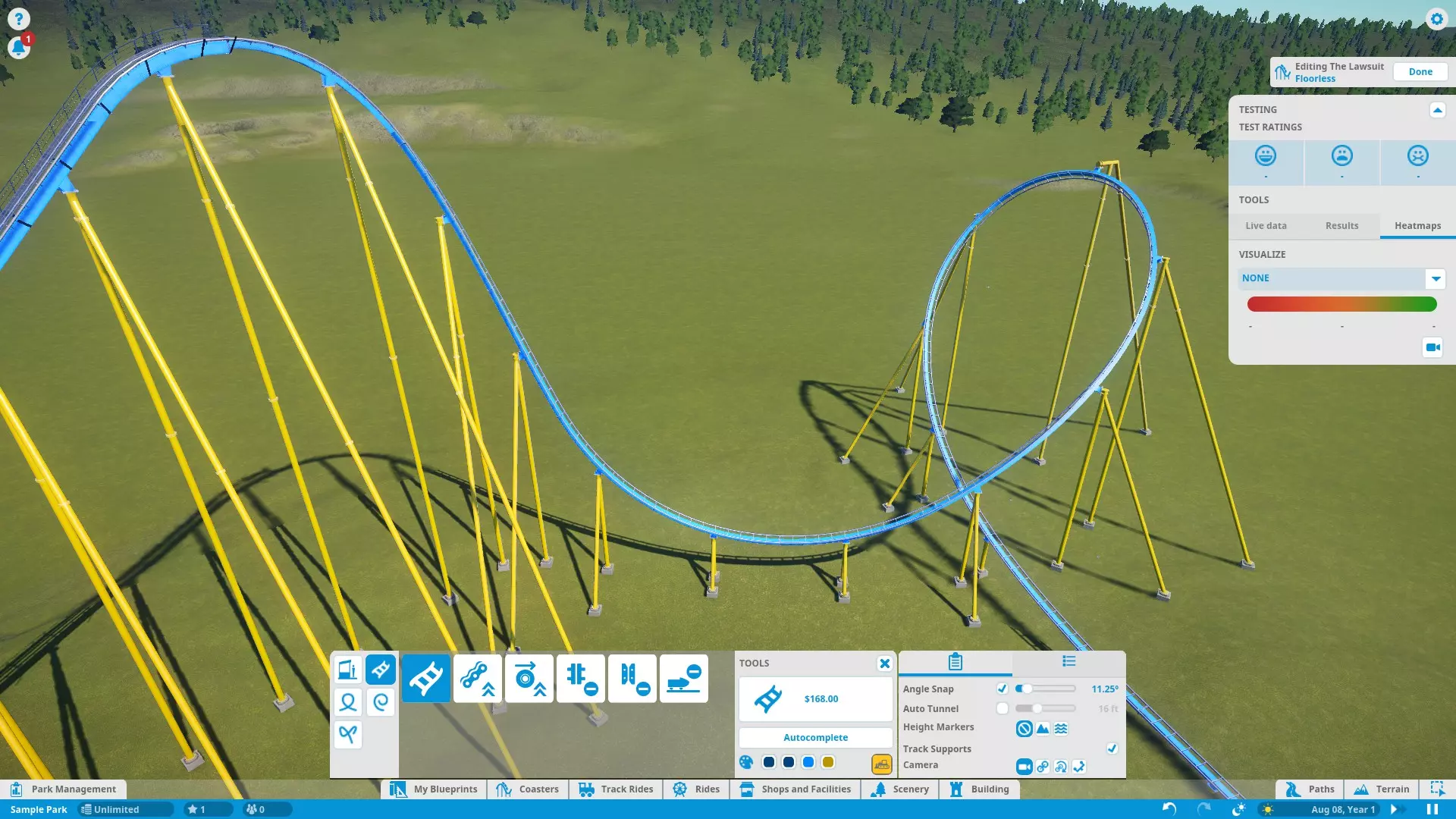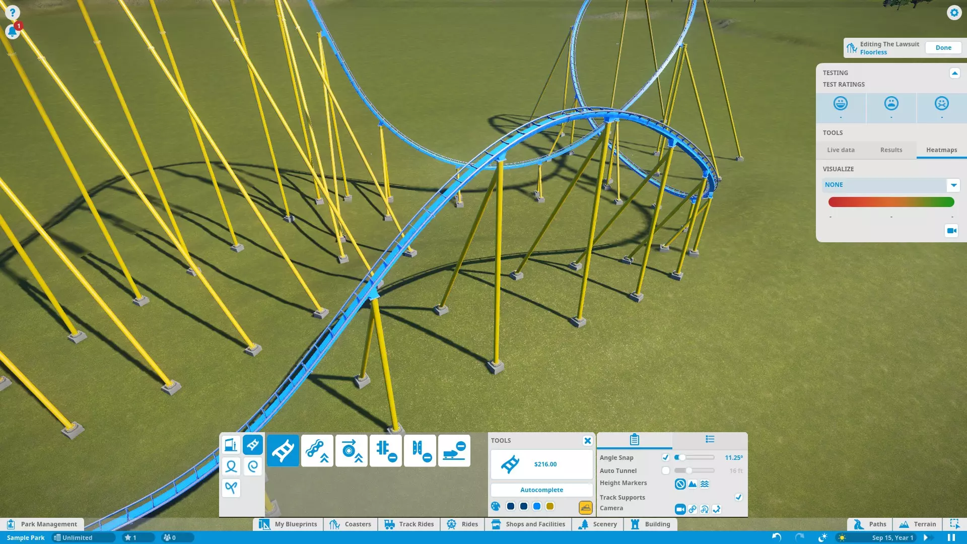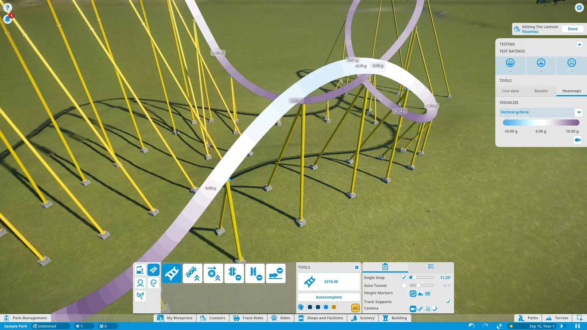 Here's a rundown of the labeled parts of the screenshot above: TRACK CATEGORIESAll of the track parts and pieces fall into one of the five categories: Stations (choosing the entrance/exit sides) Utilities (standard track, lift/launch mechanisms, and brakes) Loops (predefined vertical loops and loop variations) Rolls (predefined twists and other non-loop inversions) Non-Inverting (predefined track segments that do not bank more than 90 degrees)NOTE: Loops and Rolls will not appear if the track type you're working with does not allow inversions. TRACK PIECESShows all the available track pieces for a given category. All the various pieces outside of "Utilities" don't really need individual explanation. Utility pieces are explained in their respective sections later in this guide. EDITING TOOLSButtons that assist in track building: Build Button - Shows the type of track piece you're building and its cost. Click to build the previewed track piece. Delete Button - Yellow bulldozer button in the lower-right corner. Click to remove the currently selected track segment from your existing track. Autocomplete - Attempts to connect the track back to the station (or fill in a gap between existing track segments) using standard track. Be careful when using this tool! Autocomplete attempts to find the simplest route, not necessarily the best. Also, note that autocomplete will not consider modifying the terrain to find a solution. If you're building an underground tunnel and try to autocomplete the track, it will fail. Color Swatches - Allow you to choose the colors of the track piece you are currently editing. See "Ride Customization" for recoloring the entire coaster. EDITING/TRACK OPTIONSThis panel features 2 tabs each with options to fine-tune editing and track pieces. In the 'Settings' tab, you have: Angle Snap - Locks the track editing controls to specific angles. Check the box to turn angle snap on for simpler and more consistent building. Uncheck the box to turn angle snap off for complete control and precision. Auto Tunnel - Automatically digs a tunnel when building a track into the terrain. Use the slider to set the tunnel width. NOTE: Occasionally, if you leave this option on when building close to the ground or water (but not into/under it), the game may tell you that the track piece is "obstructed" even though it isn't. Try turning off auto-tunnel to fix this. Height Markers - Markers along the track that inform you of the track's elevation either above the ground or sea level, depending on which option you choose. You can turn them off altogether as well. Track Supports - Turns track supports on or off. No, your coaster isn't going to fall apart if it doesn't have supports. They are purely aesthetic. Camera - Choose how the camera moves as you build, or if it moves at all. The 'Utility Settings' tab has options specific to track pieces in the 'Utilities' tab. I marked this one on the diagram because I will refer to it several times throughout the guide. Options like catwalks, chain/launch speed, brake settings, etc. are found here. EDITING CONTROLSAllow you to modify the shape of a track piece before building it. Simply left-click one of circular buttons and drag in the appropriate direction to modify the track. Here are the control functions, starting from the top and moving clockwise: Bank (twist) Left/Right Slope Up/Down Lengthen/Shorten Track Piece Curve Left/RightWhen building a predefined track piece you are given a different set of controls: Resize Larger/Smaller Angle Left/Right (relative to the last placed track piece)You can also select existing track sections (usually a selection of two or more track segments) and adjust their shape/position using yet another set of controls: Move Left/Right Raise/Lower Bank Left/Right (not applicable to predefined pieces) Resize Larger/Smaller (predefined pieces only) Rotate Left/Right (predefined pieces only) TESTING PANELGives you all the stats on your coaster as you are editing. Press the "Start Test" button to load up test dummies and take them for a spin! The test will repeat until you stop it with the "Stop Test" button or leave the editor. At the top of the test panel are the EFN ratings. The train must complete a full circuit before these stats can be determined. Any time you edit the track, the results are cleared and have to be recalculated. Under the EFN ratings are 3 tabs: Live Data - Displays data as the test train travels around the track. Results - Displays stats after the test train has completed a full course. Heatmaps - Takes live data and uses it to create an overlay on the track so you can see how the data changes over the course of the ride. Useful for finding sections of your coaster that may need improvement. As of Update 1.3, you now have an option to choose between "Live Data" and "Previous Run Data". "Live Data" draws the heatmap during a test in progress and clears the heatmap at the start of each test. "Previous Run Data" creates/updates the heatmap at the end of each test. Finally, in the Testing Panel you have a ride camera. This lets you hop onboard and experience your own creation! From a editing perspective, the ride cam can help test for rough spots in the track and test trigger timing (discussed later) to make sure riders get the experience you want them to have. And, of course, it's sometimes just fun to ride what you build! Just be careful if you're the type who gets queasy easily. The simulation may suddely become way too real way too fast. NOTE: Test coasters will crash if the track isn't complete. In an open and operational park, the derailed test trains may plow through your crowds of innocent guests! The guests don't seem to mind this though and actually celebrate once they get up off the ground. Living in an E-rated game must be very pleasant... Coaster Editing 2: Building and Editing Tracks Now that you know what everything does, let's talk about how to make tracks! Laying Down and Removing Tracks