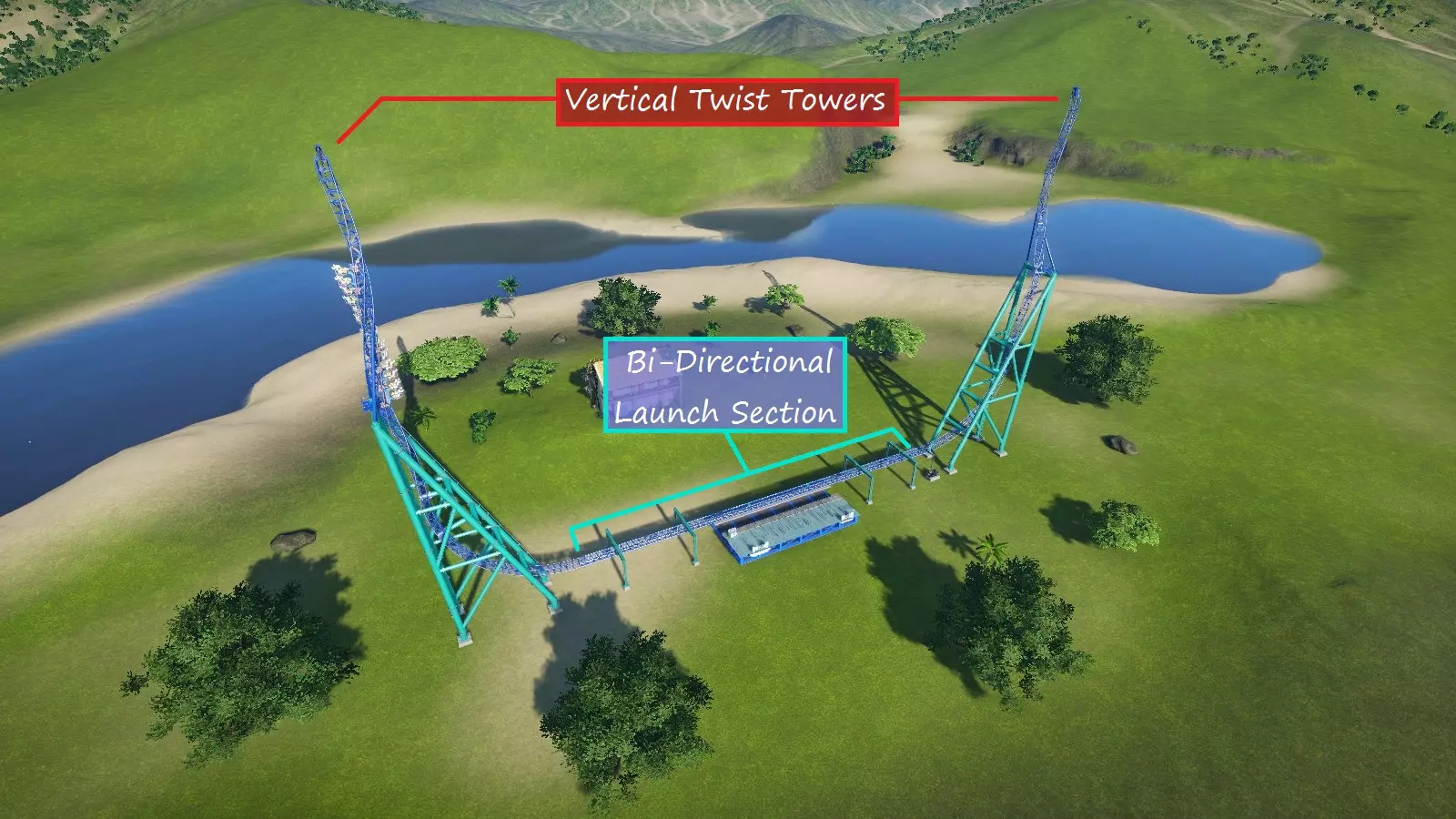 STATS: - EFN Ratings: E = 7.43, F = 4.84, N = 1.80 - Max. G-forces: Positive = +5.4Gs, Negative = -1.45Gs, Lateral = 0.5Gs - Max. Speed: 120mph/193kmh - Biggest Drop: 427ft/130m - Airtime Count: 3 (total duration 5.4 seconds) Layout Features The launch section holds the train for 3 seconds (adjustable in-game) and then very rapidly accelerates the train to 120mph/193kmh. The launch section is followed by a vertical hill (aka top hat) that soars 444ft/135m above the ground. Near the top of the hill, the track twists 90 degrees to the right (in this case; the left works too). The train crests the hill very slowly, pulling airtime or near-airtime in the process. After the crest, the track twists 90 degrees the right again and heads straight back down 423ft/129m. After the vertical drop, a huge airtime hill follows. At the crest, the train is still blazing down the track at roughly 85mph/137kmh. After the crest, magnetic brakes (functionally the same as friction brakes) slow the train down to sanity, which on this coaster is 20mph/32kmh. From there the train makes a u-turn back into the station. Excitement should be really high (6+ with an average around 10) throughout the ride. The ratings will be lower at the crest of the vertical hill and after the brake section. The part after the brake section can have a major impact on EFN ratings, so be careful not to make it too long/slow. Despite the massive speed and height figures, the ride experience is fairly short. From launch to brake run (which is considered to be the "actual" ride) is usually going to be well under 30 seconds. On this coaster it's about 23 seconds. The track is laid out in long segments. Keeping G-force under control when going over 100mph/160kmh requires turns, hills, and the transitions into/out of them to be very large. The trainsition into the vertical hill consists of four 70ft/21.3m segments, each one increasing the slope angle by 22.5 degrees. There are no block brakes. The game allows you to build them, but you can't set up multiple trains on this coaster type. Even if you could, if a block brake had to bring one of these trains to complete stop from 80mph/130kmh, riders' souls would briefly run ahead of their bodies. Not to mention the lawsuits that would filed against you from hospitalized riders... NOTE: Zenith was added in Update 1.4, a good while after the sample coaster above was made. Zenith has specially-designed pieces for creating a more realistic top hat element. While current strata coasters follow the same general layout, feel free to experiment with the layout and add your own flair to the ride. Can you design a layout with multiple airtime hills? Can you shorten the post-braking section of the ride. Also note that the Sprint 500 is not always used as a strata coaster. It may also follow a large-scale hyper/giga coaster layout with a launch section in place of the traditional lift hill. RANDOM FUN FACT In real life, strata coaster trains occasionally don't make it over the vertical hill and rollback! They're designed to do this though and riders usually get a re-launch. Rollbacks don't happen in this game. Unless, of course, you just build the hill in such a way that the train couldn't possibly make it over, in which case the test dummies only get a 1/2 ride and rate your coaster accordingly. Special Layouts 3: Bi-Directional Coasters (WiP) Most coasters aren't designed to roll back. These coaster types, however, do just that! IMPORTANT NOTE: The following track types CANNOT function as full-circuit coasters! Attempting to use them as such will result in the coaster passing the station instead of stopping and/or getting stranded somewhere along the track. Boomerang (Trident, Bolt)Boomerang coasters consist of two lift hills: a cable lift behind the station and a chain lift at the opposite end of the track. The coaster reverses out of the station and up the first cable lift. The train then drops back down the hill and rolls through the station. Typically, a cobra roll (or similar inversion) and a small hill or loop follows. The train climbs the next lift hill and then reverses back down the track. The train passes back through the station again and partially rolls back up the first hill before finally rolling back into the station. Here's a typical layout: