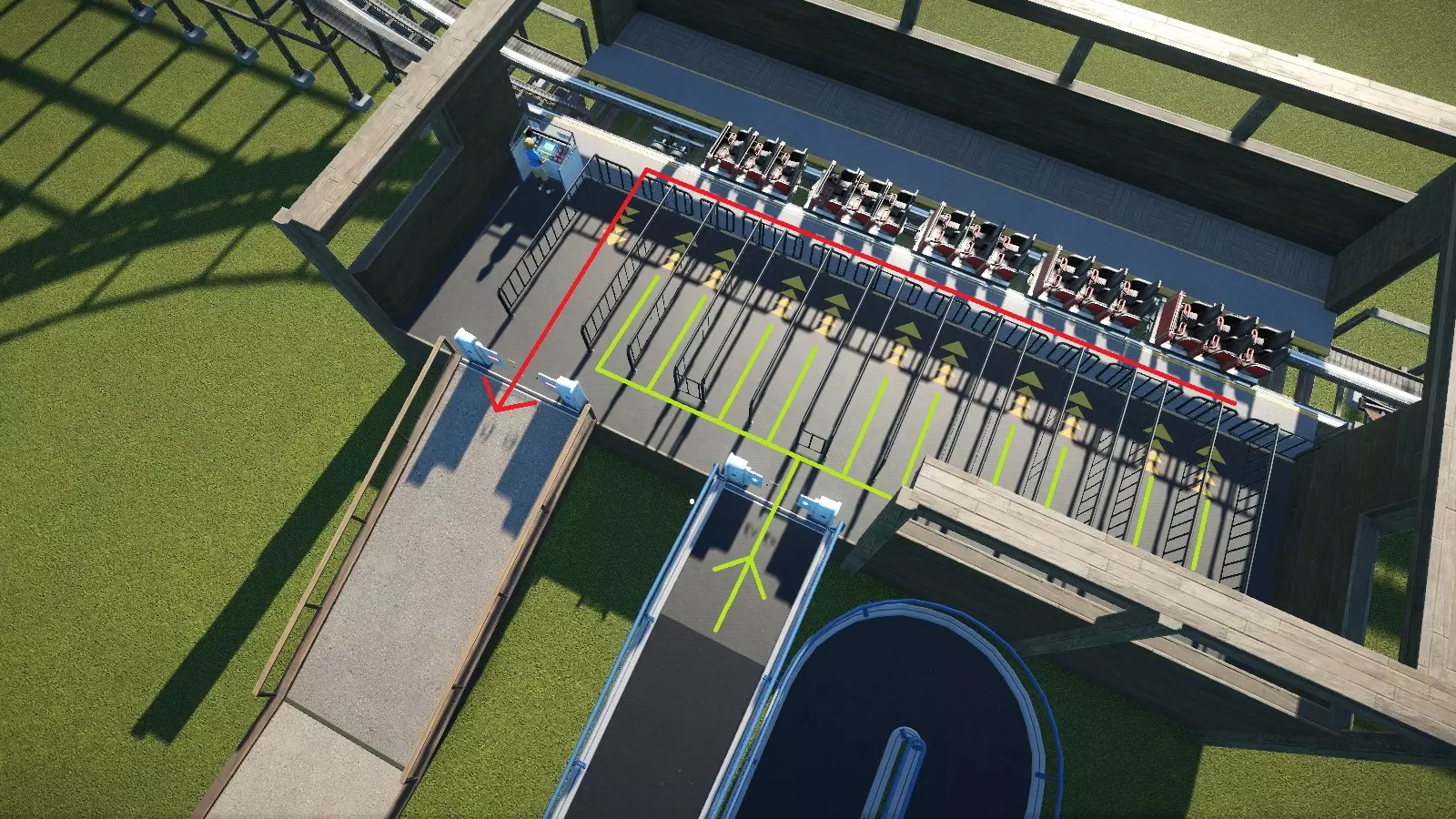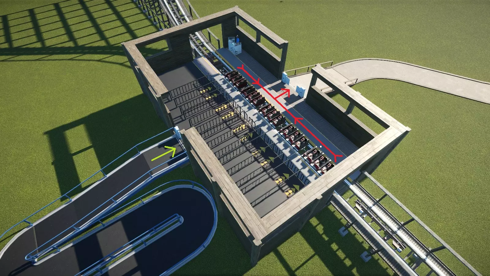 每个过山车都始于供游客上下车的车站。建造车站时,需要考虑三个要素:位置、车站长度以及出入口。 位置 为车站寻找合适的位置,可能会让你陷入类似“写作障碍”的过山车建造困境。虽然车站放置没有明确的规则,但以下指南将帮助你选择一个好的车站位置(请原谅这蹩脚的押韵,我实在忍不住……) 选择一个可通过路径到达的地点。理想情况下,你希望选择一个相对平坦且没有轨道、 scenery 和其他潜在障碍物的区域。否则,你可能需要建造一条看起来怪异的排队和/或出口路径来避开障碍物并返回主路径。尽量将车站建在主路径附近。游客可能不愿意徒步半英里穿过树林去乘坐你的过山车。如果必须修建半英里的路径,可以考虑沿途添加其他游乐设施、商店和服务设施,以此吸引游客前往。 大多数情况下,车站应尽量靠近地面。将车站抬高是常见做法,但过高的话就需要建造大量台阶,这对游客来说也缺乏吸引力。此外,根据轨道布局,轨道终点可能是上坡段,列车能否爬上该坡取决于其速度。请记住,在 ride 末端设置链式提升或其他辅助提升轨道(驱动轮可能除外)并不常见,通常被认为是一种欠佳/俗气的设计元素。 站台长度 默认情况下,站台长度足以容纳 1 列默认尺寸的列车。你可以扩展站台以容纳更长的列车。 如果列车长度不可调节(例如旋转过山车),那么更长的站台将允许在站台内停放更多列车。请注意,在这种情况下,只有最前面的列车会进行装载和卸载。后面的列车在到达站台前端之前不会进行装载和卸载。 最佳做法是在开始建造前确定每列车的车厢数量,并将列车设置为该尺寸。这样你就可以设计过山车以适配更大/更小的列车尺寸(有关列车尺寸的更多信息,请参见【 ride operations 】)。 入口和出口 建造车站时,你可以选择轨道两侧的入口和出口位置。理想情况下,你希望合理安排出入口以提供最快的乘客上下车时间。尽管有理由这样认为,但即使出入口位于相对的两侧,游客也不会同时进出设施。使用相对两侧的一个优点是游客可以直接走向出口。当使用同一侧时,游客必须走到车站前方才能到达出口闸机。关于车站侧面出入口的实际位置,其摆放会影响上下车效率。 如果出入口在同一侧,应将出口放置在靠近前方的位置(因为这是出口线路所在处),入口则放在出口后方一小段距离(位于入口线路前方)。绿色和红色线条分别显示了乘客上下车时的行走路径。