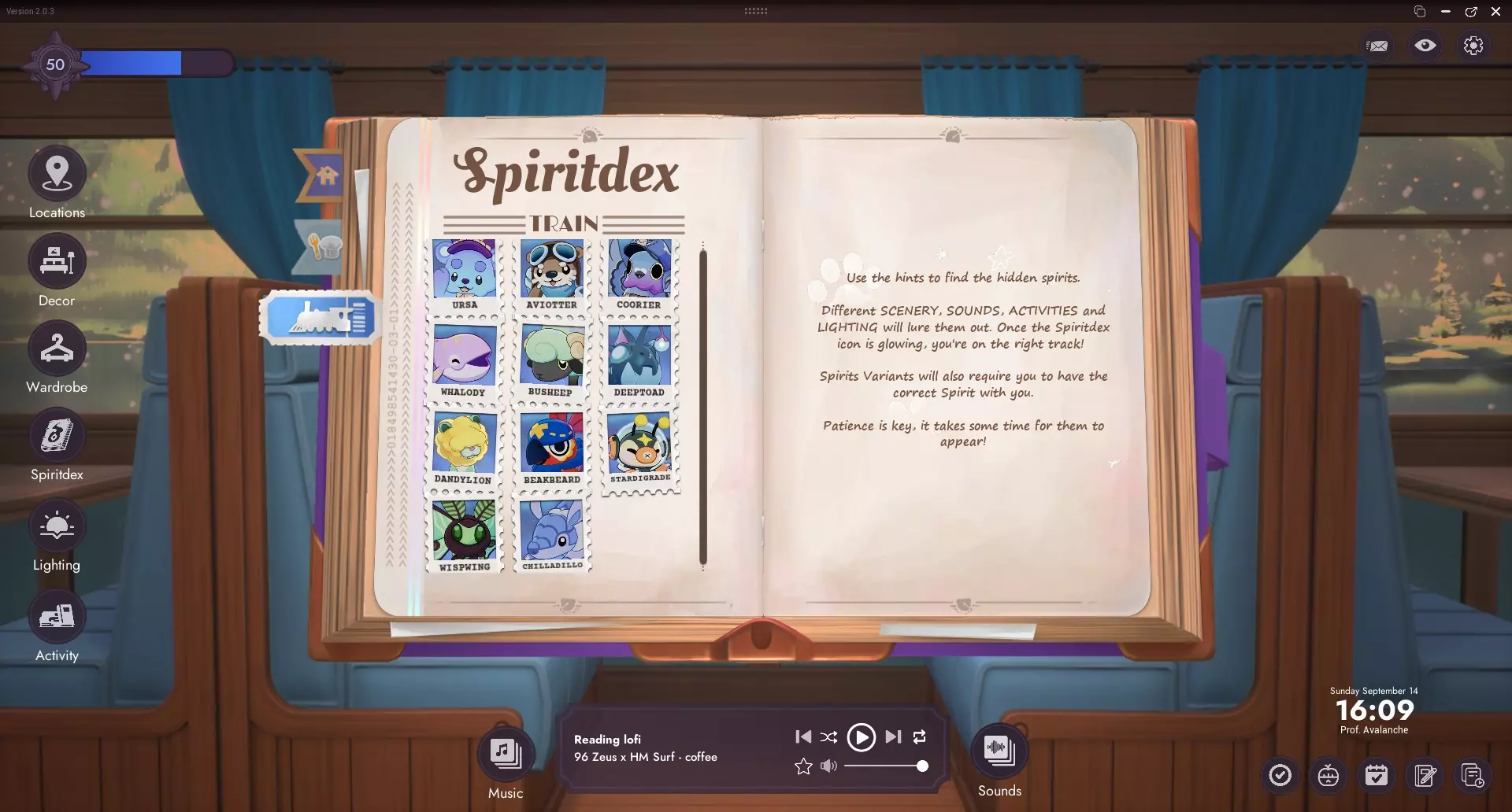 Genialer Spiritograph Wenn sie Stufe 50 erreichen, sind sie so etwas wie eine lebende Enzyklopädie für alles, was mit Geistern zu tun hat. Geister 24 von 34 Errungenschaften in dieser Kategorie. Diese Kategorie besteht aus folgenden 24 Errungenschaften: Goopii entdeckt Dustbunny entdeckt Hedgelog entdeckt Earlybirb entdeckt Chapterpillar entdeckt Arachknit entdeckt Moonpaw entdeckt Drizzlefin entdeckt Kettlebrew entdeckt Trashnuki entdeckt Bulbee entdeckt Sunquill entdeckt Vootodoo entdeckt Inkster entdeckt Bobapole entdeckt Waxolotl entdeckt Hamstereo entdeckt APE-bit entdeckt Flutterfrog entdeckt Hexwing entdeckt Twintail entdeckt Bloomscale entdeckt Catsudon entdeckt 🏖️ Neuer Geist (Spielupdate: Sommer 2025 Juli) Deermuff entdeckt ☃️Neuer Geist (Spielupdate: Winter 2025 November) Schalte jede Errungenschaft frei, indem du den entsprechenden Geist entdeckst. 引用自 Prof. Avalanche (03/2025 / @Spielversion 1.8.0):Der DLC „Cozy Kitchen“ fügt 12 neue Geistbegleiter hinzu: 3 Geister sind komplett neu, die restlichen 9 sind Variationen bestehender Geister aus dem Basisspiel. Nicht ganz wie Skins, eher wie coole Cousins der Basisgeister. „Cozy Kitchen“ DLC Geister haben keine Errungenschaften.引用自 Prof. Avalanche (09/2025 / @Spielversion 2.0.2):Der DLC „All Aboard“ fügt +11 neue Geistbegleiter hinzu, sie haben keine Errungenschaften. Weitere Informationen zur Entdeckung einzelner Geister findest du im untenstehenden Abschnitt des Guides. Wie findet man Geister? Es gibt insgesamt 26 Geister (ohne DLC, siehe Fußnote¹ unten) Der Katzengeist "Lenny" ist automatisch freigeschaltet, die anderen müssen noch gefunden werden. Ein Geist kann nur dann entdeckt werden, wenn sein Hinweis im Spiritdex freigeschaltet ist. Jeden Hinweis erhält man mit dem Erreichen eines bestimmten Spiritograph-Ranges: Level 3 (Hinweise für Earlybirb & Hedgelog) Level 5 (Hinweise für Arachknit & Chapterpillar) Level 7 (Hinweis für Moonpaw) Level 8 (Hinweis für Drizzlefin) Level 9 (Hinweis für Trashnuki) Level 10 (Hinweis für Kettlebrew) Level 11 (Hinweis für Sunquill) Level 12 (Hinweis für Bulbee) Level 13 (Hinweis für Vootodoo) Level 14 (Hinweis für Inkster) Level 15 (Hinweis für Bobapole) Level 16 (Hinweis für Waxolotl) Level 17 (Hinweis für Hamstereo) Level 18 (Hinweis für APE-bit) Level 19 (Hinweis für Flutterfrog) Level 20 (Hinweis für Hexwing) Level 21 (Hinweis für Twintail) Level 22 (Hinweis für Bloomscale) ¹Fußnote: +12 neue Geistbegleiter mit dem DLC „Cozy Kitchen“ und +11 neue Geistbegleiter mit dem DLC „All Aboard“, sie haben keine Errungenschaften. Außerdem hat ein Geistbegleiter, der nicht zu den DLCs gehört (Among Us Update), keine Errungenschaft. Wie können die Geister gefunden werden? Um die Geister zu finden, muss man: einige Einstellungen ändern (bestimmte Beleuchtung, Aktivitäten und Töne) 🍜 Für DLC „Cozy Kitchen“: bei einigen Küchengeistern muss ein weiterer ganz bestimmter Geistbegleiter in der Nähe sein, der über die Kleiderschrank-Einstellung aktiviert werden kann. 🚅 Für DLC „All Aboard“: die Kulisse (die sichtbare Landschaft aus dem Fenster) ist wichtig. sobald ein Ping-Ton ertönt und der Spiritdex eine kreisende Animation anzeigt (bedeutet, dass die Einstellungen richtig sind), alles so wie es ist lassen und etwas Geduld haben (das Spiel einfach eine Weile laufen lassen) auf das Spiritdex klicken, sobald es einen roten Punkt anzeigt (wichtig!) Die Hinweise im Spiritdex können dir helfen, die versteckten Geister zu finden. Wenn die Hinweise dir nicht helfen, mach dir keine Sorgen. Ich werde alle Lösungen in einem spoilerfreundlichen Format bereitstellen. Um die Lösungen zu sehen, klicke auf den entsprechenden schwarzen Kasten wie diesen: Ich bin hier – du bist hier – Schnabeltier. 🦉 Viel Spaß auf der Suche nach deinem Lieblingsgeist! Lenny Goopii Hinweis: Mein Schreibtisch fühlt sich in letzter Zeit seltsam aufgeräumt an, vielleicht fehlen mir sogar ein paar Dinge. Lösung: Aktivität: Schreibtisch. Dust Bunny Hinweis: Ich habe nachts seltsame Geräusche unter meinem Bett gehört, ich frage mich, was das sein könnte. Lösung: Beleuchtung: Nachts, Aktivität: Bett. Earlybirb Hinweis: An den letzten Morgen wurde ich von einem seltsamen zwitschernden Geräusch geweckt. Lösung: Beleuchtung: Morgens, Aktivität: Bett, Töne: Vogelgezwitscher. Hedgelog Hinweis: In meinem Zimmer ist es in letzter Zeit besonders heiß. Ich frage mich, ob etwas mit meinem Kamin nicht stimmt...? Lösung: Aktivität: Kamin, Töne: Gemütlicher Kamin. Chapterpillar Hinweis: Immer, wenn ich lese, spüre ich die Anwesenheit von etwas über meiner Schulter. Lösung: Aktivität: Erkerfenster + Lesen. Arachknit Hinweis: Wenn das Licht schwächer wird, scheine ich immer wieder auf lose Strickfäden zu treten, die überall verstreut liegen. Lösung 1: Aktivität: Erkerfenster + Stricken. Lösung 2: Aktivität: Kamin + Stricken. Moonpaw Hinweis: In windigen Nächten hört es sich fast so an, als würde etwas den Mond anheulen. Lösung: Beleuchtung: Nachts, Töne: Beruhigender Wind. Drizzlefin Hinweis: Ich hörte ein altes Märchen von einem weinenden Geist... "Wenn der Himmel weint und die Sterne zum Spielen herauskommen, kann es sein, dass du sie inmitten der Tropfen schwimmen siehst." Lösung: Beleuchtung: Nachts, Aktivität: Erkerfenster, Töne: Sanfter Regen. Trashnuki Hinweis: Dieser hungrige Geist kann durch das Geräusch des Kochens um die Mittagszeit herausgelockt werden. Lösung: Beleuchtung: Nachmittag, Töne: Schmackhaftes Brutzeln. Kettlebrew Hinweis: Es gibt Gerüchte über einen Geist, der den Tag mit einer Tasse Tee am Feuer begrüßt. Lösung: Beleuchtung: Morgens, Aktivität: Kamin. Sunquill Hinweis: Während die Sonne untergeht, erklingt ein bezauberndes Lied aus dem Wald. Lösung: Beleuchtung: Abends, Töne: Nächtlicher Wald. Bulbee Hinweis: Während eines Gewitters habe ich festgestellt, dass die Lichter in selt