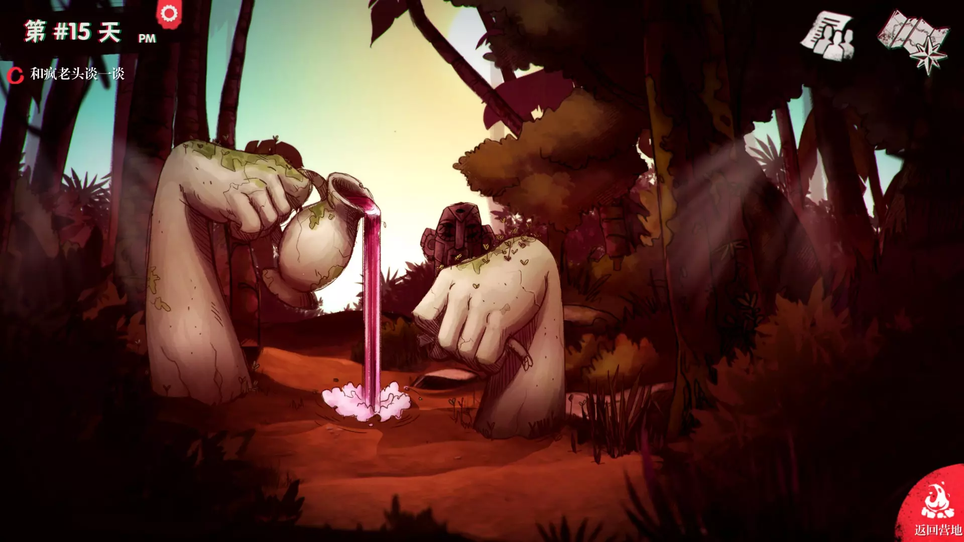 比较特殊的场景:(以下场景均要通过隐秘判定,失败都会被攻击增加受伤) 手指泉:看人品喝水,有可能全回复,有可能全增加负面效果,我曾经喝死过人 沙发上的骷髅:可以坐下来休息,增加抑郁减少疲惫,也算是不错的 海边:可以钓鱼的地方是最好的,能获得额外的食物,另外还可以潜水,增加疲惫降低抑郁 木筏:探索海岸,降低疲惫和抑郁。冲浪,减抑郁还能获得撞死的鱼。巨大的手掌:坐上去休息,受伤的同时降低疲惫和抑郁 花圃:睡觉可以增加饥饿减少受伤 衣服架:可以换上衣服降低抑郁 狼嚎的池塘:进去洗澡增加饥饿减少伤害 ———————————————————————————————————— 天平:拿走武器,+20战斗值。拿走石头,获得一些石头。 X轮:最高处,什么都没有。最低处,获得一些物资和道具。左边和右边,获得一件道具。稻草人:拿走项链,所有负面效果降低,体质+10;拿走衣服,被攻击时受伤概率增加。 老兵:搜索后战斗属性+10,可多次触发。 关于那些要求献祭的场所,请全部无视。这些所谓的神明无法提供任何帮助,尽情拆掉献祭台,杀掉神秘野兽,拿走十字架吧。 拥有钓鱼竿、狩猎弓、锅、熏制架后,食物已不成问题。不过按照当前进程,8位队员的生病和受伤程度基本都在40%左右甚至更高,医疗帐篷也应该研发完毕可以建造了。等级较高的队员也可以外出探索,能发掘出许多药品、食物和属性增强物品。药品留给那些生命值极低的角色,药品主要是用来应急的,不要看到生命值稍微降低就急忙使用。万一晚上触发剧情导致多名角色同时陷入抑郁或生病,而你没有药品的话,很可能会导致游戏崩盘。 探索到岛屿右侧时,怪物强度会开始提升,攻击通常会造成20%~40%的伤害。不要轻易让那些隐秘属性低的角色前往右侧。此外,随着天数的增加,原本只出现普通怪物的左侧区域也会出现大型怪物。飞机——书柜——森林,这3个是按顺序无法再进行操作的地方(森林还可以探索,只是没有意义了)。飞机没什么,主要是书柜和森林释放了两个劳动力,萝莉和大妈。大妈还好说,可以安排去做饭;但萝莉的生活技能实在不行,而且初始体力不高,只好让她打杂半天休息半天了。 游戏的主线不是活下去,而是逃离岛屿。岛上会遇到一些古古怪怪的家伙,关于这些家伙的剧情我已经在评测里面谈过了。居住地设施网上有很详细介绍,在此不再多作叙述。