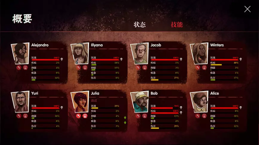 4.队友之间的好感度有用吗?可以都刷到100吗? 没什么大用处,顶多能完成个成就,想都刷到100是不可能的。想想看,你和父母、配偶、孩子之间都会有争吵矛盾,更何况是之前素不相识的人呢?连天堂和盐湖城都做不到的事,普通人就别奢望了。 5.特性到底是怎么回事?怎么刷出来? 初始会给2个特性,基本是随机的,但也有一定规律。比如男主很大几率带有增加友好度的特性,壮汉带有身体强壮但容易抑郁的特性,大妈带有厨师特性等。后面3个特性需要角色在火堆旁休息时刷出来,快的话30到40天就能刷出所有人的特性。如果出现负面特性,可以考虑读档,不过随机性比较大。 6.材料不够怎么办?自己建个伐木场去获取木材吧,最缺的永远是木头,其次是石头和绳子。木头可以在地图上的某些区域互动获取,石头和绳子在地图上给的比较少,需要自己慢慢收集。 7. 医疗帐篷里进了人却不治病是怎么回事? 医疗帐篷有3个格子,最外面的格子放置医生,里面一个格子用于治疗受伤的人,一个格子用于治疗生病的人,而且需要有药品。绷带和药品都可以通过工作台制作出来,但这些都是最终产品,原料草药和制作绷带的材料可以通过探索获得,草药还可以通过伐木场开采出来,这是一定要做的。一个草药能治疗3%的疾病,2个草药可以合成一个药品,最高大约能治疗20%~30%的疾病,非常划算。需要提醒的是,治疗效果与医生的医术和被治疗者的体质有关。 8. 地图上某些地图的红色选项是做什么的?只能进行一次的操作,选择该选项后将无法选择其他选项,例如海边的木筏,选择探路后就无法选择其他选项。 9.设施越用效果越差怎么回事? 很多设备有其侧重点和耐久度,在资源充足的情况下,务必修复设备,确保其耐久度不低于60%。 10.有没有简单的通关方法? 放最后说……其实有种取巧的方法,但我不打算在这里说明,想快速通关的玩家可以自行寻找相关信息。 数值 ALEJANDRO