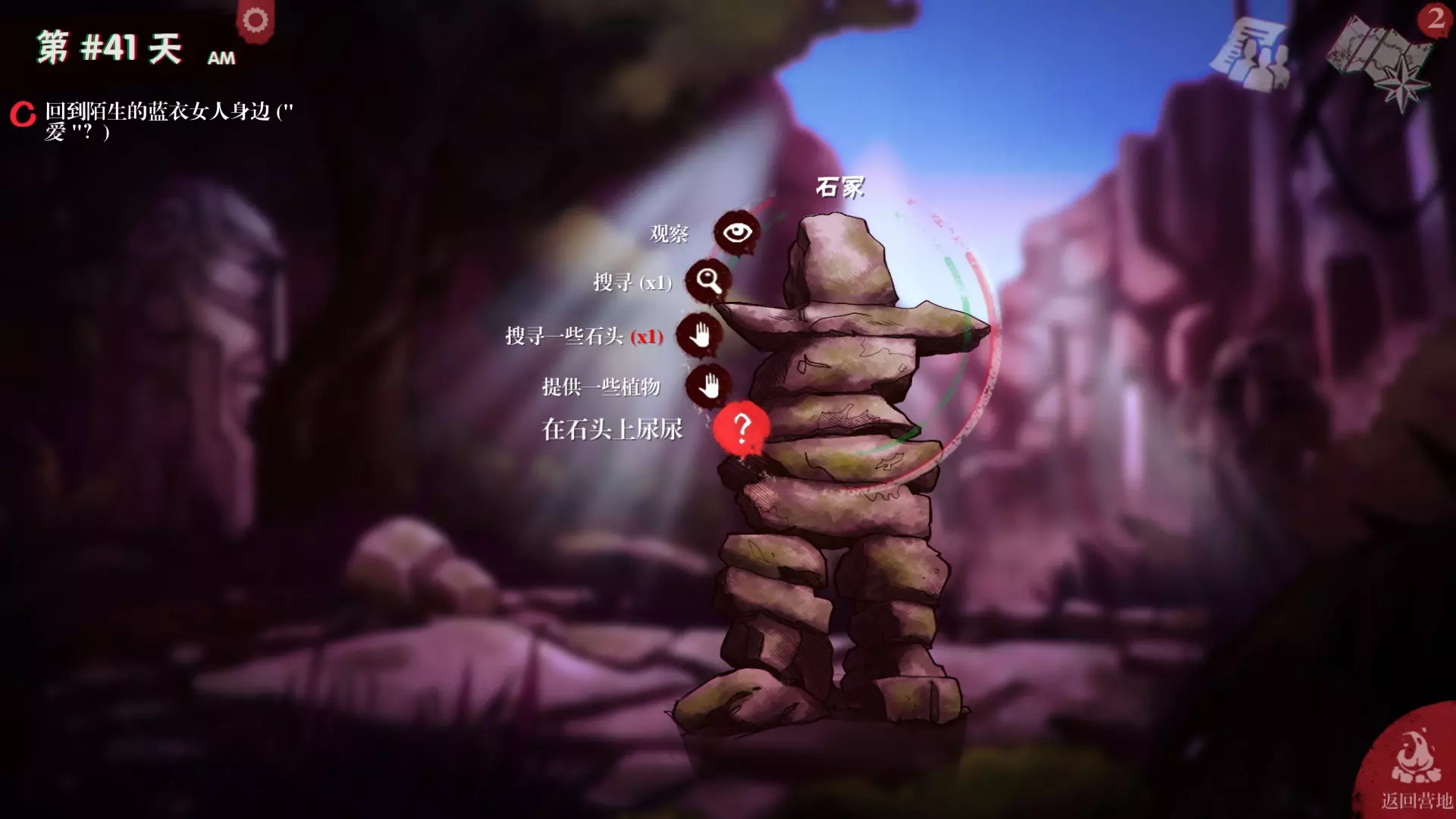 寒夜 没有火的夜晚是严酷的夜晚…… 过夜时不要生火,中后期再去解锁,或者直接前几天不生火然后读档即可。 火堆灭了还需要重建,很麻烦。