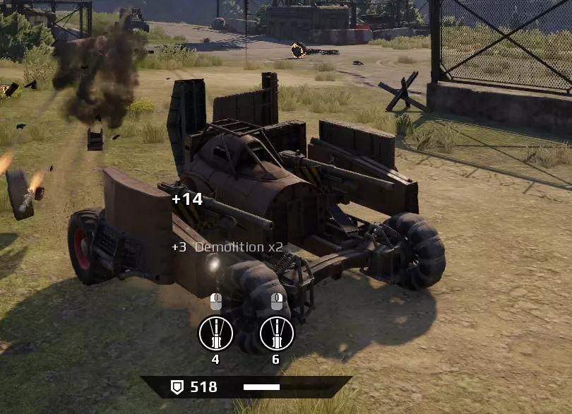 关于建造自定义载具的一些技巧:车轮、驾驶舱、武器的最佳位置。 驾驶舱、战力评分、耐久度 受到伤害时唯一重要的部件是驾驶舱。驾驶舱的耐久度决定了摧毁它需要多少生命值。当驾驶舱被摧毁时,整个载具会爆炸,你将退出战斗。为了保护驾驶舱,你必须在上面安装其他部件:车门、挡泥板等。只要这些防护部件还有耐久度,它们就会留在你的载具上。将一个部件安装到另一个部件上会使它依赖于后者。一旦第一个部件损坏,所安装的部件也会脱落。永远不要将武器和重型部件安装在脆弱部件(耐久度<40)的顶部。耐久度>80的部件是坚固的,>150的部件非常好,>400的部件对载具的生存至关重要。全方位防护