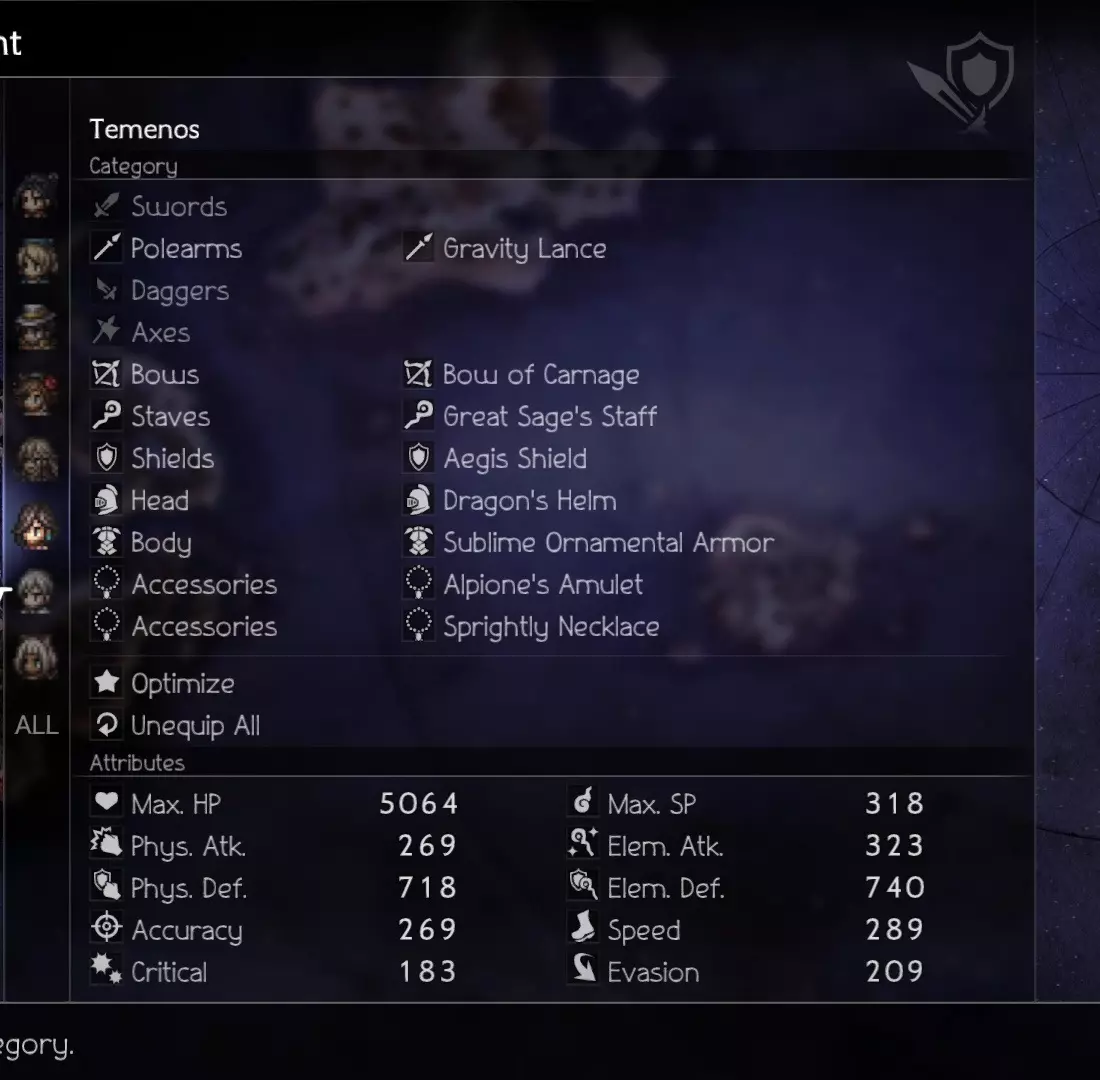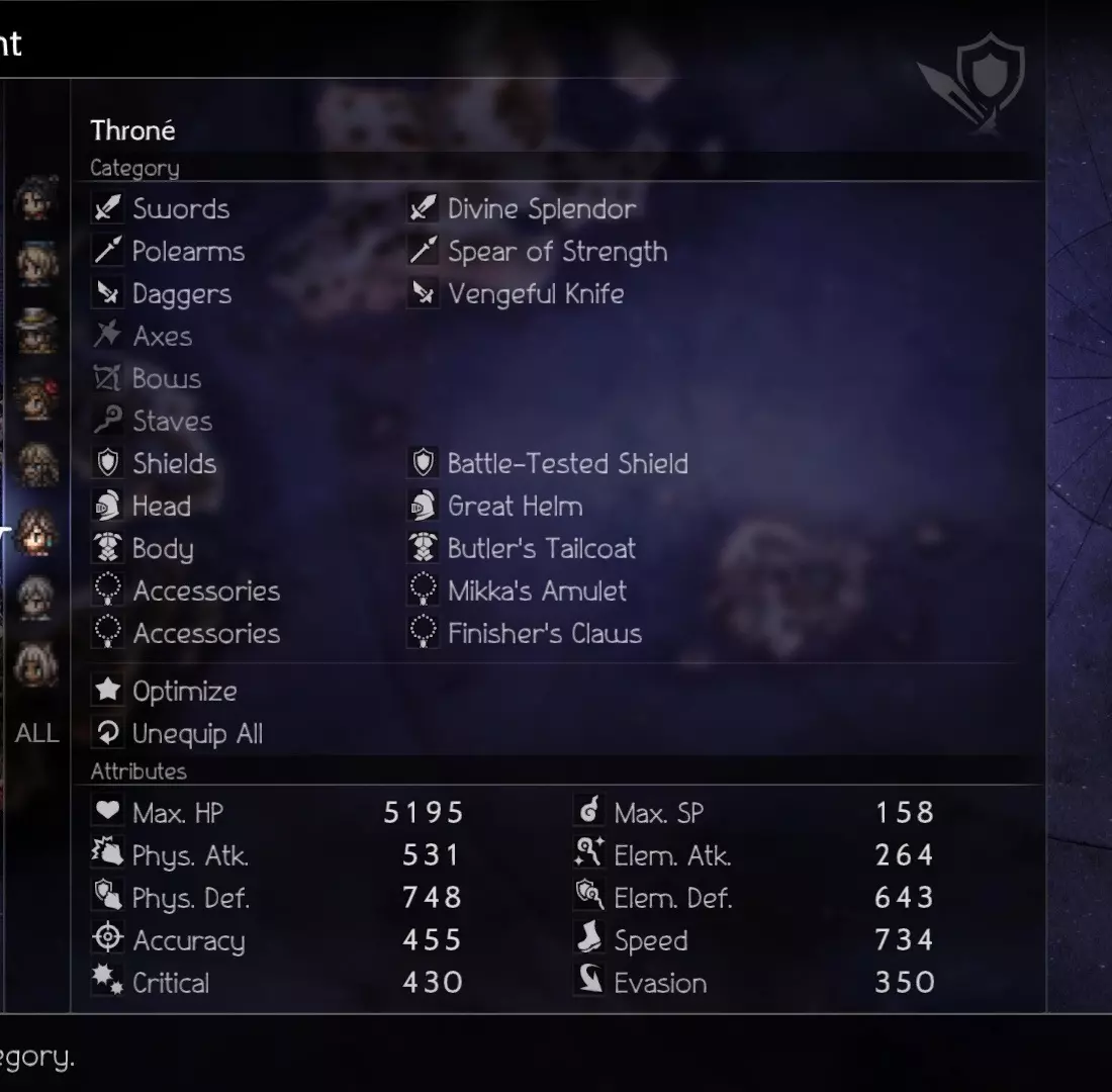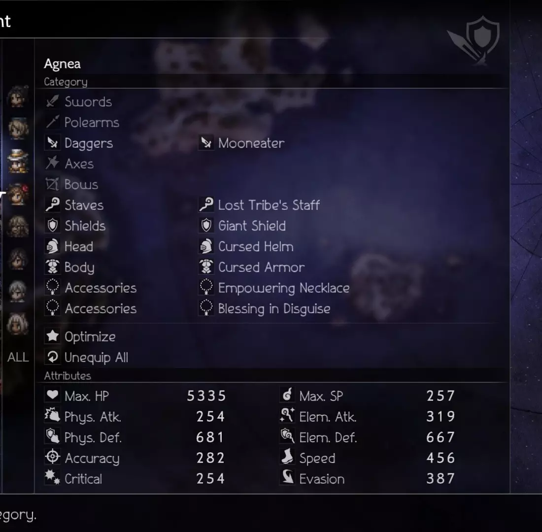 If you are having trouble destroying the souls surrounding the boss, you can combine Deep Analysis with Sealticge's Seduction to fully analyze all enemies during Phase 1. This will greatly enhance your AoE On The Hunt and help you clean up the trash faster to focus on the eye. Video & Explanation Phase 1 Hikari - Damage Castti - Sustain (Concoction) Partitio - Sustain/Damage Agnea - Buffs/Emergency HealsOverarching Strategy: Abuse Sealticge's Seduction to pummel everything with an AoE on the Hunt. First Turn (A Step Ahead): Castti - Medicinal Concoction - Pomegranate+Mighty+Strength+Diffusion Partitio - Debuff with Hired Help -> Ruffian Subsequent Turns: Castti - Medicinal Concoction - Pomegranate x2+(Rotate between Mighty/Warding/Weeds OR Grape if needed)+Strength+Diffusion Partitio - Hired Help -> Foreign Assassins to keep HP and SP topped up Agnea - Use Sealticge's Seduction and Aelfric's Blessing on Hikari and then spread Aelfric's Blessing around as needed. Mix in Latent Power+Sacred Shield when available but prioritize keeping Hikari at his strongest. Hikari - AoE On the Hunt or AoE Deep Analysis (if needed). Assist with breaks. NOTE: The boss' first move aside from summoning is to cast heat (HP damage over time). Unless your attacks match the first wave of souls' weaknesses (they share Axe and Wind as a weakness), do not attack them needlessly outside of Hikari's On the Hunt, or else they will counter-attack. Partitio can attack using Foreign Assassins freely after the first break because subsequent summons don't counterattack. (Boss Weakness: Dagger, Axe, Staff, Lightning, Light) Also, don't waste turns to heal with Agnea unless necessary because Hired Help -> Foreign Assassins' Energy Thief is more than enough for consistent full healing. Phase 2 Osvald - Sustain Throné - Damage Temenos- Buffs/Damage Ochette - Buffs/Breaker First Turn (A Step Ahead): Ochette and Temenos' initial goal is to pass around Jam and Buffs during this initiative turn. We want to set up Osvald with Dohter's Charity as early as possible because he will be doing what Castti did (by spamming AoE Jams) for Team 1... minus the OP concoctions. Subsequent Turns: Pass Aelfric's Blessing around especially to Throné once she uses up her Latent Powers. Refresh Dohter's Charity when necessary. Ochette - Break the 2 bottom body parts using Ancient Frogking II (Hunter Multi-Provoke) so that Throné can annihilate the parts faster with Aeber's Reckoning (the top part is only weak to elements but it will go down after a few repetitions of Aeber)Once the parts are down, the boss' shield points will go all the way down to 20. I suggest always prioritizing the break rather than aiming for the "best break timing". The boss adds some more shield points every turn and becomes stronger when alone so it's better to just keep it from attacking altogether. **IMPORTANT** Between the turn you destroy all the body parts and the next turn is a freebie. The boss' shield can't be reduced during this time (14:26 in the video) until the next turn arrives so use this free time to Summon Elderly Man and/or Merchant for their single-target dagger-breaking abilities. These 2 Summons, combined with Ochette's Multi-Provoke (Ocean Lizardking III), guarantees the boss will stay broken as much as possible. The great thing about Ocean Lizardking III is that it synergizes with Throné by providing a speed buff that primes Aeber's Reckoning for the break. (Boss Weakness: Spear, Dagger, Bow, ???) Though the boss does not revive body parts, keep in mind that Phase 2 can change weaknesses if the battle goes on for too long. I don't have data on those weaknesses so just keep topping up your team with AoE jams to fully unload on the boss every turn. Good luck! Ochette - Break and Debuff the boss with Summons. Temenos - Rotate between buffing Aelfric's Blessing and Hired Help -> Foreign Assassins Osvald - AoE Jam JAm jAM Throné - Aeber's Reckoning until the end
