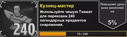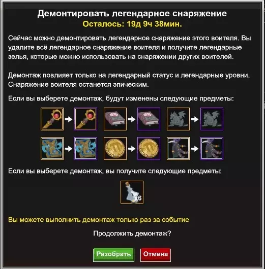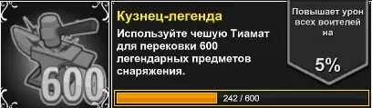 我们按以下步骤操作: 1. 拆解乌尔科里亚(点击黄色的“拆解”按钮),获得珍贵的6瓶传奇药水。 2. 打开背包,将药水使用在任意一个没有传奇装备的角色身上,且该角色不是“赛季”活动角色。通常这样的角色有五个。 3.可以看到“传奇装备”分类下的成就“Кузнец-мастер”(以及后续的“Кузнец-Легенда”)的计数器会增加宝贵的6点。使用瓶子的效果等同于在铁匠铺按下锻造按钮。