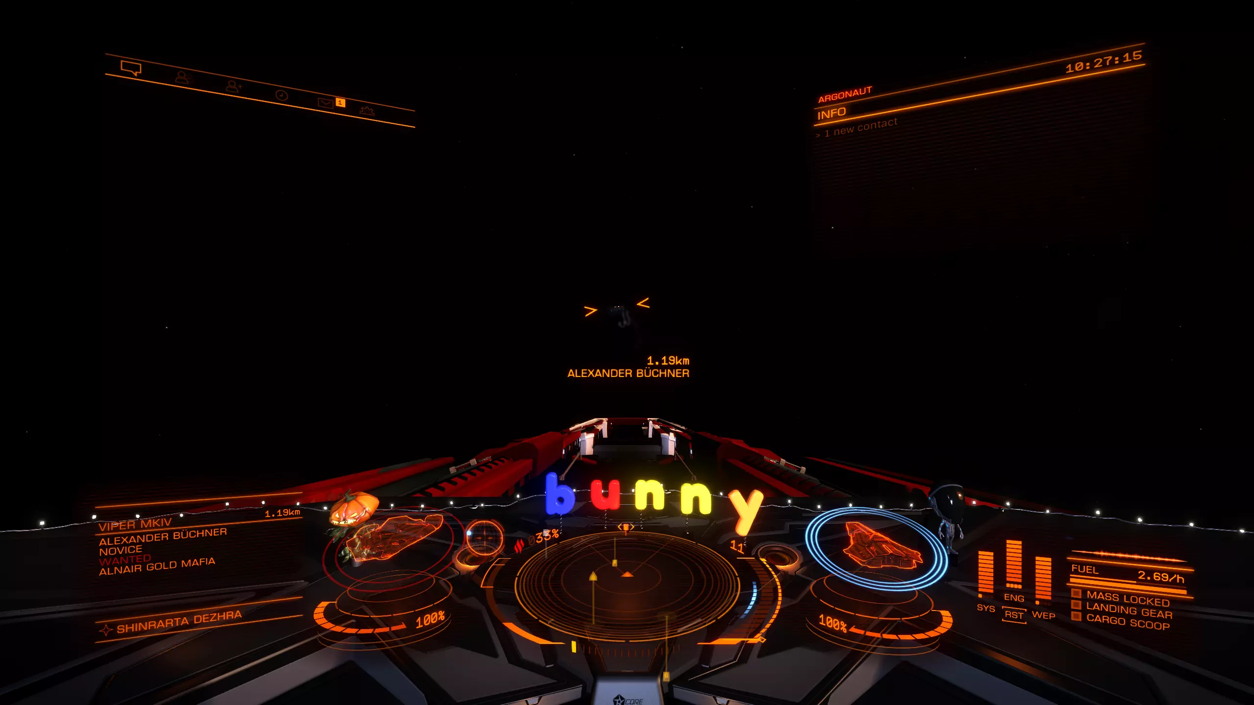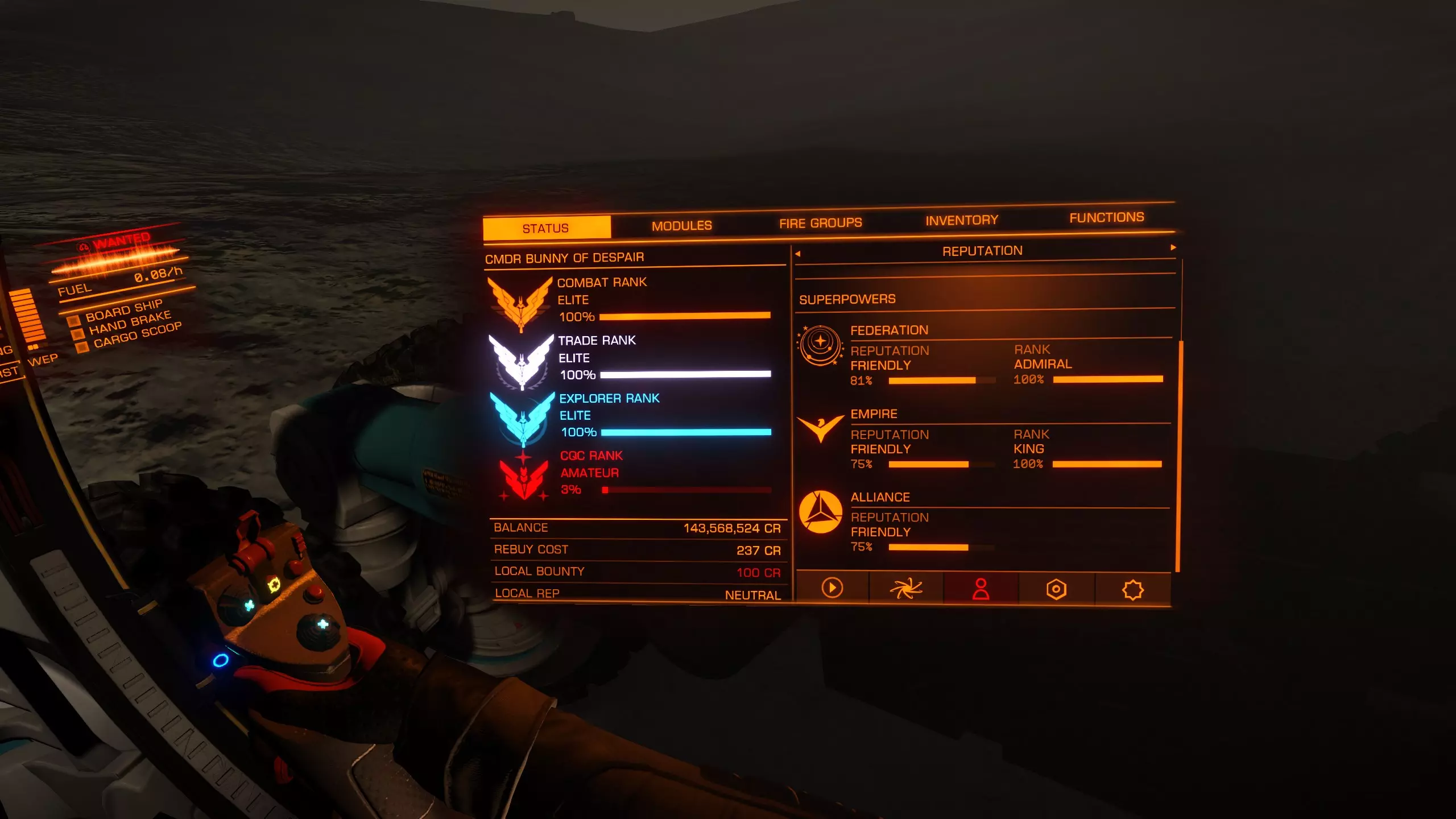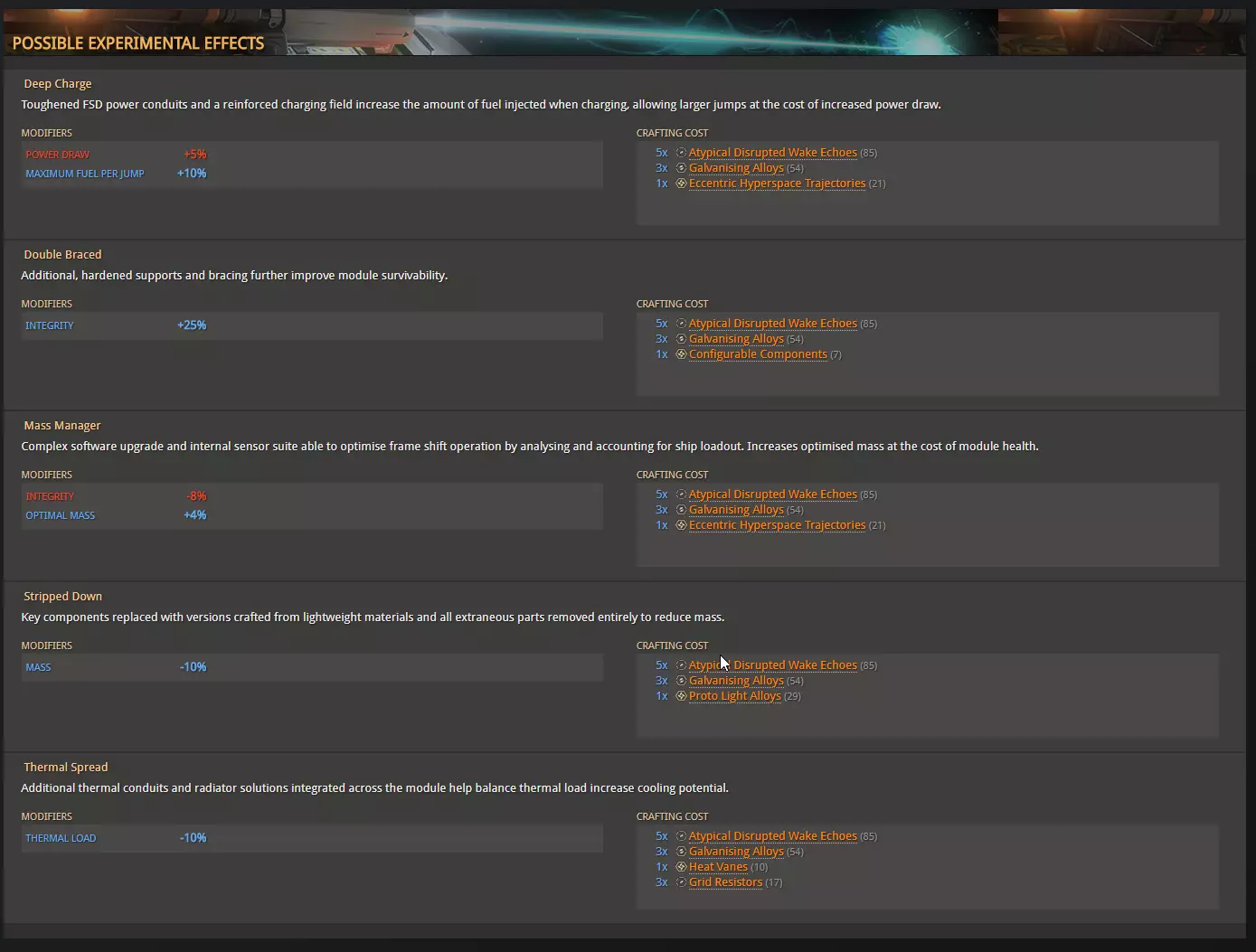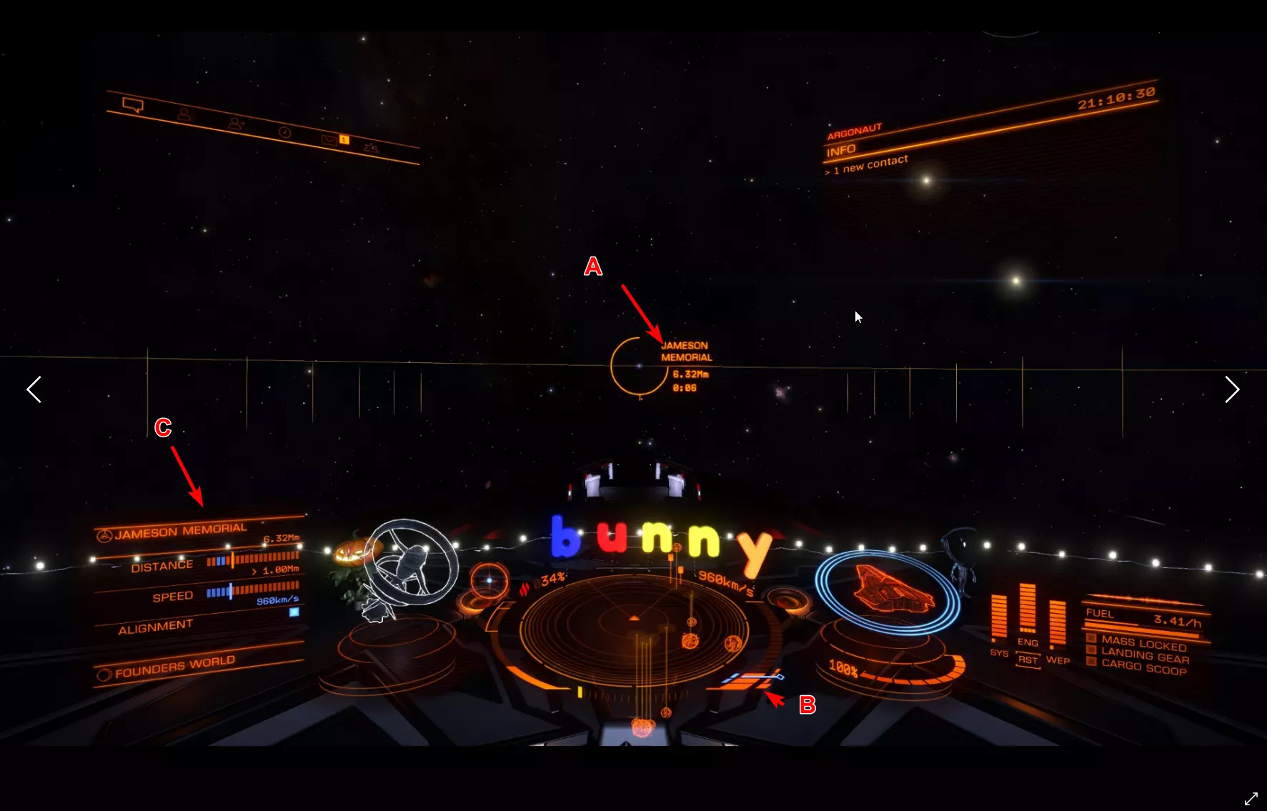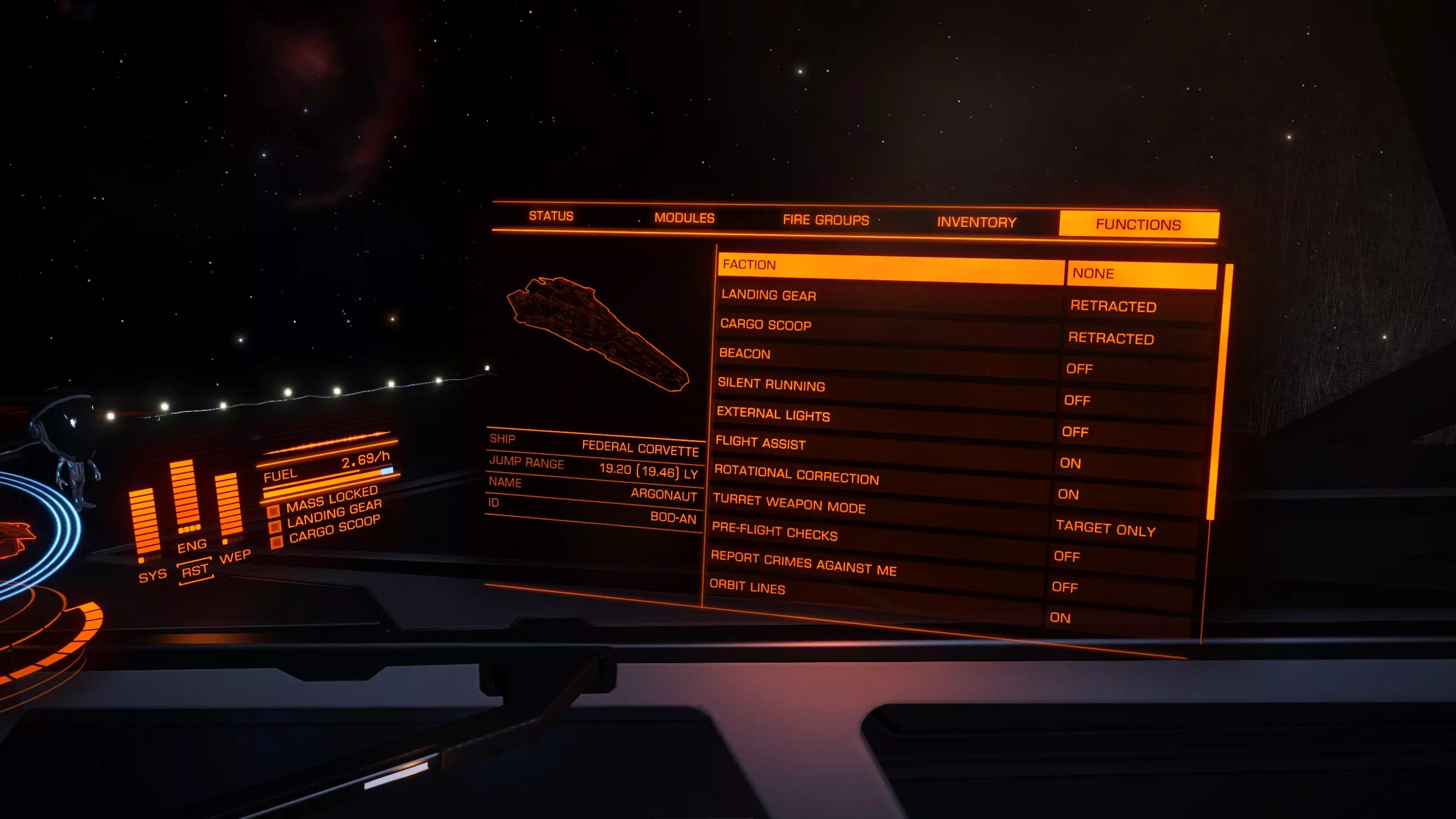 A displays the target you are heading towards. You can also use the small circle with a dot to get the target into sight that we learned about in the docking section. You see a Distance and the remaining time till arrival. Once the remaining time till arrival, also known as ETA (estimated time of arrival) hits 9 seconds, throttle down to 75%. (Remember the keybind i mentioned in controls, that can help you here) But even if you don't have a specific keybind for that, you can see on B the Blue line where your speed is displayed. Try to set your speed in the middle of that blue line. C Displays also your distance, speed and alighment. If all 3 of them are in the Blue you can safely disengage. You will also get a message in the middle of the screen that tells you that you can now safely disengage. This might take a moment to get used to. But don't be disencourage if you overshoot a lot in the beginning. That happened to everyone :3 Weapons This will only be a short overview over the normal weapons. Experimental weapons will not be covered. Since they are rather lategameish anyway. Nothing a beginner needs to worry about. So lets keep that as simple as possible. There are 3 different forms of damage. Thermal, Kinetic and Explosive. Each of these has a resistence you can improve through engineering on Shield and Armor. There is a forth one called Absolute. But, as the name implies it is absolute damage. So lets start with Thermal Weapons There 3 Major weapons in that Class. Beam laser, Burst laser and Pulse laser. Beam laser deal the most amount of damage but also produce the most heat and cost the most energy. Burst laser are the middleground. Pulse laser are really heat and energy friendly but the dmg is a lot less compared to beams. For Kinetics there are 2 weapons to highlight. Cannons and Multicannons. There is not much to say about these. The best way is simply to test the weapons out once you think about building a combat oriented ship. The information about the weapons are pretty good ingame, but i will provide later a site that can help you planing out ships. Modules Modules are your ship internals. So lets go over them one by one and i will tell you a bit about them and what exactly they do. As a beginner you sure wonder what is the most important part to upgrade. After reading through that secion, i hope, you can make that decision for yourself. There are 2 values you need to know about. Size, displayed by a number. and Rating, displayed by a letter. Normaly you always try to buy the right size. You only downgrade Modules for specific builds. Exploration Builds often use lower sized internals to save Mass to gain a better Jumprange for instance. The Rating is more like a Quality indicator. A is the best quality you can get and E is the worste. D Rated mods are the lightest mods. (That will become important once you try to build a Exploration Builde) But D mods also provide lesser output. So a D rated power plant will be lighter than an A rated the same size. But it will provide you with less power. Lets start with Core Internals: Armor: Lightweight Alloy is the Armor every ship comes equipped with when you buy it. There are different variants you can buy. They are really pricey compared to other things on the ship. Armor increases your Integrity. Your Armor Lifepoints if you so wish. It can also increase your resistances depending on what armor your pick. This shouldn't be too important for a beginner tho. Power Plant: You Powerplant does not only provide the needed power to get everything running on your ship. It also determines how heat efficient you ship will be. How good it handles heat produced from other systems. Thrusters: Thruster provide speed and how your ship handles. You also need to keep in mind how heavy you ship is. That normaly is not a problem on Multirole or Combat Ships since you aim mostly for A Rated Max Sized Thrusters on them. And they provide normaly more than enough Maximum Mass to never run into problems. Frame Shift Drive: Probably one of the most important internals for EVERY ship. You want that always in Maximum Size and A Rated. This in combination with your total ship weight, defines how far you can jump in one jump. So these can really improve your Travel experience by quite a bit. Life Support: Life Support provides oxygen in case your Canopy (the window infront of you, and no, not the Monitor, the one inside your ship which keeps you alive) breaks. The higher rated the module the longer it will provide oxygen. E Rated = 5 Minutes while A rated = 25 Minutes. Power Distributor: This is really important for Combat. The Power Distributor defines how fast you Ship recharges its boost. And your Weapon Capacity (more to that later) Sensors: Sensors Pick up the heat ships give off through emission. The higher the grade the longer the distance you can pickup ships on your sensor and the further you can scan these ships. Optional Internals: There are just a lot of optional internals. They vary from Cargo rags to Shield Generators, Shield Cell banks and a lot more. Most of them are easy to understand. One of them is really important. It is called the Fuel Scoop. This fancy little internal module lets you scoop from certain Stars fuel. Which means you don't need to dock on stations all the time. And you can travel unlimited distances without ever having to stop for a station to refuel. Hardpoints: This are the slots you have open for Weapons. They change greatly from ship to ship. Utility Mounts Utility Mounts offer you a way to bolster your defense with Shieldbooster and add certain abilities to your ship. These range from different scanners to defence abilities like Chaff Launcher. Combat (Bounties and War) Combat is the first Profession i wanna talk about. Combat is in a weird position. It is the one profession that needs you to invest heavily in the game the further you wanna take it. Currently this is split into 3 Major parts. Bountyhunting: This allows y