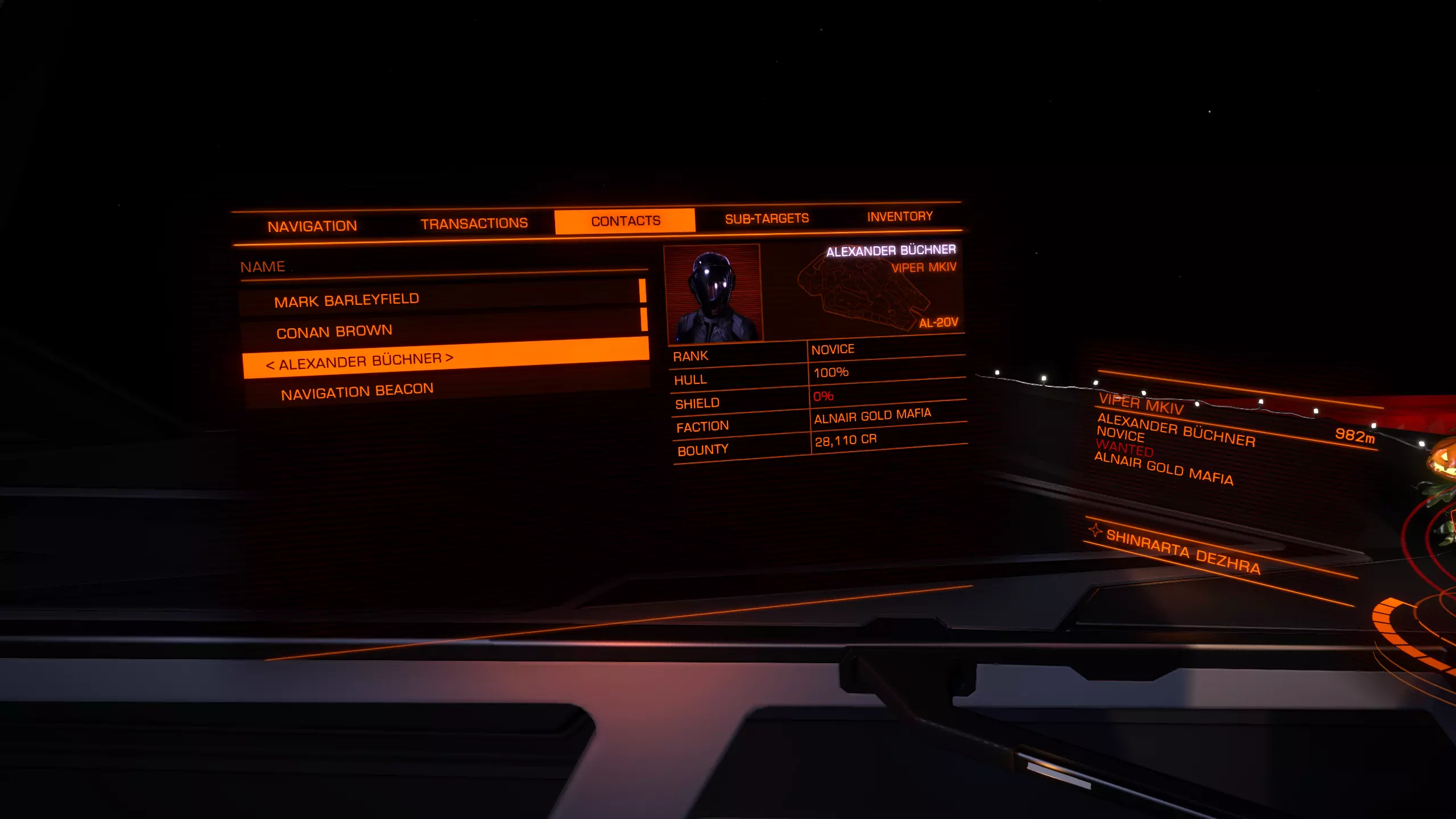 在这里你可以清楚地看到,目标在当前星系是清白的,没有被通缉。他可能在其他星系被通缉,但你需要使用【杀戮 warrants 扫描器】才能查明。不过,等你拥有一艘装备良好的飞船后再考虑这些也不迟。 那么,我们来看看被通缉的目标会是什么样子: