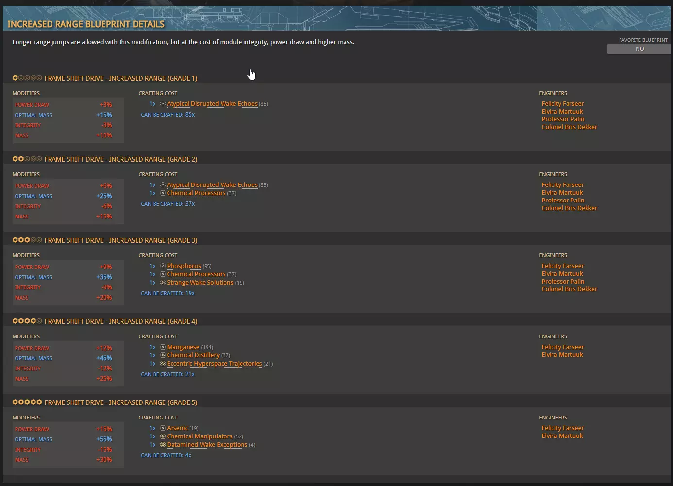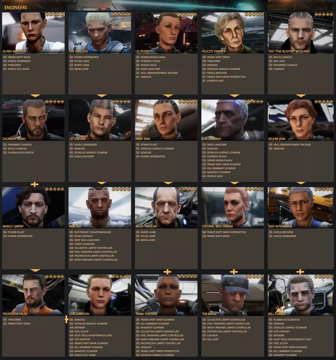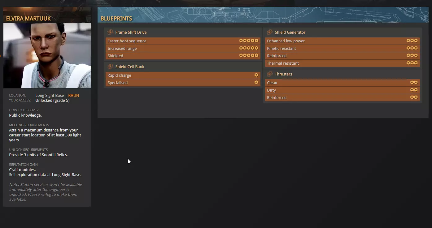 在这里你将看到她提供的5个等级。你必须依次通过每个等级才能解锁下一个等级。你只需将每个进度条填充到75%即可解锁下一个等级。 你还可以查看所需材料。 对于等级1,你需要1个非典型扰乱唤醒回声。材料也有不同的等级,和蓝图一样,材料分为1到5级。 我从不建议刷取1级或2级材料。刷取3级、4级和5级材料,然后使用材料商人将5级材料兑换为同类型的低级材料。你可以通过Inara轻松找到材料商人及其他各种内容。在此列表中,你可以直接选择你要寻找的服务。 当你将埃尔维拉升级到3级及以上后,你会听说扎卡里亚·尼莫。和他打交道时,你只需重复同样的流程:满足他的需求,通过制造物品来提升他的等级,以解锁下一位工程师。 在尼莫之后,你会看到一个小加号图标而非箭头。这意味着解锁扎卡里亚的同时,你也会解锁马可·昆特。这也意味着你可以跳过尼莫,直接去解锁佩林,除非你确实想解锁尼莫。 因此,要规划好先解锁哪些工程师,以及解锁他们的路线。 首先选择一位能提升跃迁引擎(FSD)航程的工程师。从这里开始,后续选择取决于你的游戏目标。 战斗方面:提升你的生存能力。升级你的护盾、护盾增强器、能量分配器和推进器。之后,武器可能是个不错的选择。但这只是建议。按照你觉得合适的方式游玩和解锁吧。 对于探索者、贸易商和全能型玩家来说也是如此。一旦你有了一些钱,至少能买一艘还算不错的ASP探险家,就可以开始找工程师了。他们会让你走出舒适区,为游戏的各个方面布置任务。有些任务非常烦人,有些则真的很有趣。 工程改造能极大地提升你的飞船性能。如果你想进行战斗,这是必备的。 有些模块还允许你添加实验性效果。