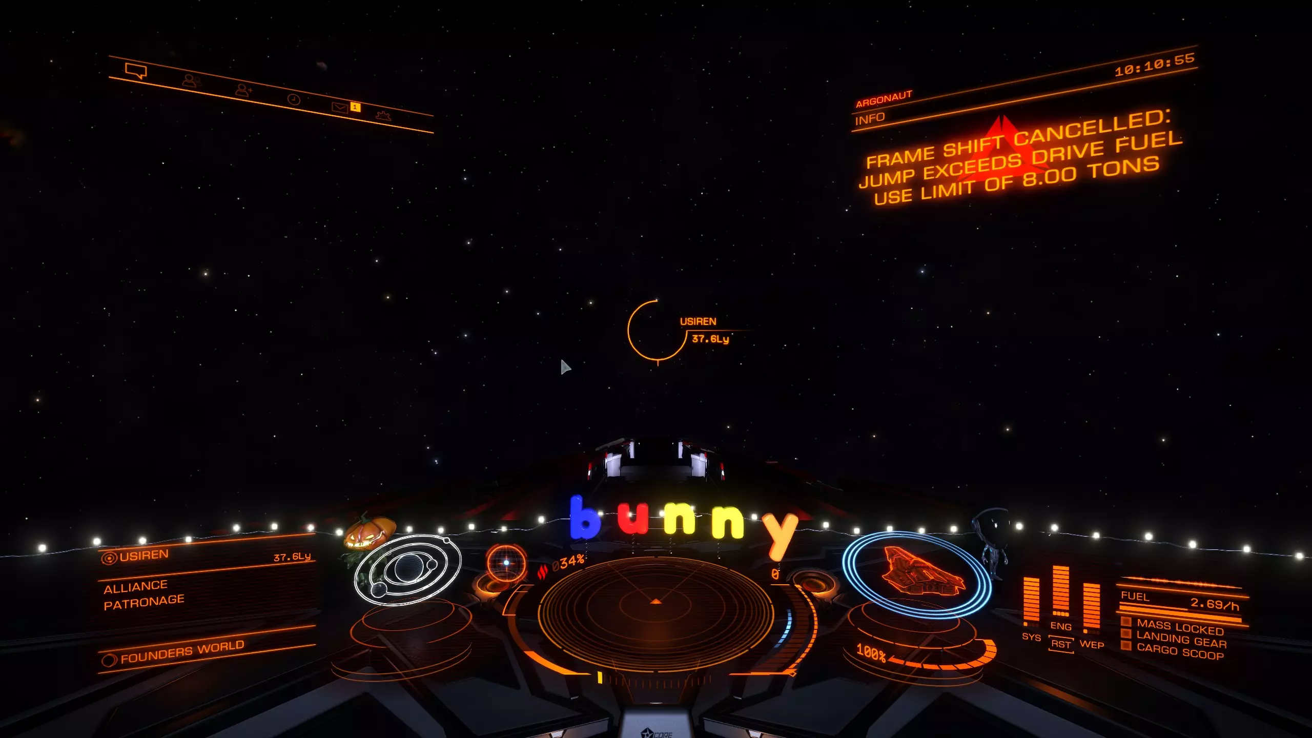 现在你将看到你的飞船、跳跃距离、名称和ID。我们只需要不带括号的那个。 如果你在右上角收到如下所示的警告消息: