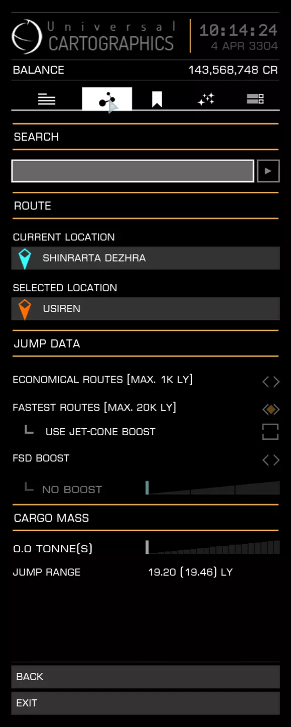 在这里你可以输入想要前往的星系。界面还会显示你的当前位置和已选择的位置。我建议使用最快路线。不要使用喷射锥推进和FSD推进,这两项功能更适合经验丰富的玩家。 第三个栏目是你所有已添加书签内容的集合。 第四个是筛选系统。你可以筛选各种内容,比如特定服务、商品、恒星类型,甚至可以将筛选应用到路线规划中。例如,你可以只选择可 scoop 的恒星(可以从中 scoop 燃料的恒星)并应用到路线上,这样你的旅途中不可 scoop 的恒星数量会大大减少。 第五个仅为地图显示选项。比如显示工程师或显示受损的太空港。现在你可以直接选择想要前往的目标星系并进行跳跃。有时可能会出现目标被阻挡的情况。