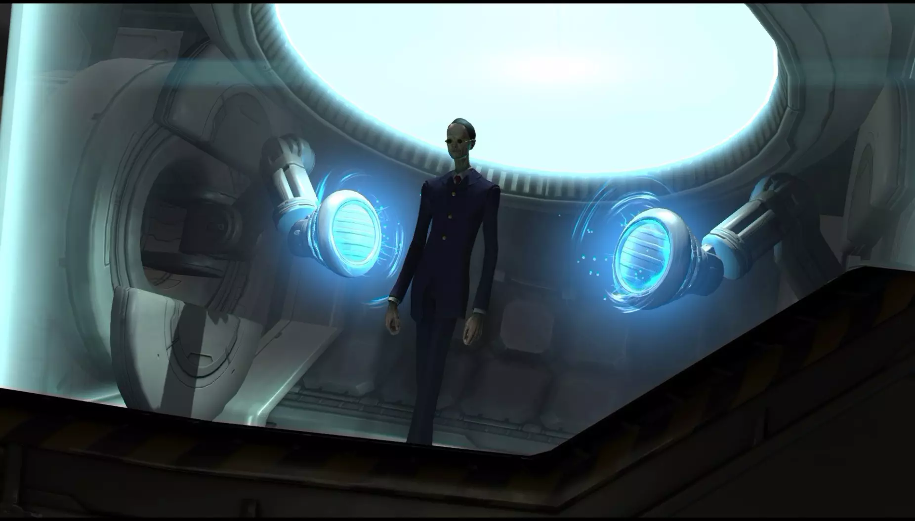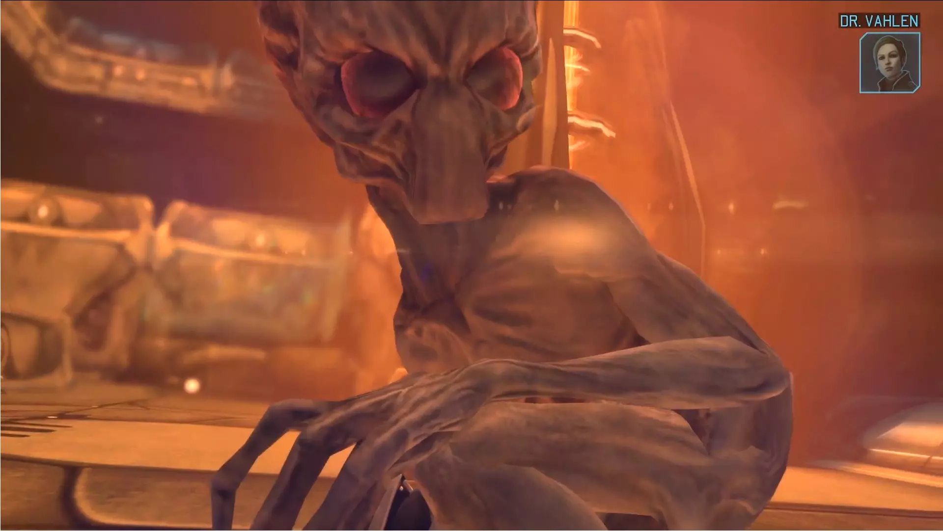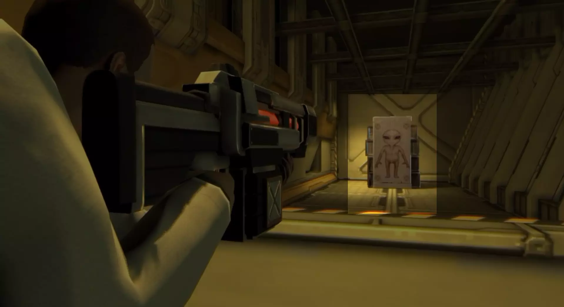 在你制造出第一把激光步枪后播放的过场动画中,出现了一个来自《幽浮:未知敌人》的 Sectoid 纸板人形。