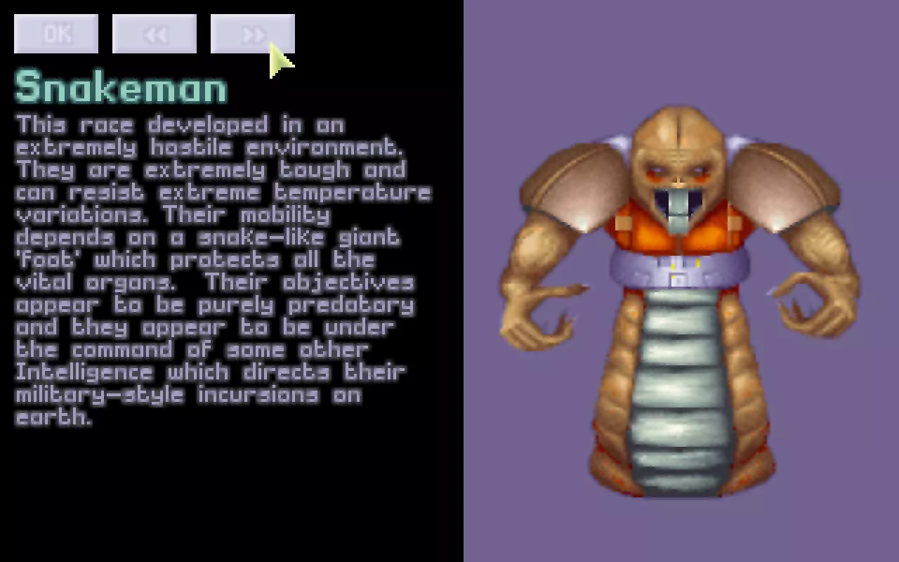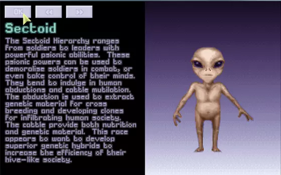 可投掷手榴弹至很远的距离。 其他敌人 异星人 首次出现于你击落的第一艘UFO飞船中。【游戏中期剧透】当你完成“袭击外星基地”任务目标后,该敌人将从游戏中消失。这是你遇到的首个持有轻型等离子步枪的敌人,这意味着这家伙的攻击力极强。除此之外,它是一种相当标准的敌人。