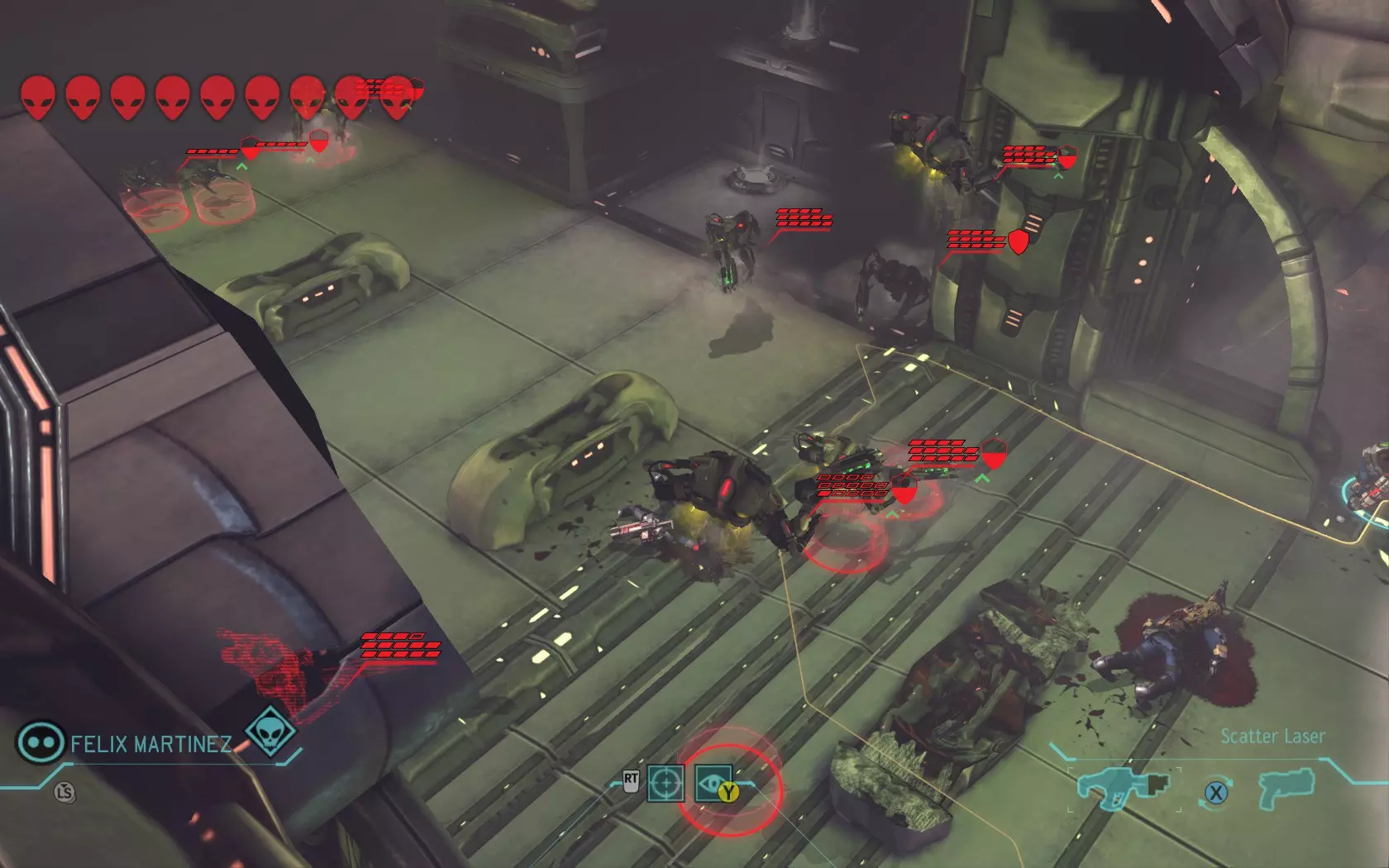 开启抖动视角。 如果你的攻击效果拔群,就能消灭靠近小队的外星人,但可能会有一两个外星人在首轮存活下来并撤退。当它们撤退时,你的士兵会发出提示,你还能看到这些家伙尖叫着求救。这意味着你需要清点外星人的数量并考虑自己的策略。你可以用战锤模型、硬币等任何东西来辅助计数,但一定要数清楚外星人的数量。如果战斗结束后不清理战场,可能会有瘦人在外面搜寻你,它们会悄悄靠近并发动袭击。 关于小队的站位,一般经验是突击兵在前,重装机兵其次,支援兵随后,狙击手在最后。突击兵需要靠近敌人,以便他们能进行【移动射击】,并且可以轻松侧翼包抄敌人,同时避免己方小队成员被侧翼夹击。重型兵需要对敌人方向有清晰的视野,在任务中你会看到敌人所在的方向(屏幕上的声波符号会指示这一点),以确保重型兵在需要时可以掏出大型火箭筒,把那些外星人送上天。支援兵适合位于中间位置,这样他们可以投掷烟雾弹,必要时也能进行几次射击。最后但同样重要的是,狙击手要待在后方,因为他们需要远离敌人射程,从而避开危险。然而,这可能非常难以做到——尤其是在游戏初期——因为你必须依赖地形,而地形并不总是配合。 “确认击杀!” 消灭敌人:在敌人四处逃窜并找到掩护后(他们总是这样做),首先要做的是确定谁对你的小队构成最大威胁。在进行此操作时,你必须考虑敌人类型、与小队成员的距离(例如,如果一个外星人靠近你的一名小队成员,该外星人可能会对你进行侧袭)以及他们武器的射程(例如,如果你的三名小队成员处于敌人的视线范围内,而你让其中两名蹲下隐蔽,那么外星人会攻击掩护最少的那名成员)。