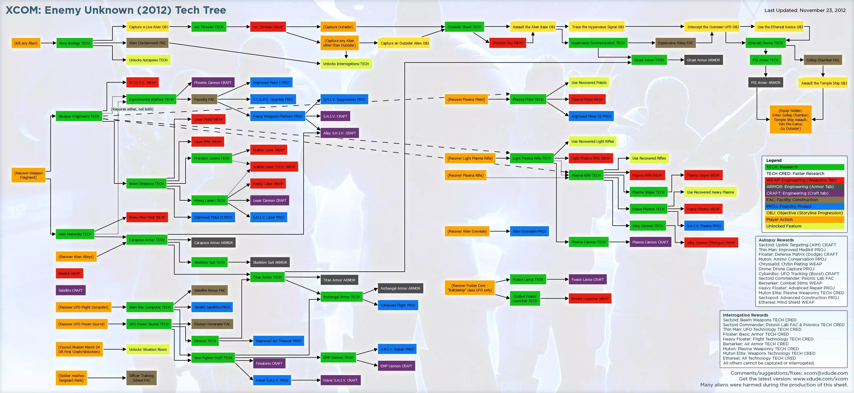 Contempt in its purest form. My most successful tactic is to back the alien into a corner, meaning you have one soldier suppress the alien and the rest of the squad Overwatch -behind cover of course- and try to be fairly spread out if the aliens has grenades. I can't guarantee this but, most of the time the alien simply does nothing at all or scream for help. Rules of Engagement* *Rules always have exceptions. That's what makes them rules. Before deploying: Always bring with you at least one Arc Thrower, one Medikit and one of each class. If you are going to do a very hard mission like the early Council missions, Terror mission or story mission remember to always bring your A-Team and your a-game.On the battlefield: Always have a backup plan, a.k.a. Plan B. Always check what your options are for eliminating your enemies. Identify the greatest threat and put that enemy on the top of your kill list. Aliens will always attack the member of the squad that has the weakest Defense, so if you leave a guy standing out in the open it won't help to Hunker Down with the rest of your squad. Remember to always position your Sniper on the high ground and your Heavy with a clear LOS in the direction that the aliens are coming from. This is why when we advance we always give our Heavy and our Sniper good positions and full-cover. Assault has Run & Gun and has to get dirty some time, i.e. get close to the enemy. Support can move into cover and shoot in one turn, unlike Sniper who needs 2 APs to shoot and Heavy who could have to shoot two times in a row or use a rocket. In practice this means that Support and Assault stand out in the open when no aliens have been engaged. Explosives are Plan B, unless you want to use them to remove cover from the aliens, so try to avoid killing enemies with them. If you kill enemies with explosives you don't get any weapon fragments or any other item for that matter, except for Chryssalids ; those bastards don't drop anything so you can blow them to smithereens. You should also praise the lord that grenades never miss; they will be your lord and savior. If you realize during a turn that you can't kill all of the aliens try to minimize the risk of your squad getting wounded or killed by: moving into full-cover (or out of the aliens' LOS), drop some purple smoke or Hunker Down. For your information, smoke makes everyone in the smoke cloud harder to hit, even aliens. Be very cautious when flanking, you don't want to have to fight anymore enemies at a time then you have to. The safest way to flank is to either: flank close to the enemy (i.e. within your squad's LOS) or flank with your back against the edge of the map or some building. Spread out your squad to avoid area of effect attacks, like Poison Spit. This can obviously be skipped if you are encountering enemies that don't have such capabilities. If given the opportunity, try to use your Arc Thrower as much as possible, but remember always have a backup plan. You don't want to take a Plasma Rifle shot to face when standing out in the open. There's no use for excessive force, in practice that means that when the extra damage is not needed to kill an enemy use your pistol instead. That way you save ammo for targets that need to taste high caliber rounds. Make sure to keep track of the number of aliens you have engaged. Commanders do this so his or her squad doesn't get surprised by an enemy that they engaged earlier. Listen closely for cues on what you are up against and pay attention to what direction the aliens are coming from, as to not get surprised or even worse flanked. Make sure to reload, wait for your abilities to go off cool-down and carefully contemplate if you should patch up your squad-members, or save it for disaster relief after the next engagement. Things to note about the enemy A.I.: If the enemy didn't dash, shoot or do anything else that requires 2 APs assume that they are on Overwatch, even if you didn't directly see them Overwatch. Overwatch will most of the time just make sure the aliens don't move. The A.I. is smart enough not to give you a free reaction shot. Hunker Down is literally a life-saver. The only thing Hunker Down won't protect against is flanking. I know it makes it so that aliens can't crit but you also lose the Defense bonus from cover if flanked and that is the primary bonus of Hunker Down. Base Management C.R.E.A.M.Your number one priority should be to get enough money (or whatever bloody currency this § is) to cover the Earth in satellites. If you play your cards right you could need 16 satellites, but it's more likely that you will lose a few countries along the way. So make sure that you build enough Uplinks, Nexuses and satellites. You may want to visit the Gray Market and sell things that you don't need because then you can invest in more satellites, which in the end will give you much more money, much earlier. Be careful though and make sure that you have enough materials to keep your scientists busy; you don't want to ever stop researching. You can also get a lot of money by delivering on the requests of Council members, most of time it's worth it and if you don't need it you should definitely sell it, or if you can spare the materials to create the things Council members want and then sell it. The last way to get money is to select missions with cash rewards. You can also save a lot of money by only having enough equipment for one squad. It's a pain to remove all of the equipment when switching squad-members, but if you want to save money you might want to consider it. My last tip is to start using your Arc Thrower immediately, because then you will get aliens weapons for free, instead of having to manufacturing them. You don't need to research Alien Grenade, but all of the other alien weapons you need to research before you can use them. Research with (German) efficiency [/url]I would put off the main story research projects* (they are indicated by PRIORITY) and make sure th