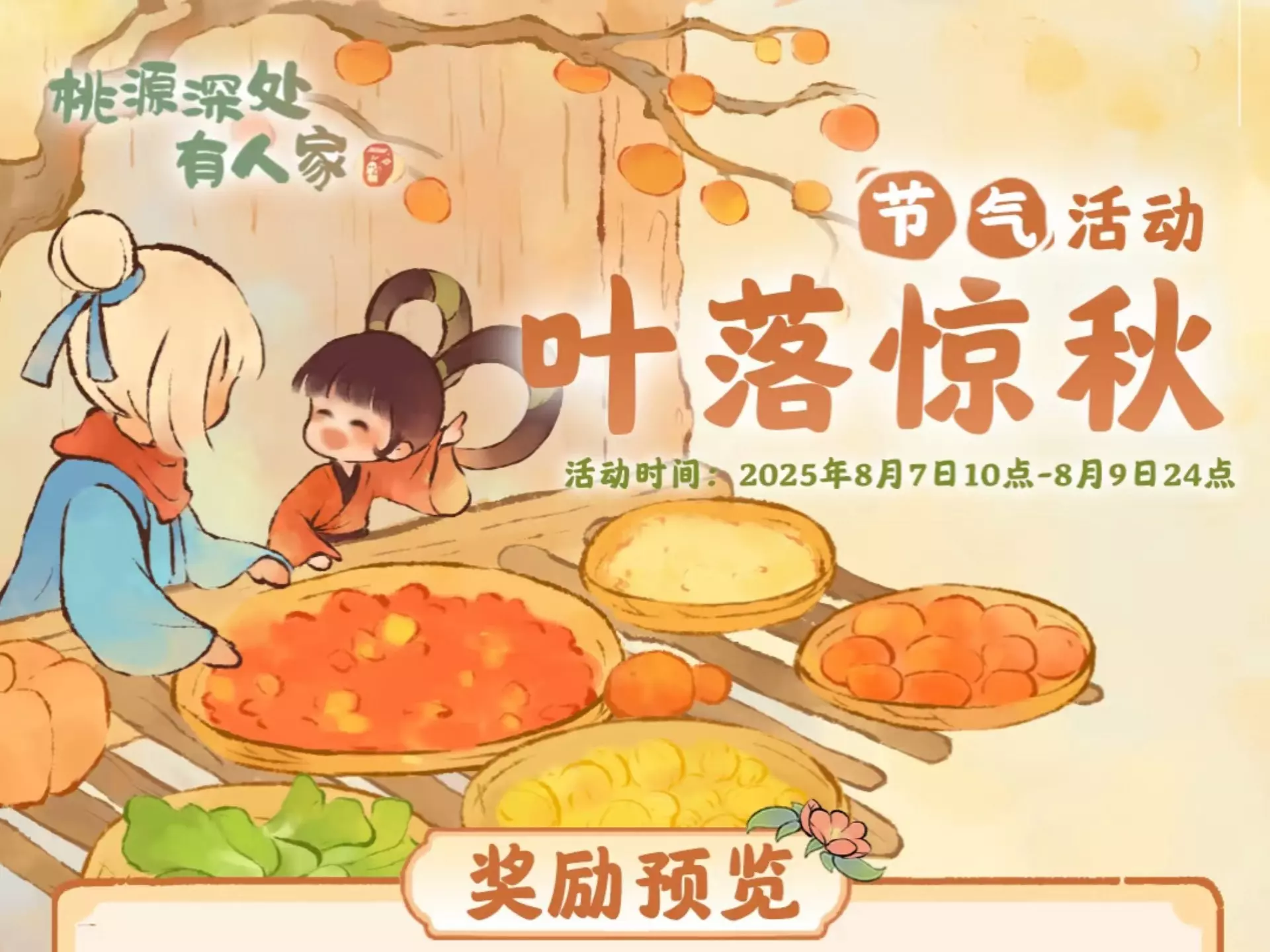 活动名称:叶落惊秋 活动时间:2025年8月7日- 2025年8月9日 商店更新:限定建筑[金露蕊菊][白虎立秋石]和节气限定家具[红椒金实晴牖] 可种植特殊农…