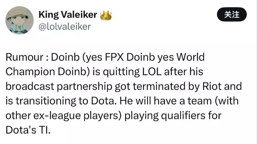 原本Doinb的想法,是找5个英雄联盟退役选手,组一支队伍参赛,但宝蓝等人,还吃着LOL这碗饭,不好直接切割,所以5职业的班子没搞成,不过他个人,应该还是会继续参赛,估计是联系一些,已经退役的DOTA职业选手吧,大B的刀塔水平,说实话不高,参赛估计也是为了搞点热度。