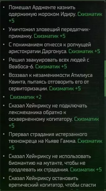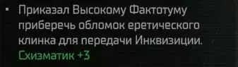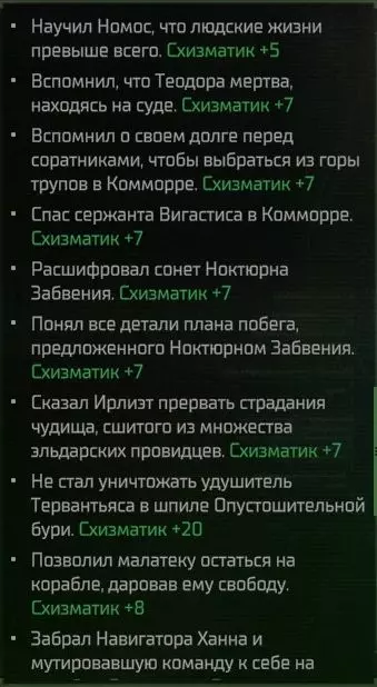 Это результаты выборов Схизматика в ситуации с Реколлигерами, но комментарии к ним у меня не отображаются. Комментарии и советы В конце пролога мы сталкиваемся с первой ловушкой: после боя с отродьем Хаоса на мостике брать обломок клинка с тела отродья-Эдельтрада нельзя. Нужно оставить его на месте, тогда чуть позже, после доклада офицеров, к вам подойдёт Высокий Фактотум и спросит, что делать с опасной находкой. Выбираем вариант "Прибереги, потом дознавателю отдадим" - получаем 3 очка Схизматика. Чтобы получить 15 очков Схизматика за то, что мы эвакуировали людей с Рикада Минор, нужно, чтобы в бою с Зарёй клятый хаосит сломал не больше двух шаттлов, то есть бой нужно закончить максимум на 5 раунде. Выпустить "ксеносов" из клетки на Футфоле можно двумя способами - выкупить их (что неприятно стукнет по нашему пока ещё чахлому ФП) или сказать Владайму: "Прекращай это безобразие". Когда Джай попросит организовать ей Меркатум Табула Официале - соглашаемся. Помимо муторного сидения в очереди нужно будет слетать на Янус. Берём Джай в группу, и тогда суховатая деловая беседа с Атилиусом Квинтом превратится в очередную драму маленького человека в Империуме. Нужно отговорить бедолагу от добровольной сервиторизации. Навигатор Ханн на Разорённом Корабле с мутантами в системе Пульвис Платинум. Его можно забрать и во второй, и в четвёртой главе (я забрал его в четвёртой, потому что раньше был баг, не дающий взорвать саркофаг и получить очки Схизматика, но с большим патчем это починили). Братство ухода за сервиторами (какой бы странной не казалась идея) потребует от нас третьего ранга Схизматика. Естественно, Кьява Гамму зачищать не стоит. В Комморре есть выбор схизматика по спасению людей, но на данный момент он забагован. Нужно спасти сержанта Вигастеса, что само по себе принесёт 7 очков Схизматика, а затем после всех арен сказать Нюктюрну "Вытащи и моих товарищей". Ждём патчей. Отдельно хочу упомянуть мини-квест с Реколлигерами. В системе Ардематт II есть остов корабля, называющийся "Делянка Реколлигеров". ВНИМАНИЕ: посещение этого корабля запускает счётчик прыжков между системами. Высаживаемся на корабль, разговариваем с Ритой Максимовой и выбираем вариант Схизматика, дающий 2 очка убеждения. Но это не всё. Если согласиться "купить" предложенные ею детали, Рита даром отдаст вторую печать, нужную для квеста "Меркатум Табула Официале" (вариант появится только если квест взят, но можно слетать взять квест и вернуться - нужная реплика появится). Кроме того, Рите можно предложить взять Реколлигеров на наш флагман - она откажется, но упомянет, что им нужны одежда и еда. Выходим с Делянки, подлетаем к ней вновь и видим, что на ней появилась вторая зона взаимодействия. Можно предложить отдать либо груз продуктов питания, либо груз униформы, за что благодарные работники вторчермета дадут 200 металлолома. Больше одного груза давать не нужно - Рита от них вежливо откажется (но из-за бага грузы всё равно у нас спишут). После 4-5 прыжков между системами нужно наведаться к Реколлигерам второй раз и снова отправить им груз либо униформы, либо продуктов. Получаем ещё 200 металлолома и снова делаем 4-5 прыжков. Возвращаемся к Реколлигерам, в третий раз отправляем им груз униформы или еды, получаем очередные 200 металлолома, после чего Рита мрачно скажет, что корабль они выпотро