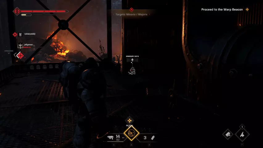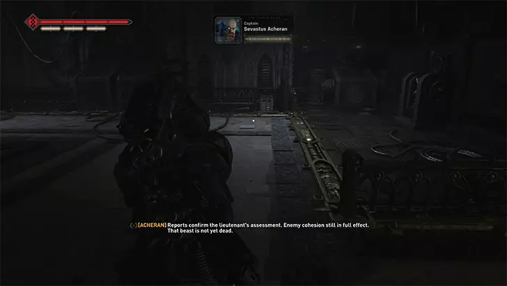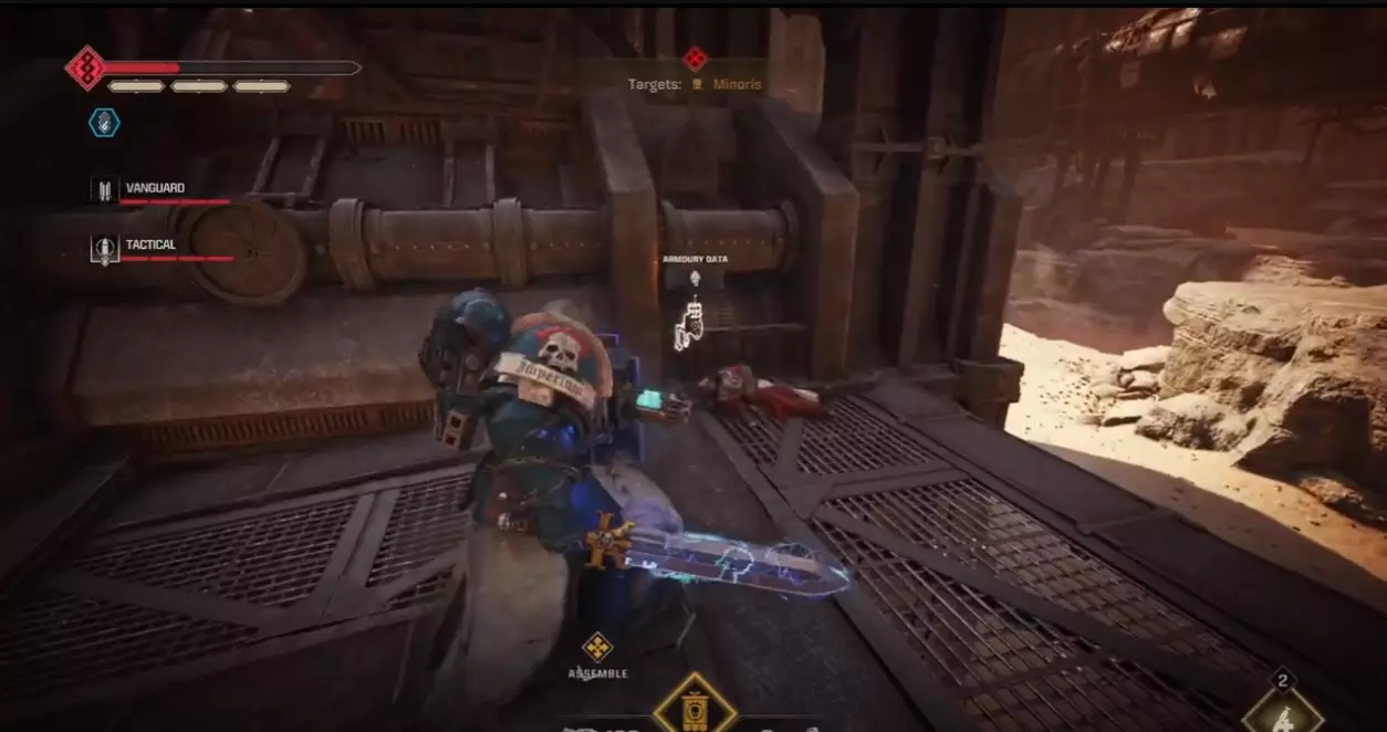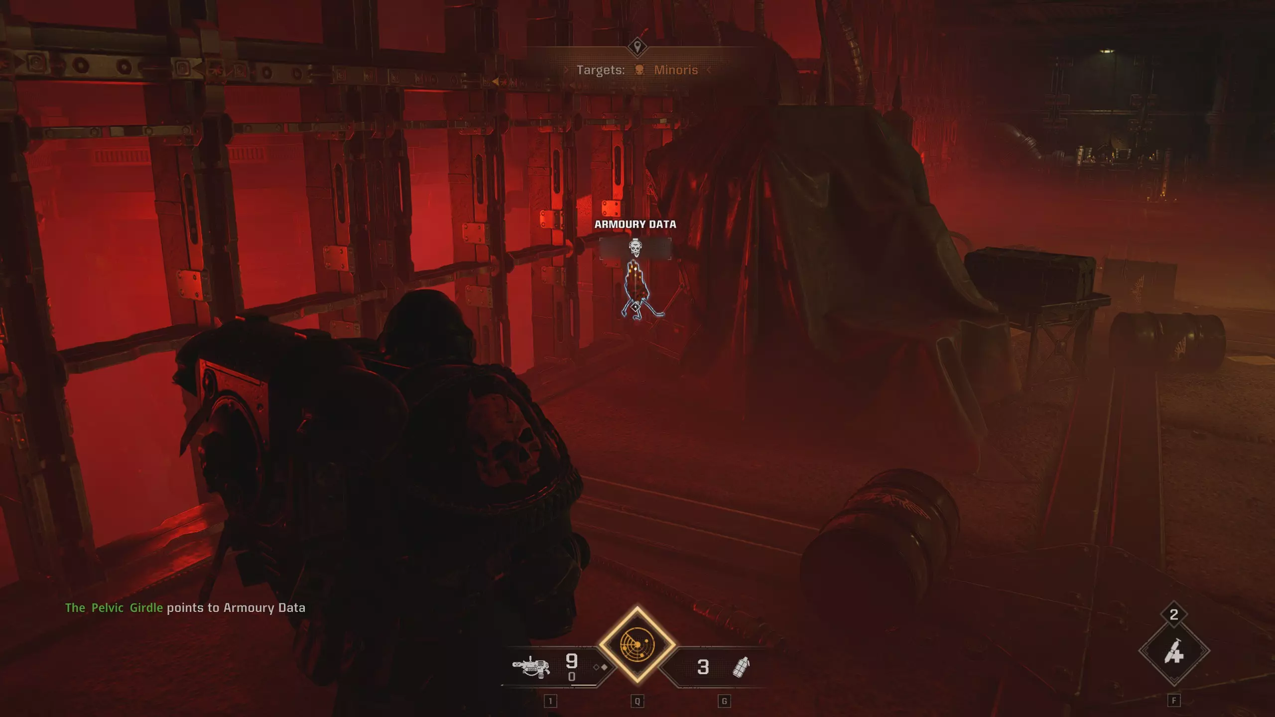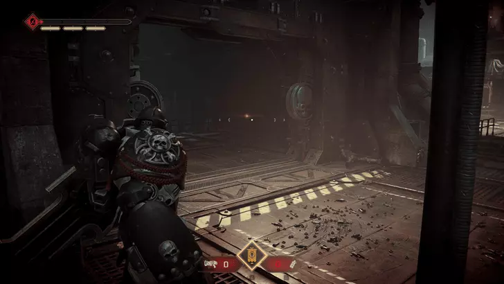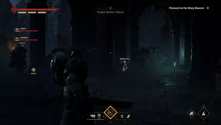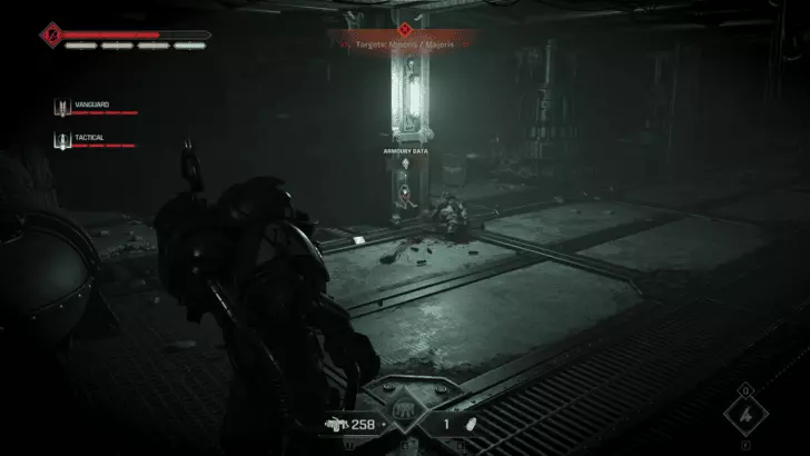 如果你的任务是重新启动控制台:进入暗室后,向前走并靠右行进。你会经过一套破损的混沌星际战士盔甲,然后是一个大型蓝色书架,之后沿着斜坡进入一个类似地堡的地方。继续穿过地堡,军械库数据会在左侧的第一个房间里。