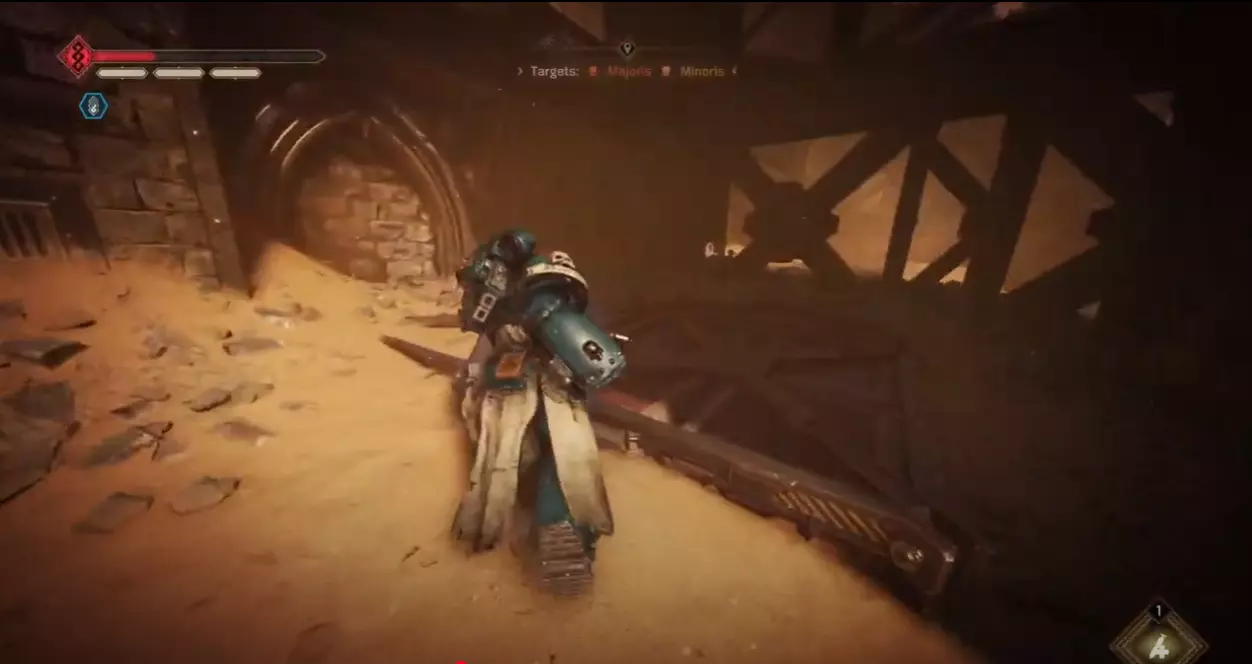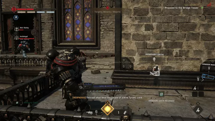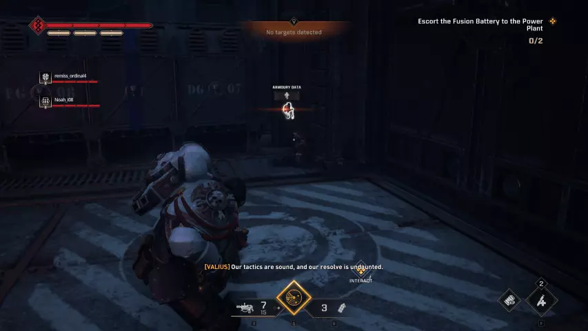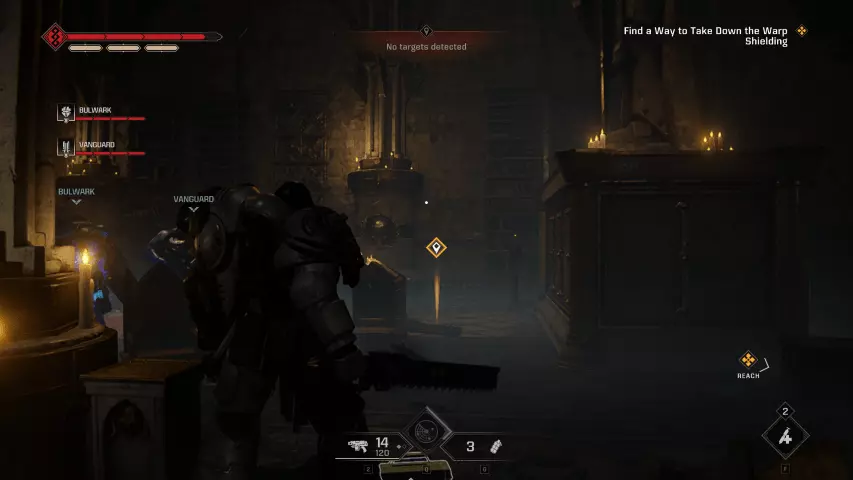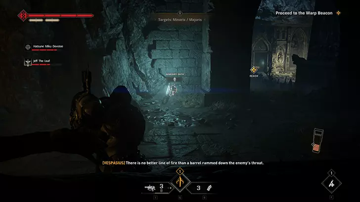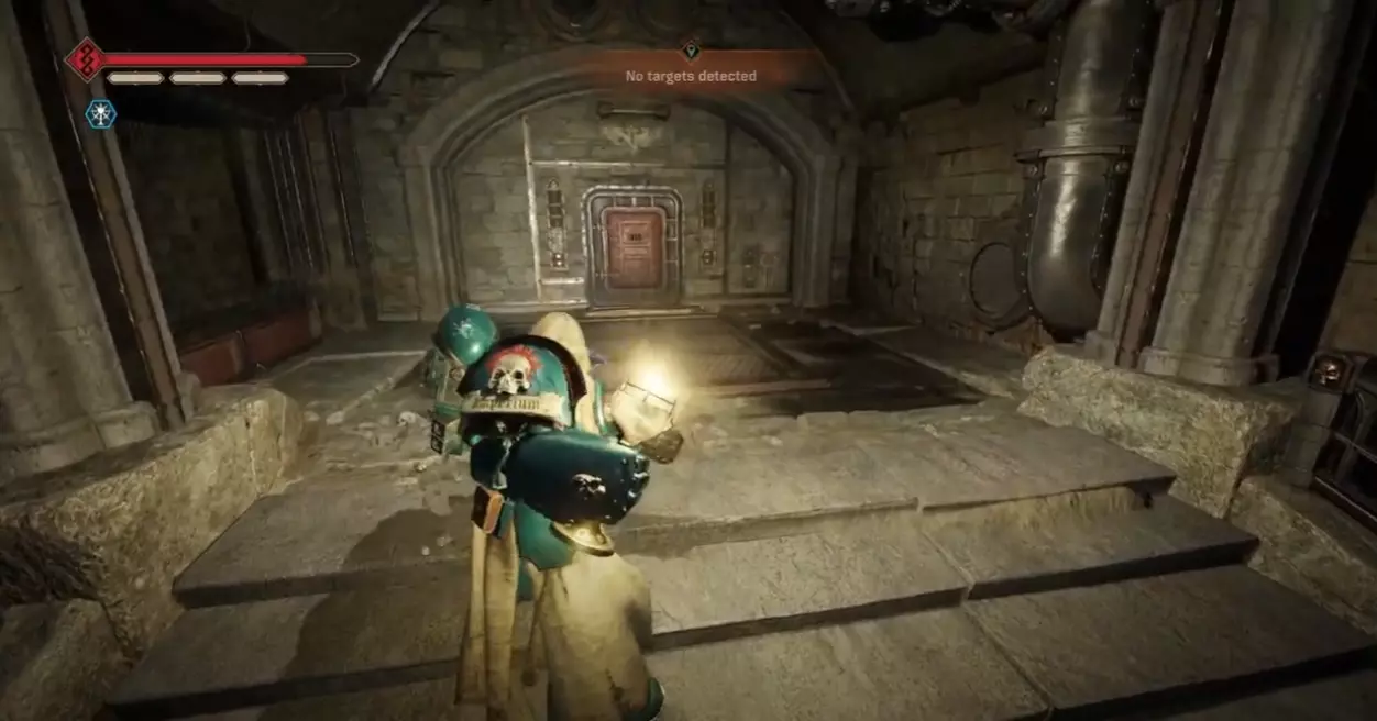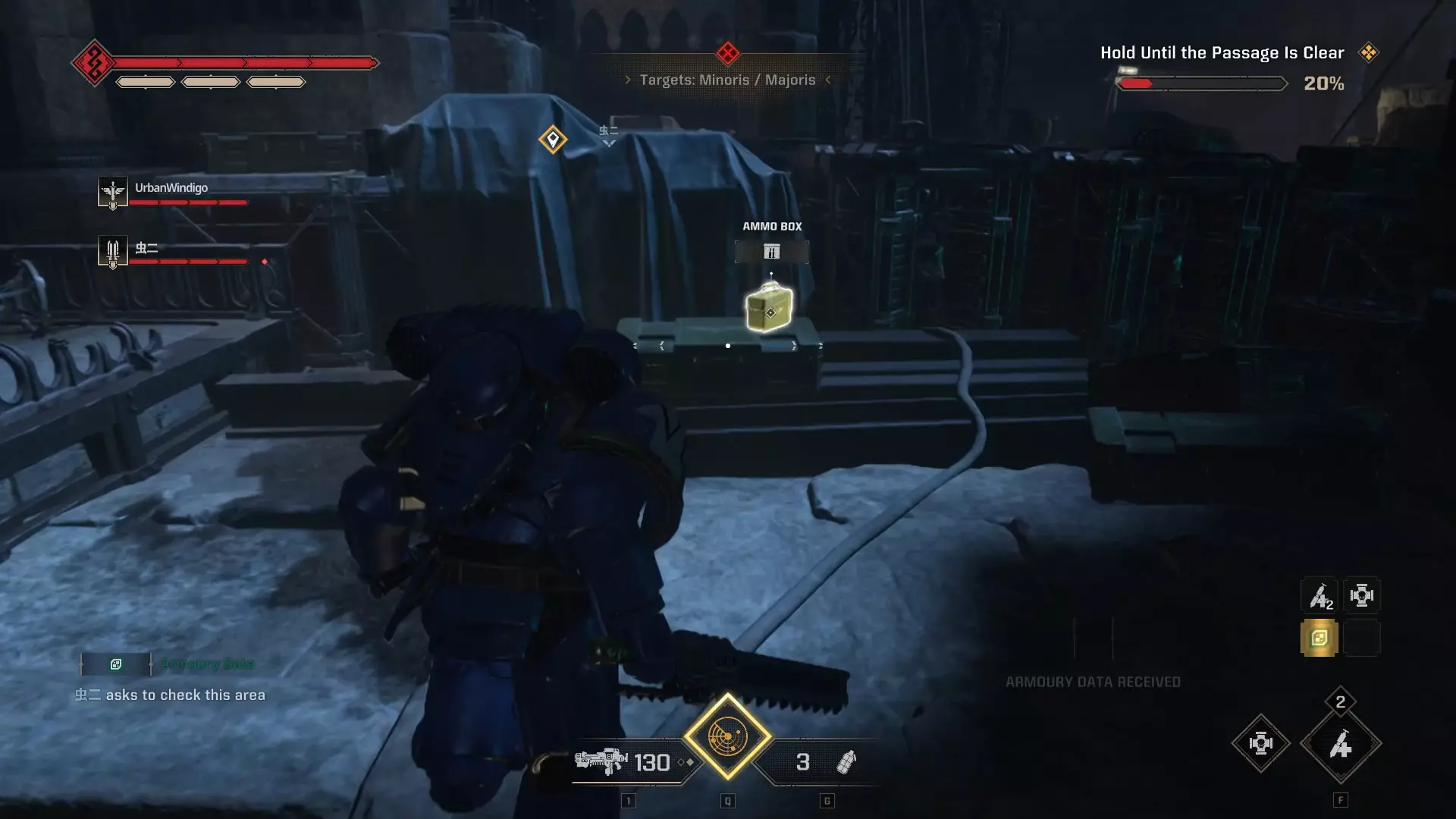 如果你的任务是重新启动控制台:进入暗室后,向前走并靠右行进。你会经过一套破损的混沌星际战士盔甲,然后是一个大型蓝色书架,之后沿着斜坡进入一个类似地堡的地方。继续穿过地堡,军械库数据会在左侧的第一个房间里。