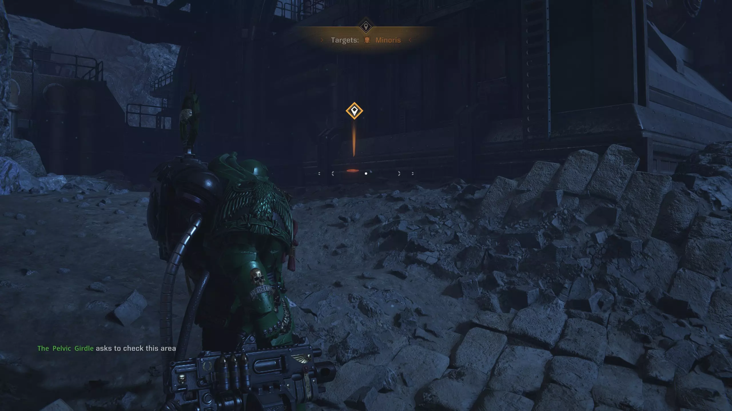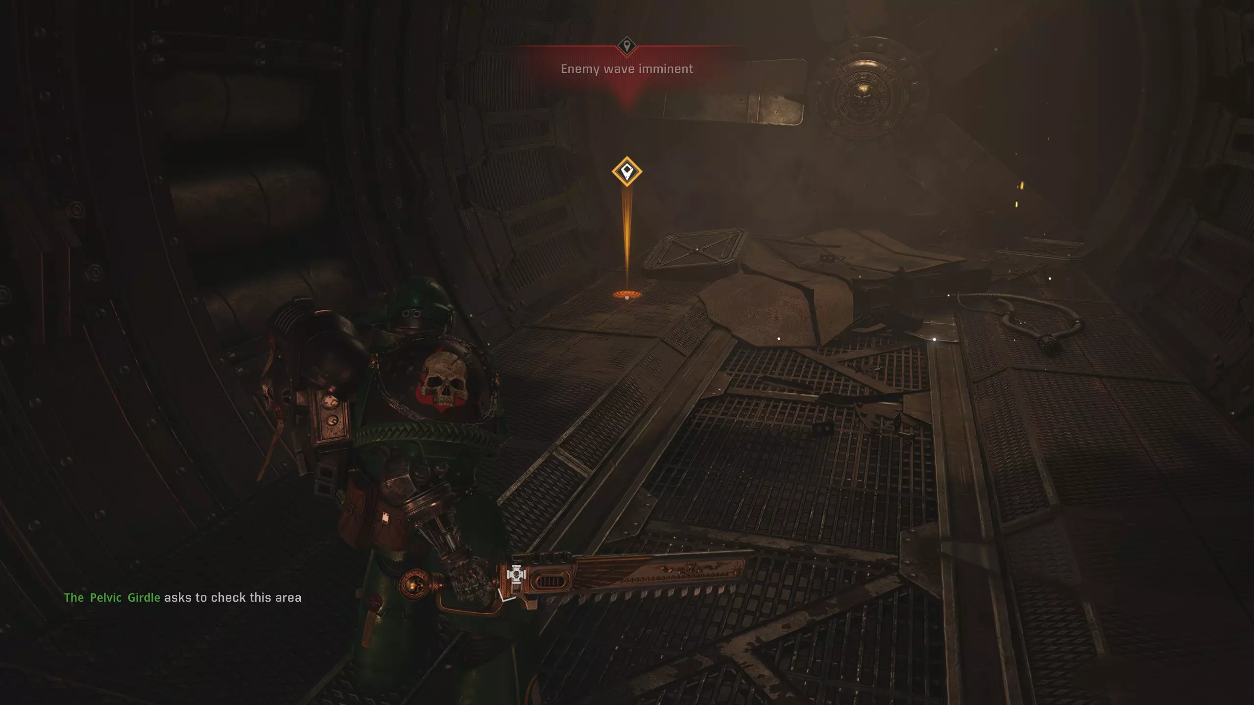 在 Heldrake Bombardment 的最后阶段,从第一个塔楼落下后,立即右转进入钢制平台,【物品/目标】就在尽头。