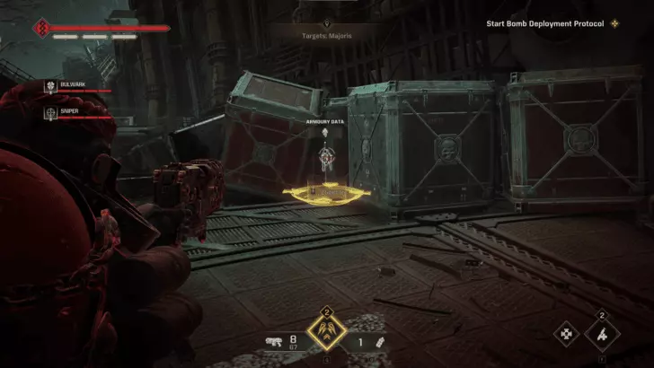 如果你的任务是重新激活伺服颅骨:拿起圣物后,你将通过一扇巨大的金色双开门进入地穴。穿过门后直走,左转上坡而不是下坡。你会在右侧看到一面破损的墙壁,军械库数据就在这里的角落里。