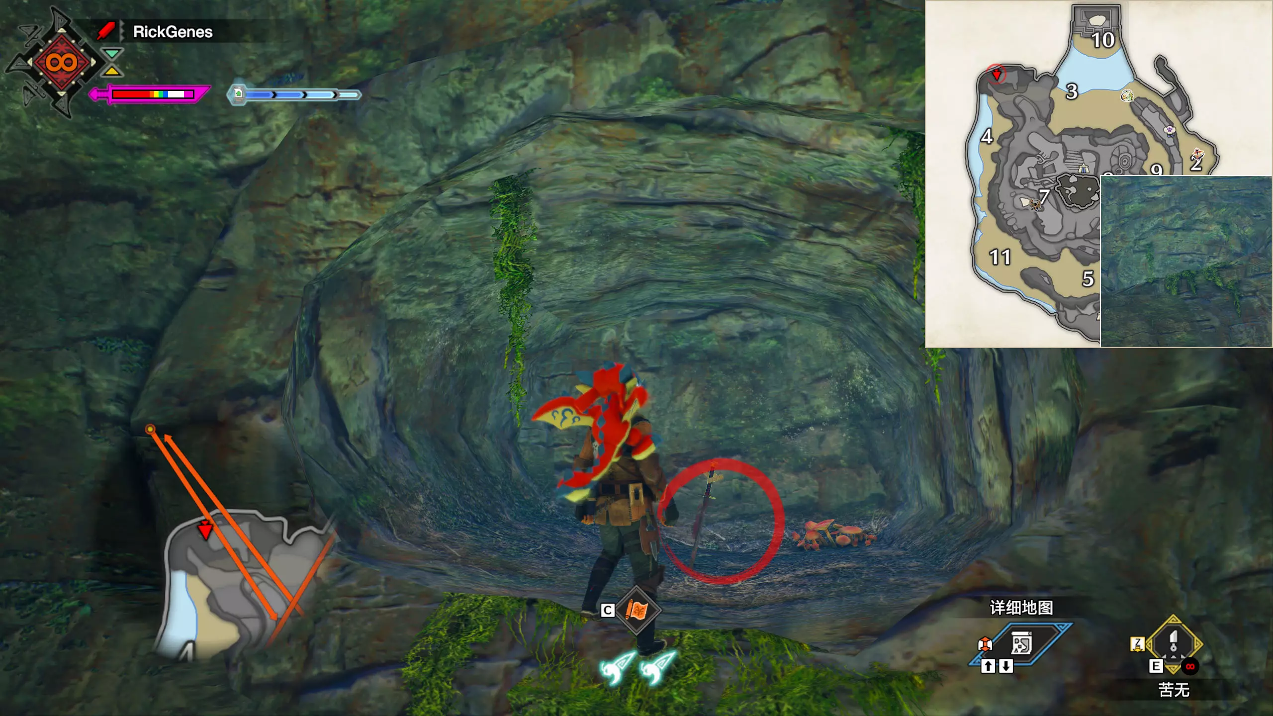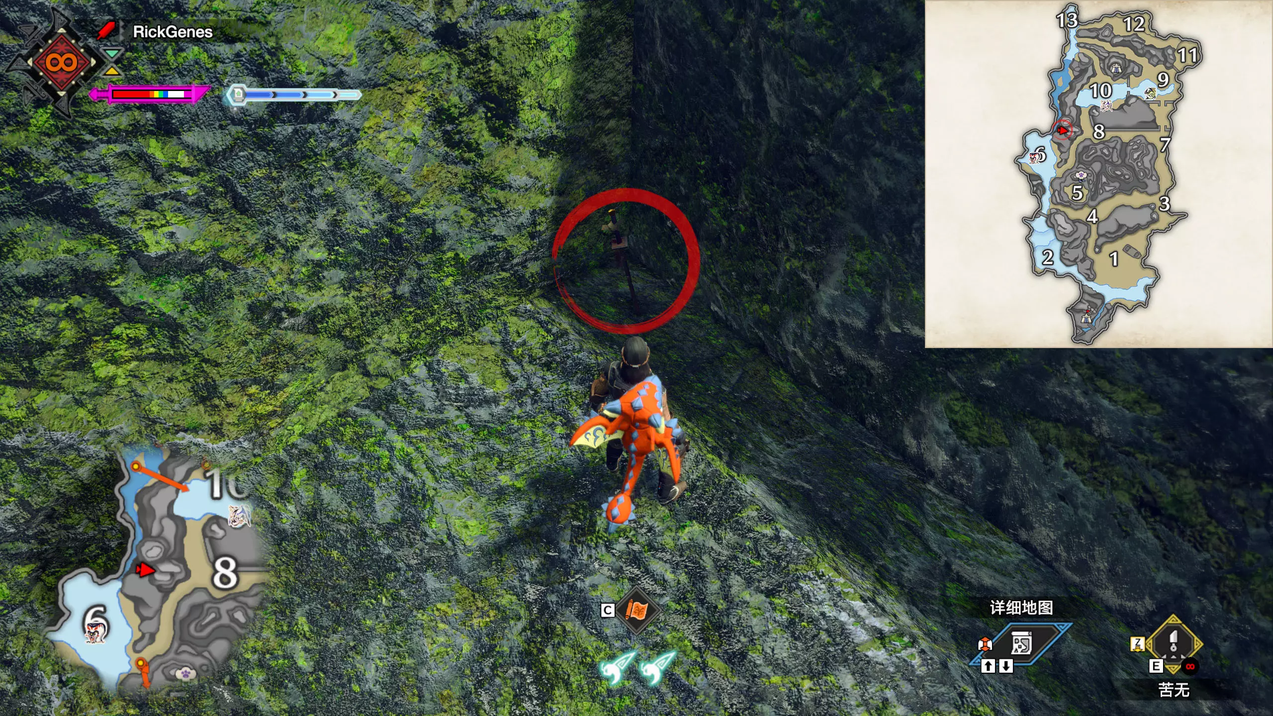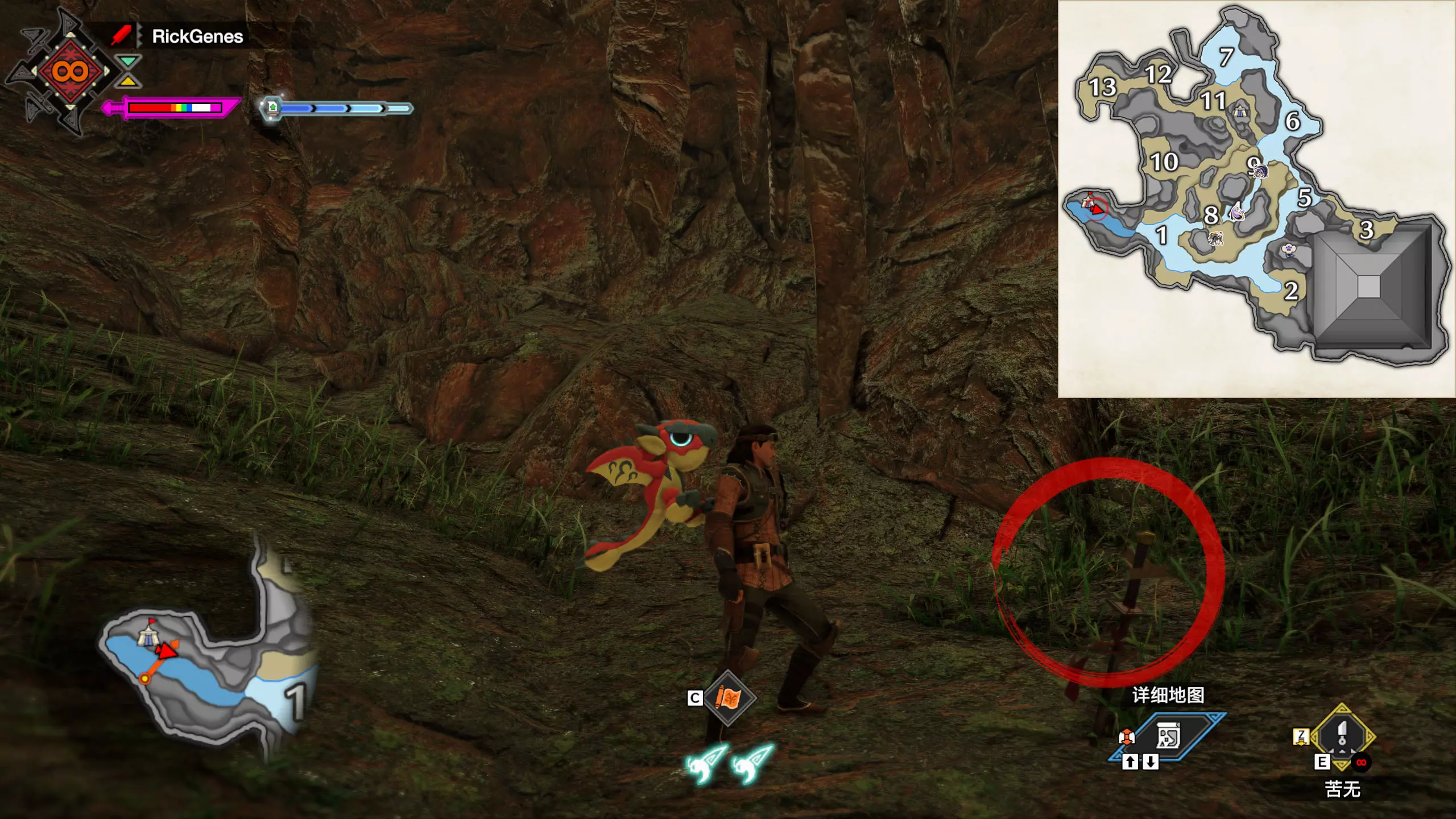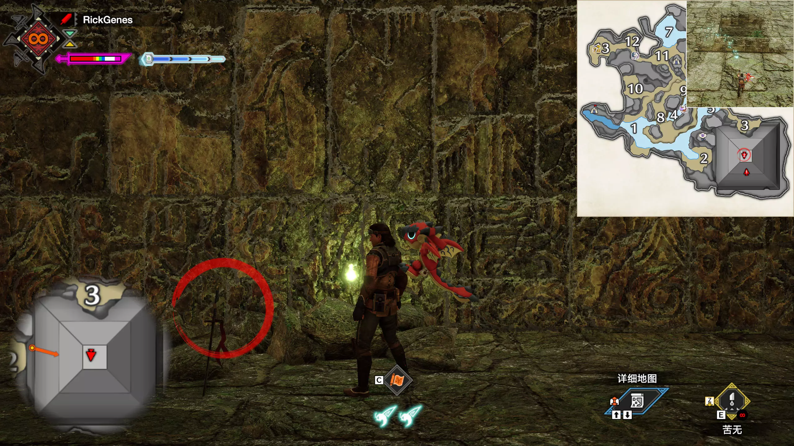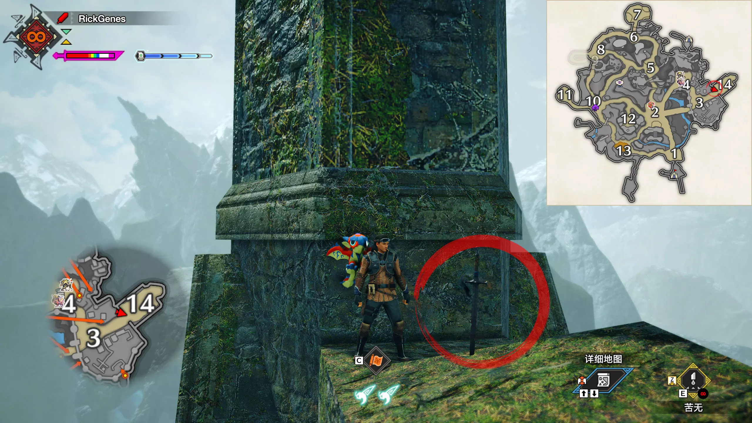 城塞高地3区右下方的大翔虫设置点需要单独说明。 全游戏唯一刁钻地点,我和朋友找了十多分钟才找到。 3区标记处有一口井,沿着井口的藤蔓慢慢往下走。 中途会看见藤蔓左方有一个洞口,进去,之后一直沿着道路走到底。