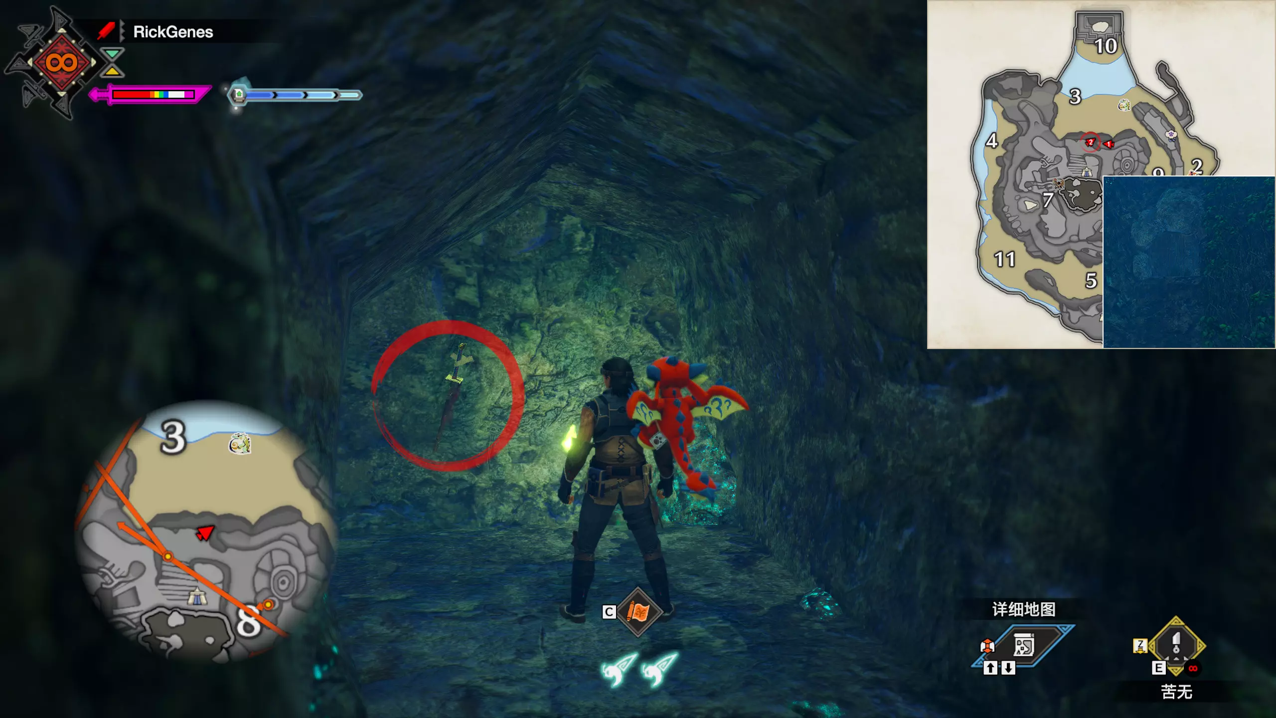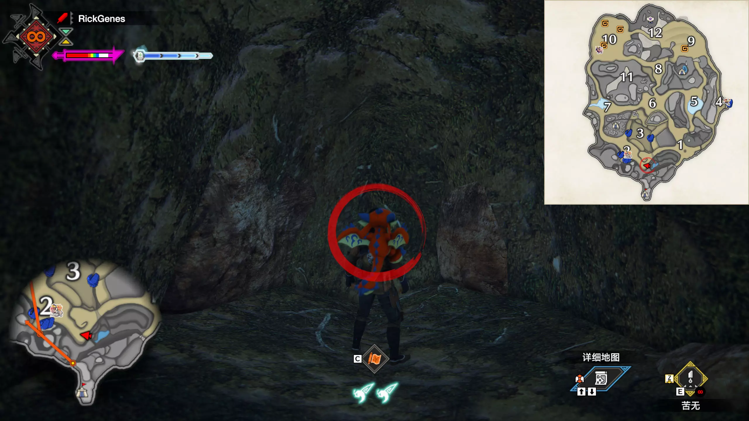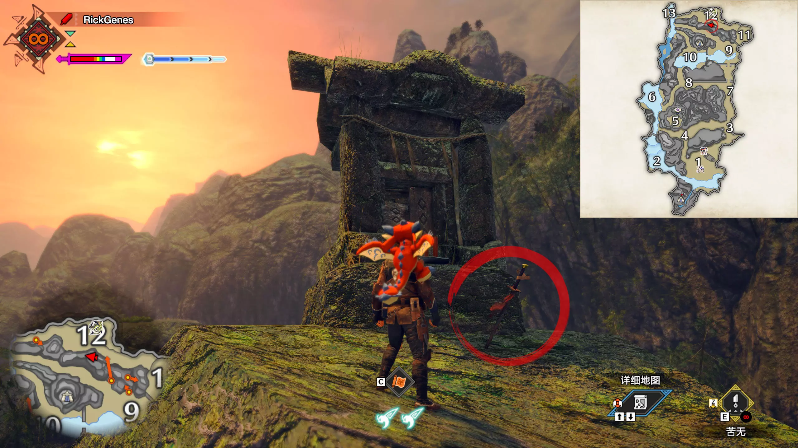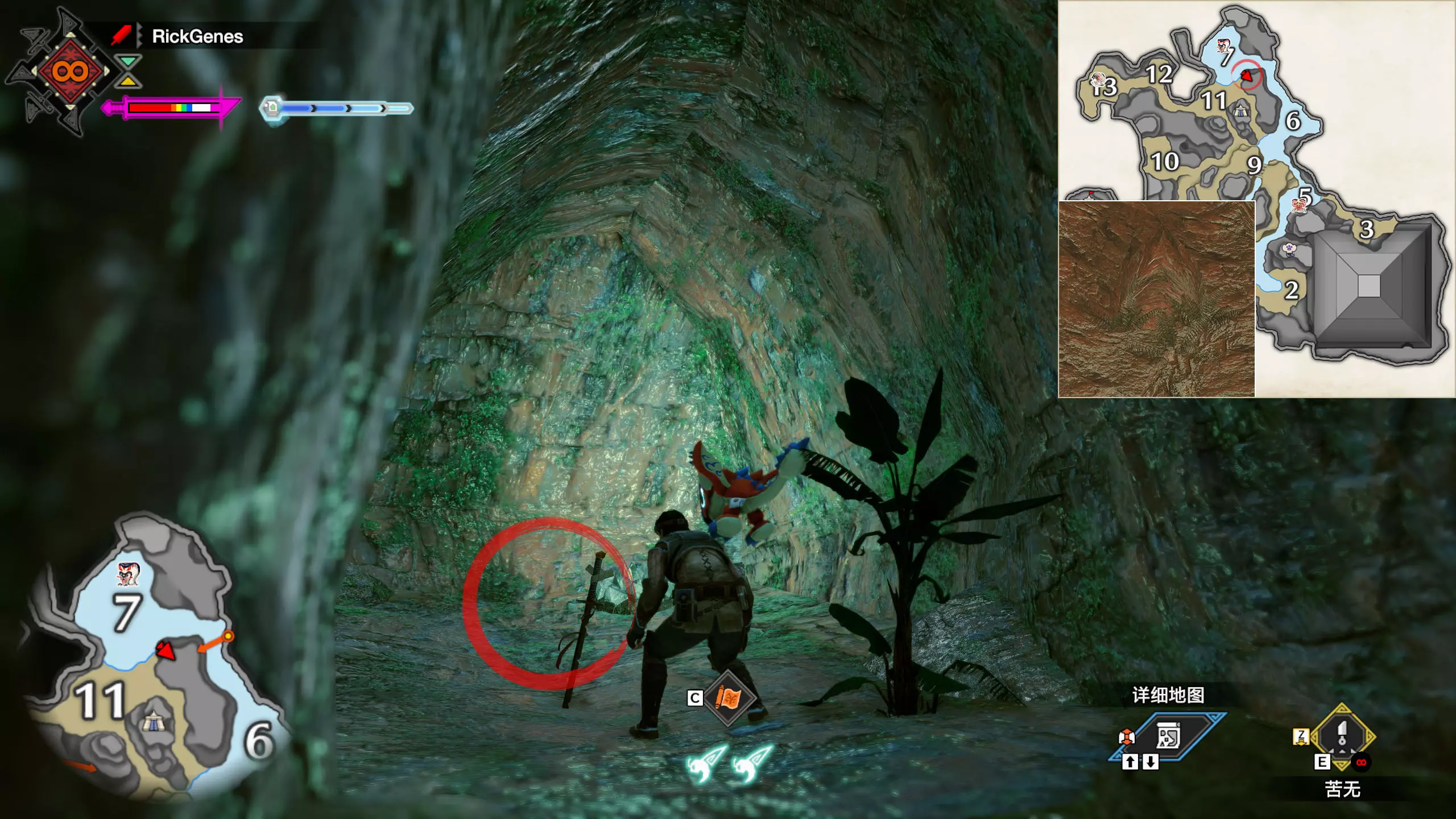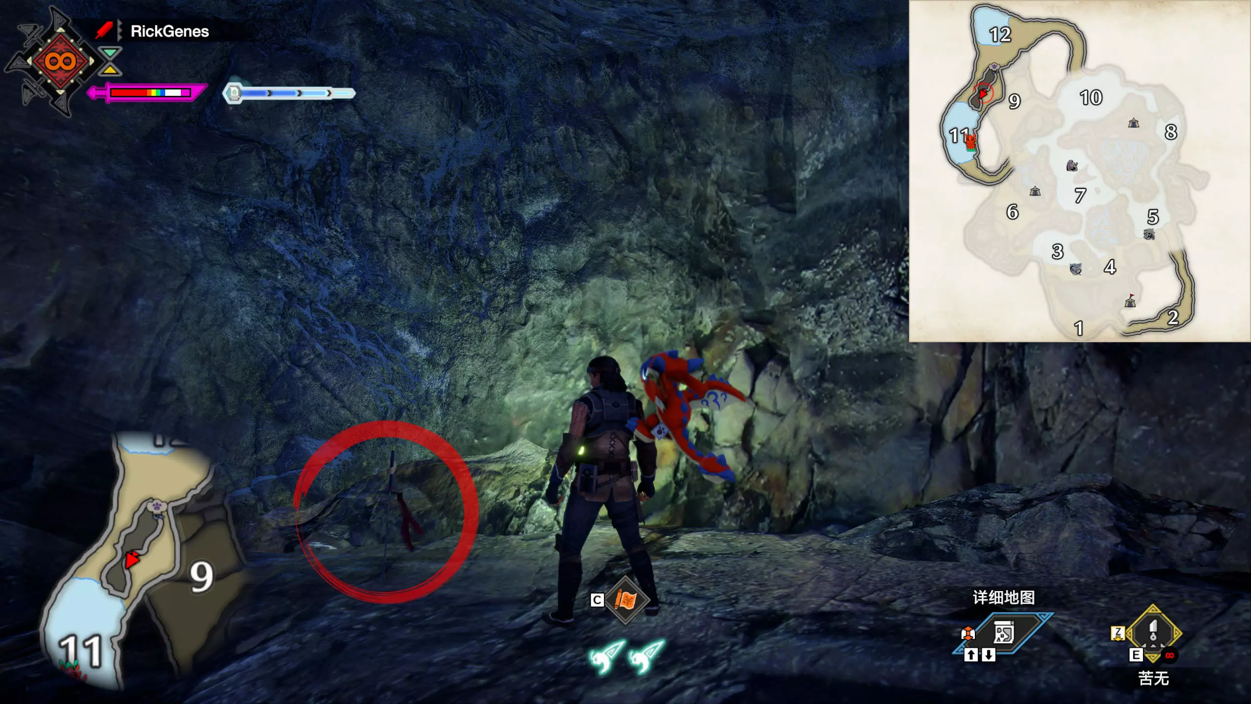 城塞高地3区右下方的大翔虫设置点需要单独说明。 全游戏唯一刁钻地点,我和朋友找了十多分钟才找到。 3区标记处有一口井,沿着井口的藤蔓慢慢往下走。 中途会看见藤蔓左方有一个洞口,进去,之后一直沿着道路走到底。