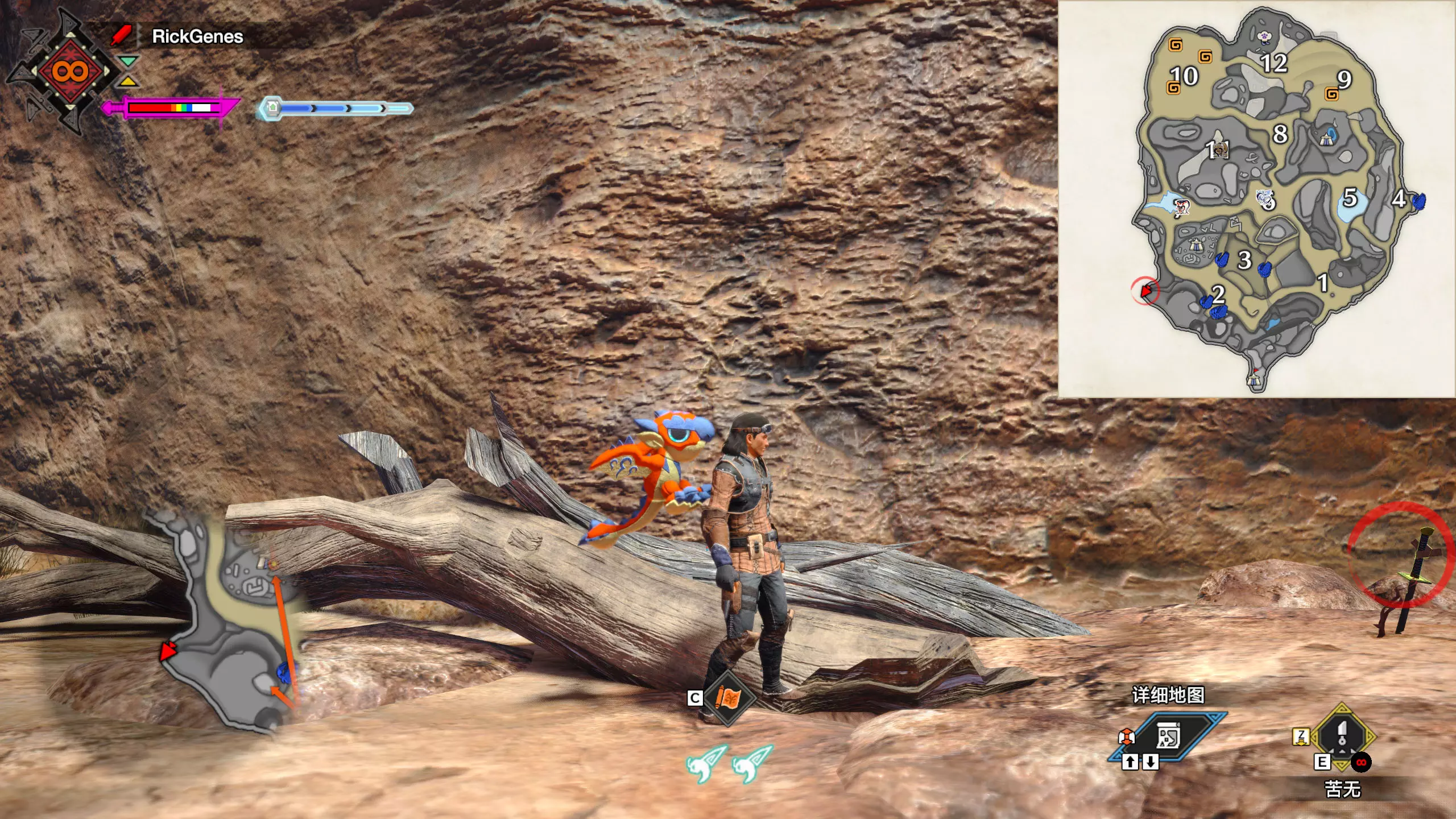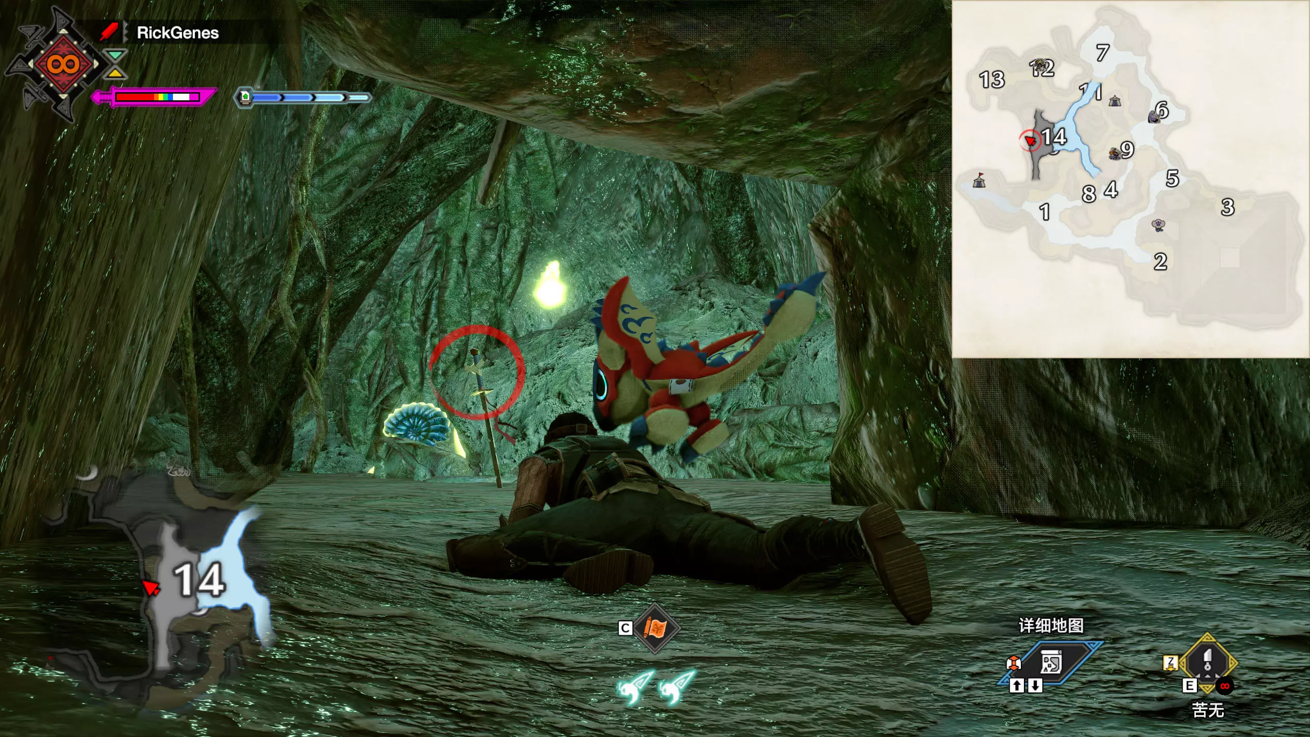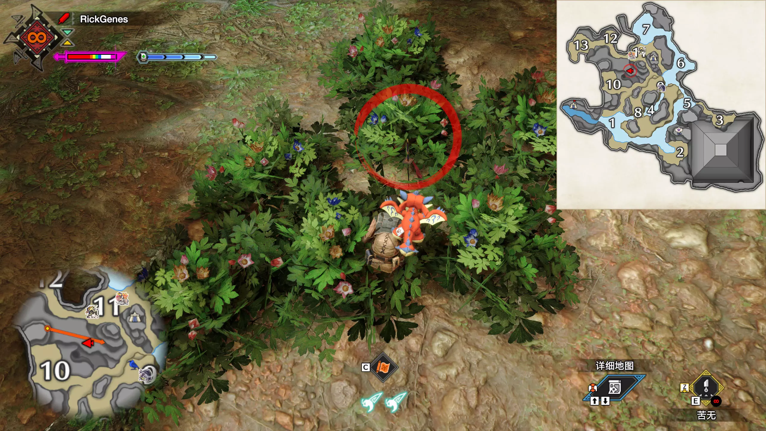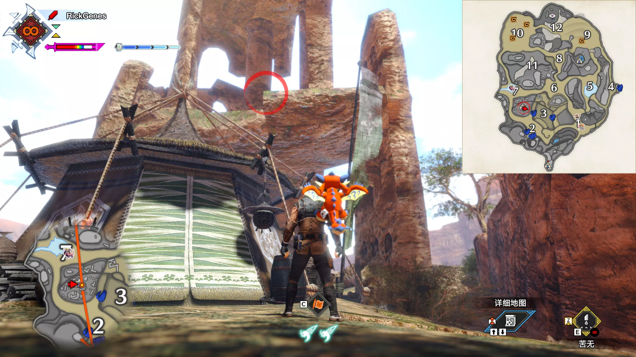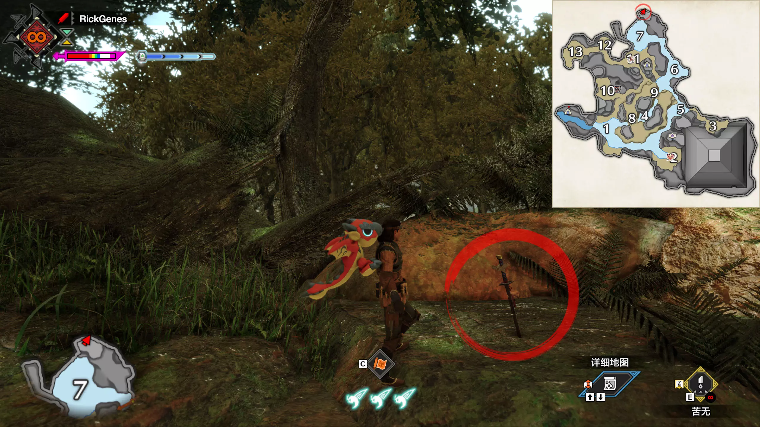 城塞高地3区右下方的大翔虫设置点需要单独说明。 全游戏唯一刁钻地点,我和朋友找了十多分钟才找到。 3区标记处有一口井,沿着井口的藤蔓慢慢往下走。 中途会看见藤蔓左方有一个洞口,进去,之后一直沿着道路走到底。