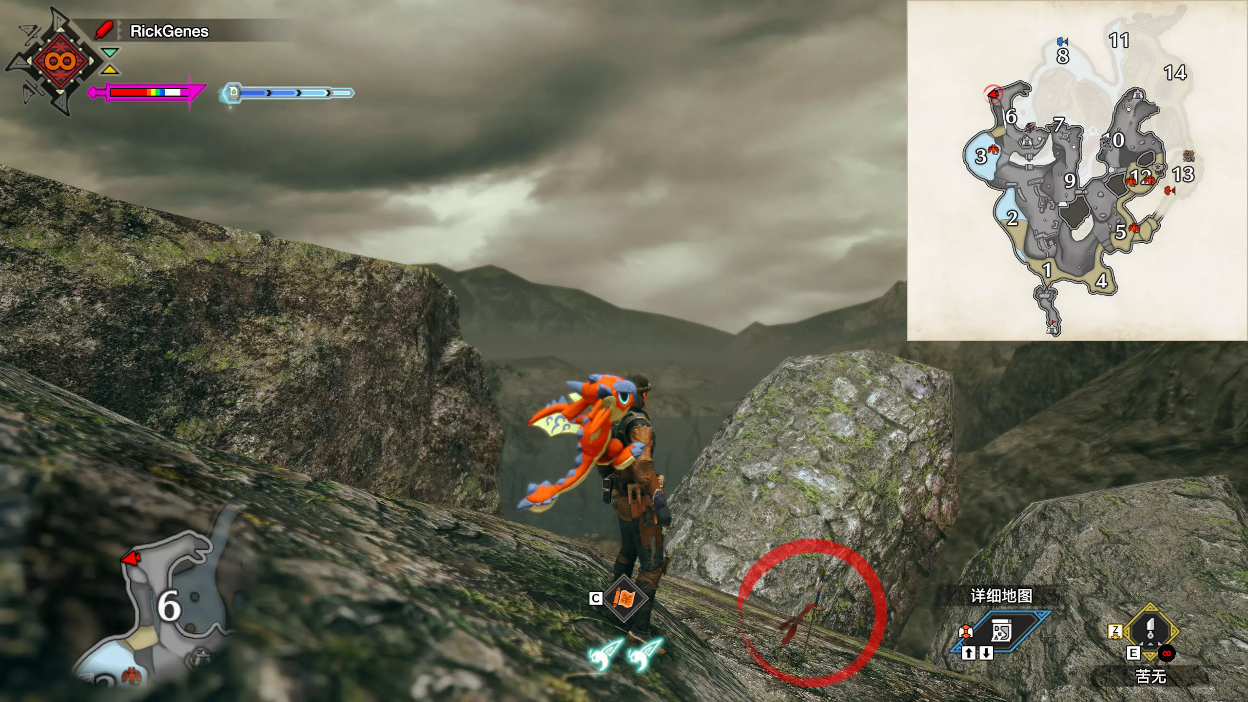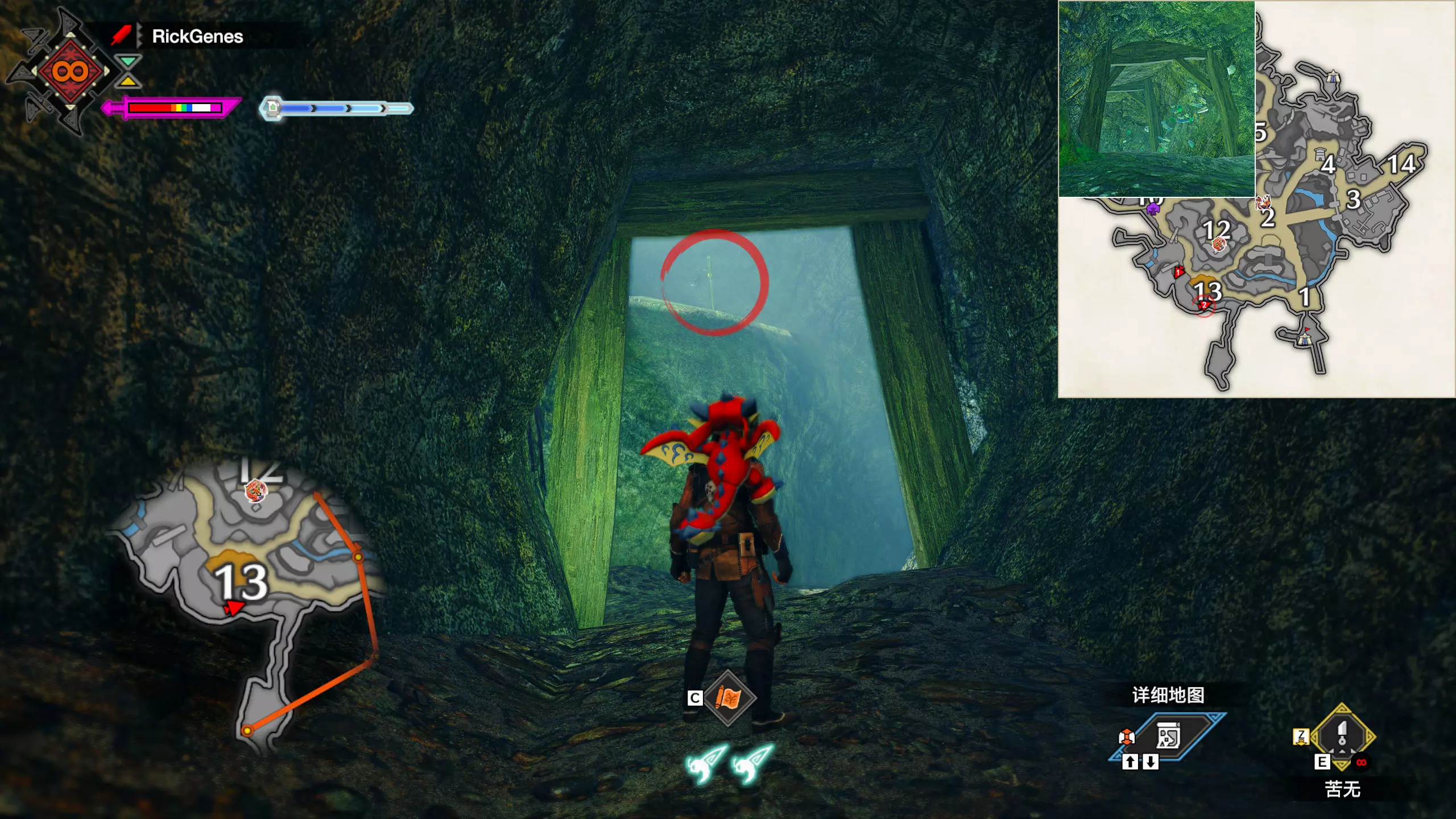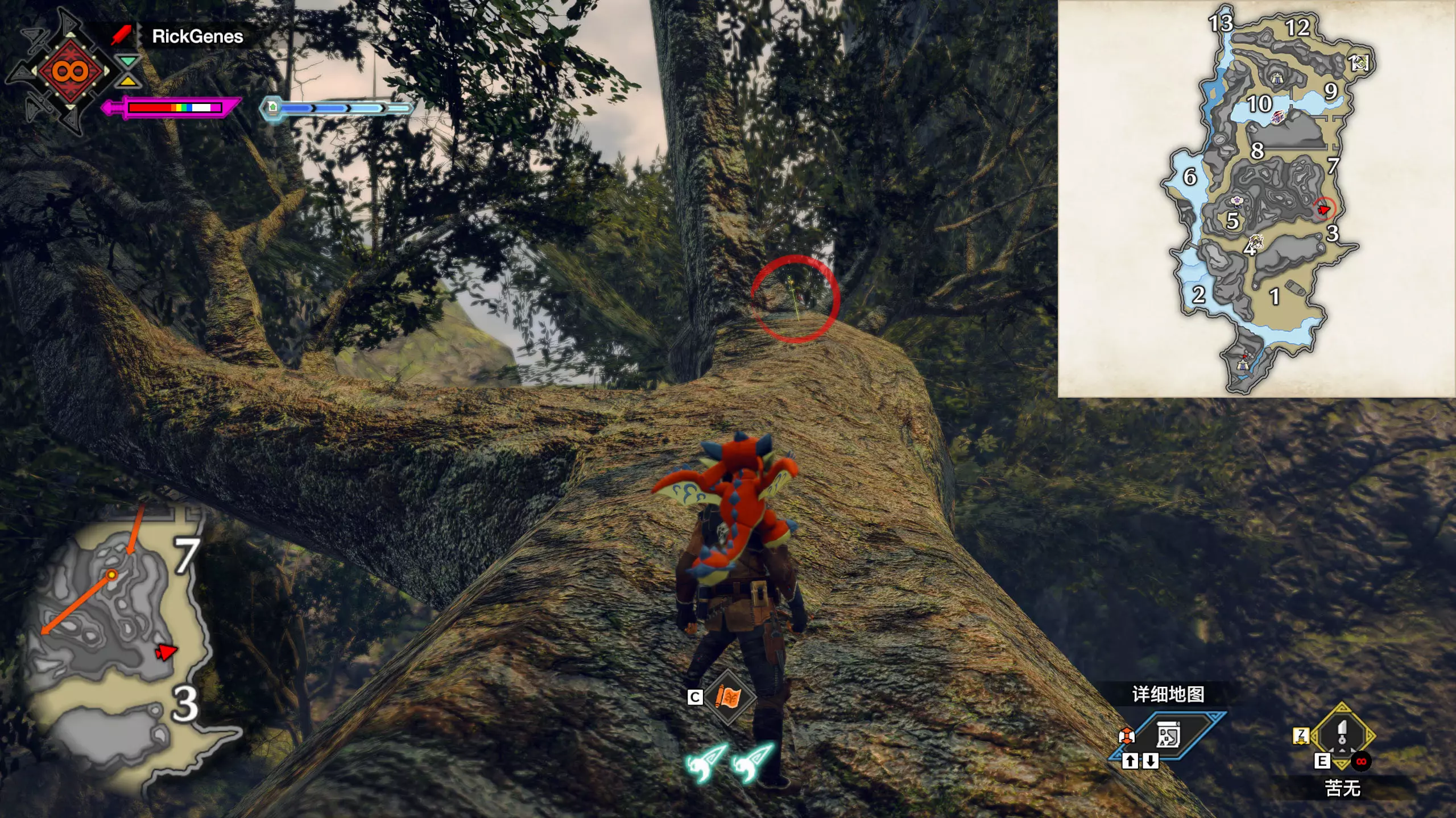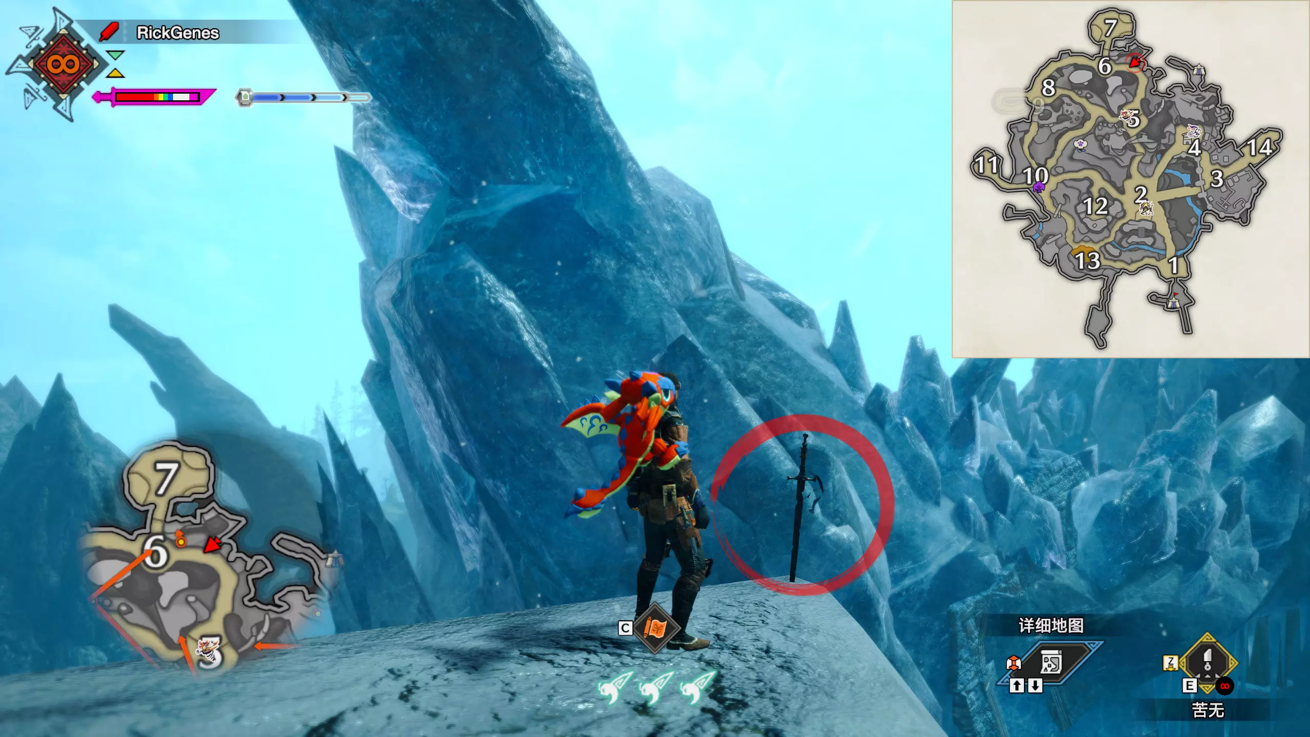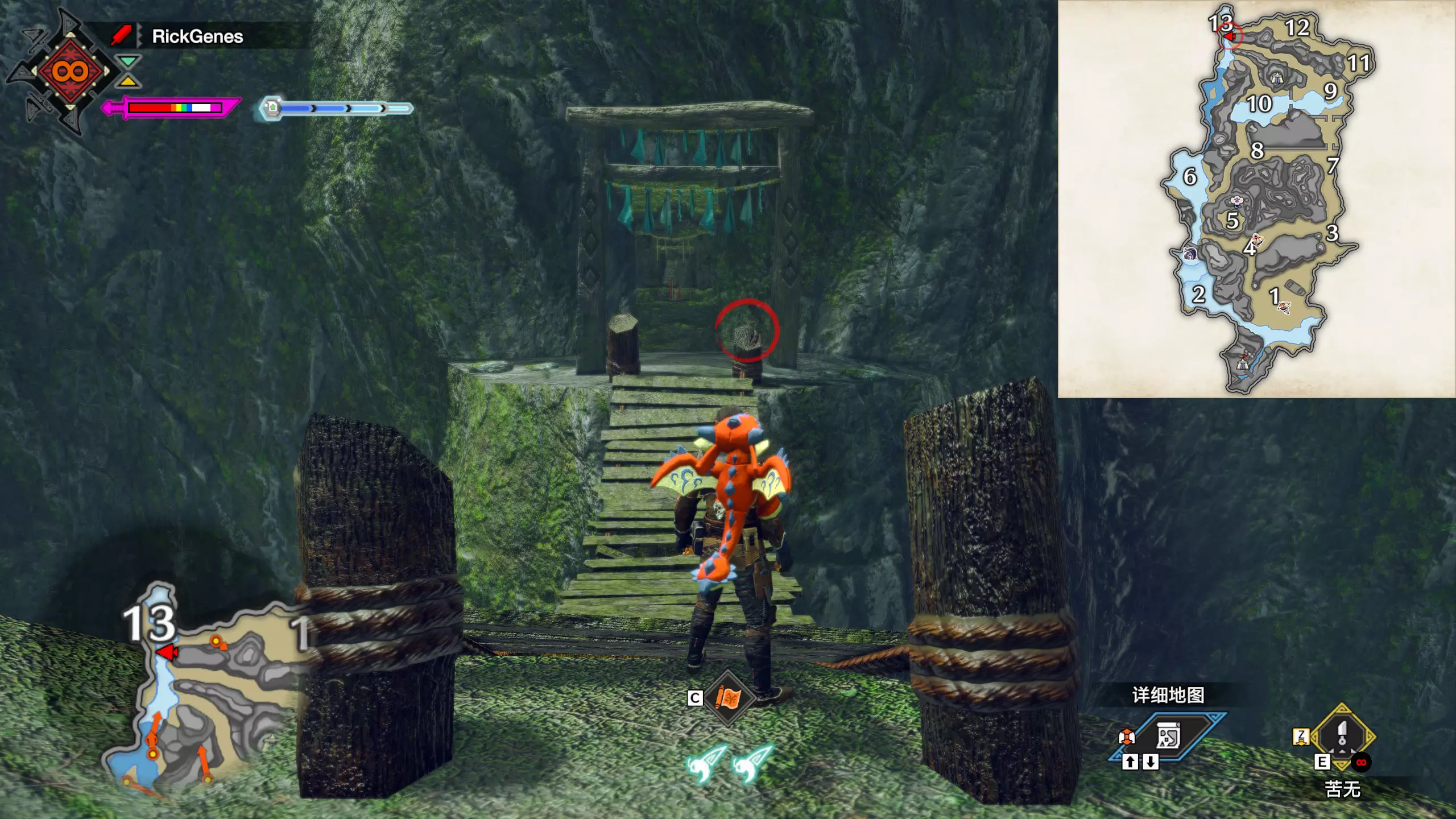 城塞高地3区右下方的大翔虫设置点需要单独说明。 全游戏唯一刁钻地点,我和朋友找了十多分钟才找到。 3区标记处有一口井,沿着井口的藤蔓慢慢往下走。 中途会看见藤蔓左方有一个洞口,进去,之后一直沿着道路走到底。