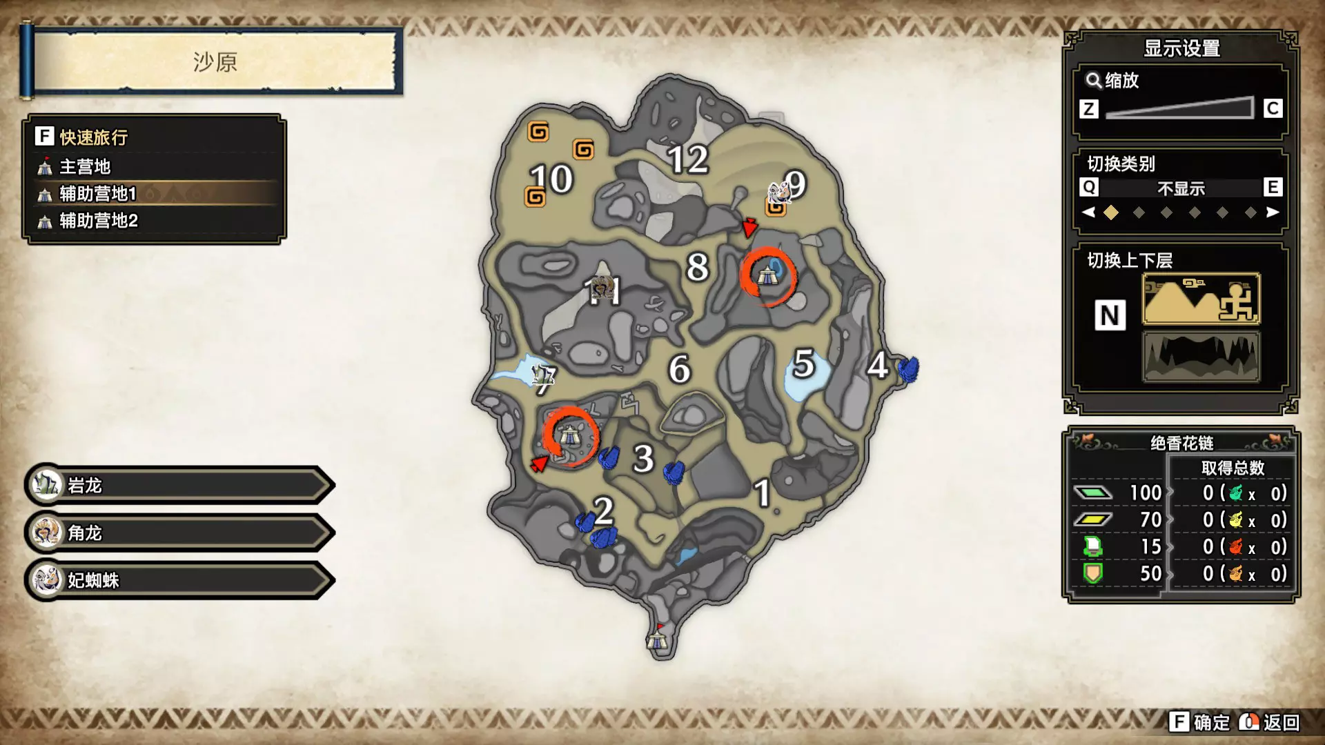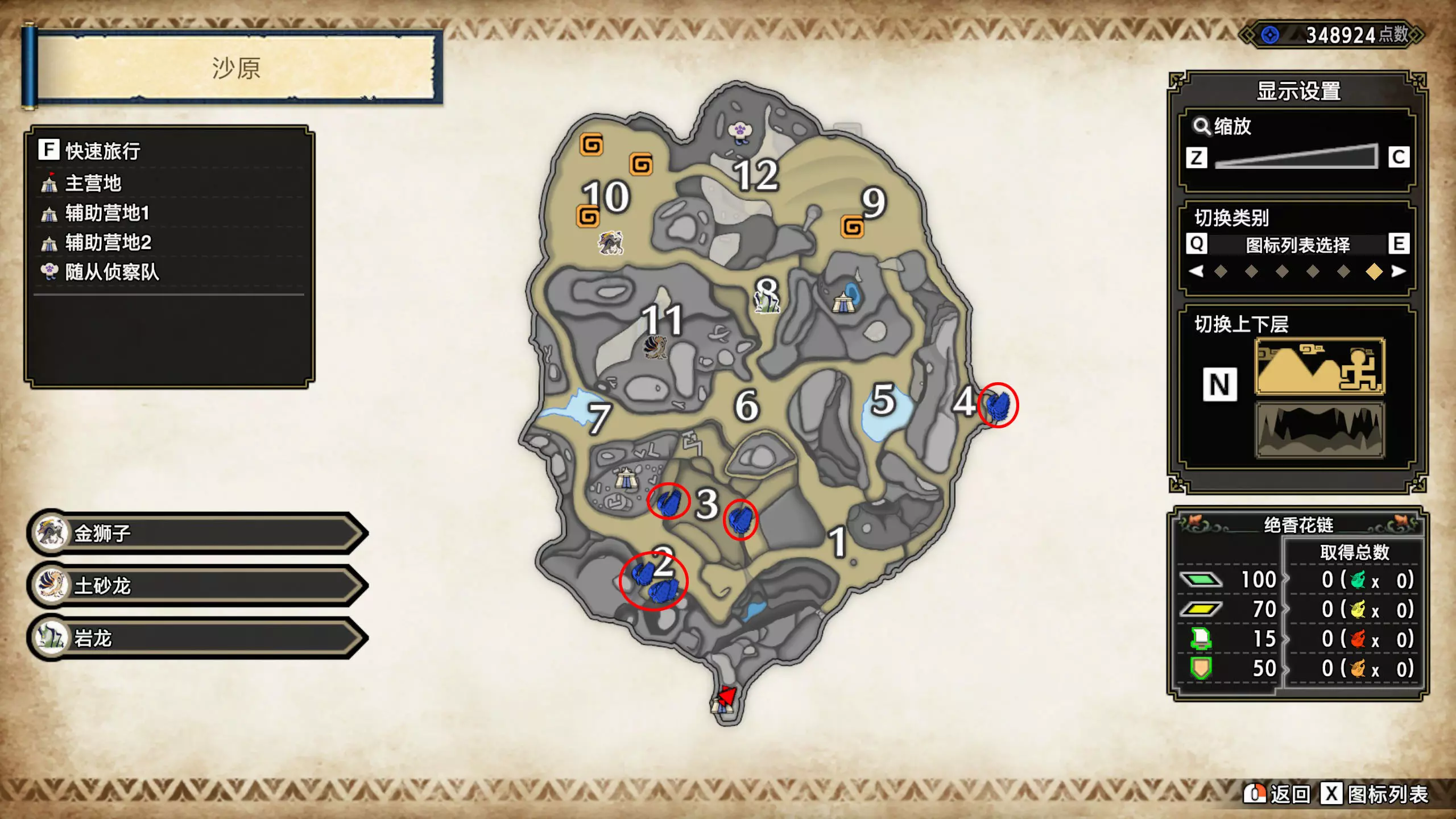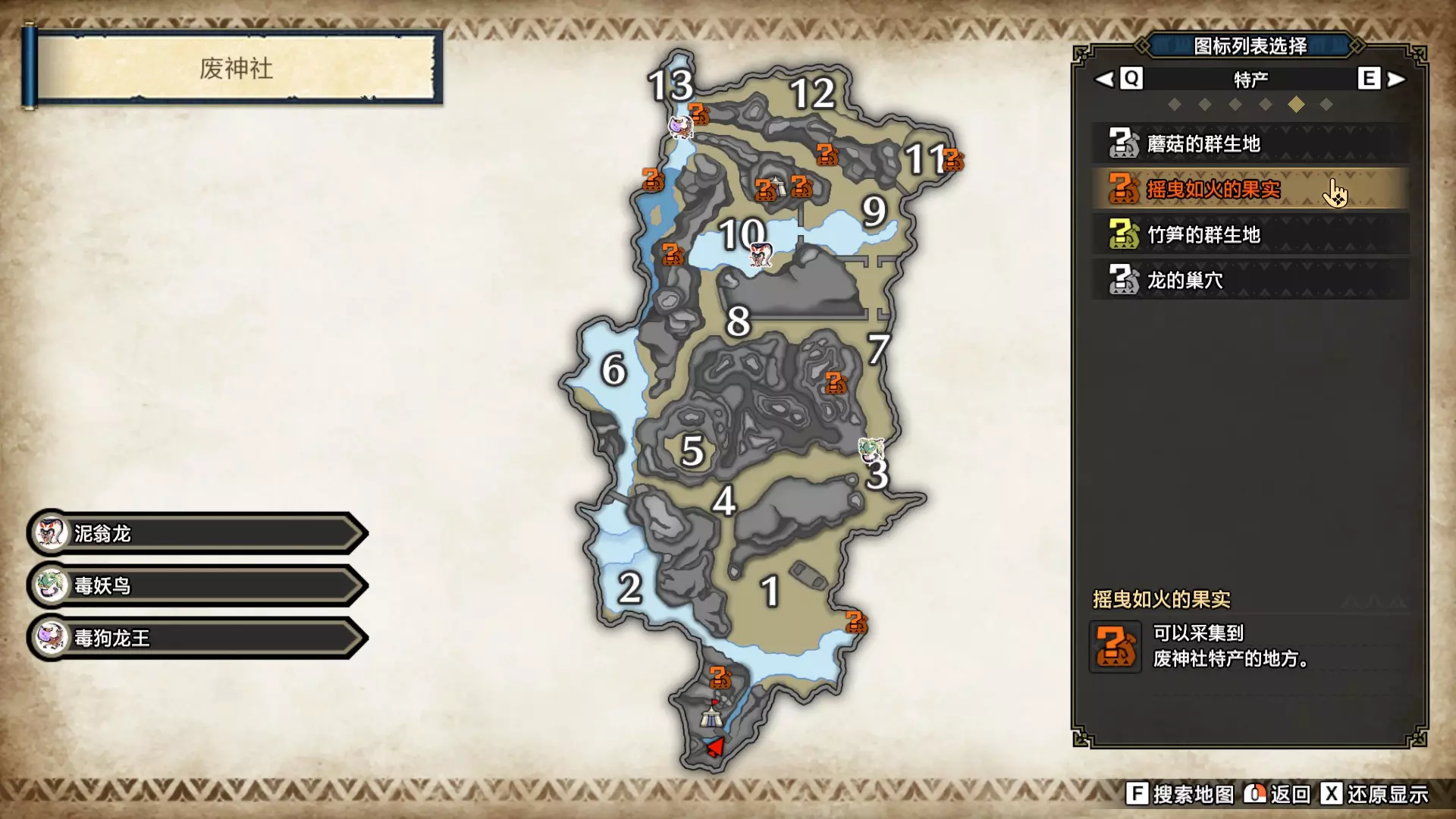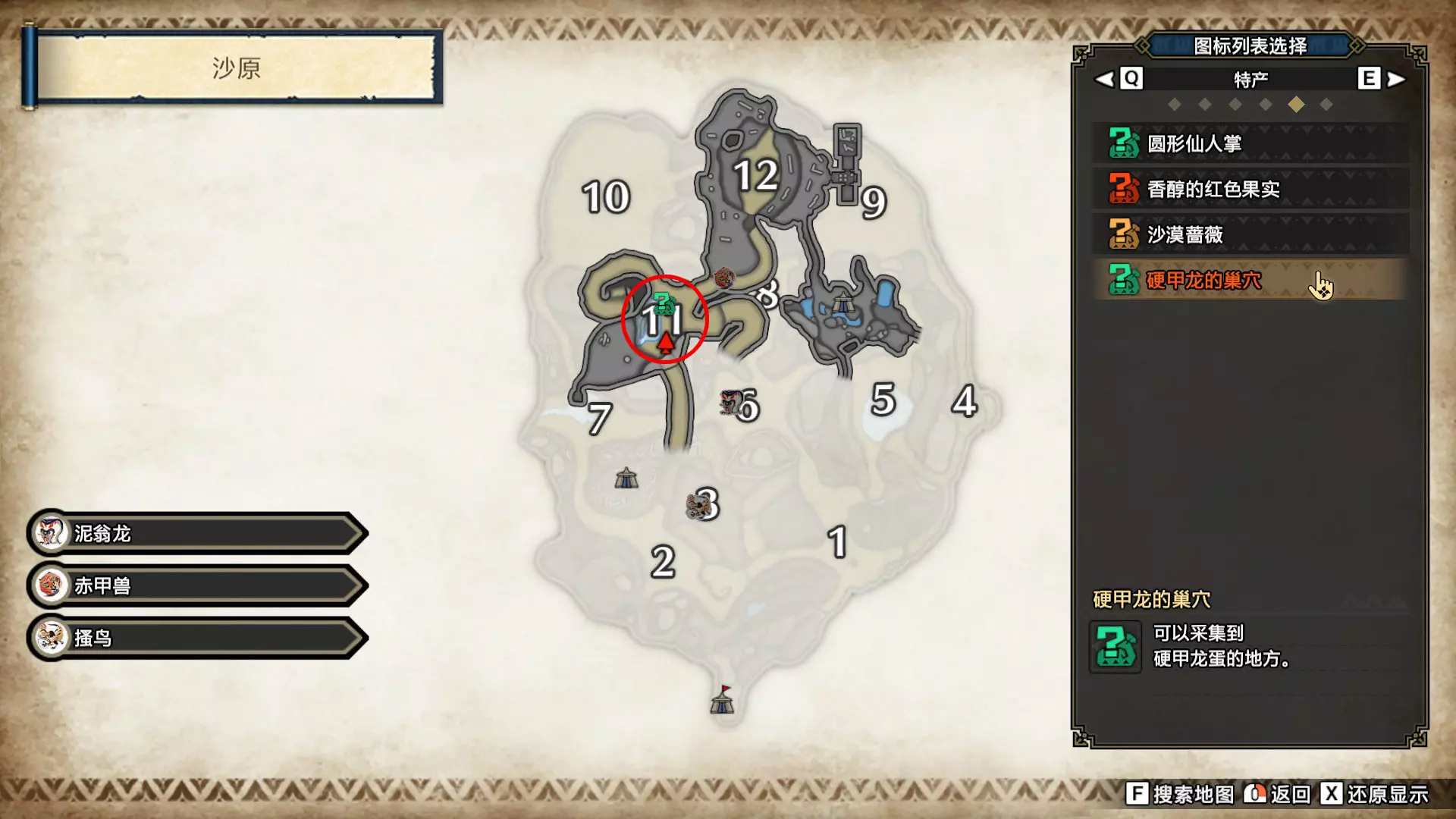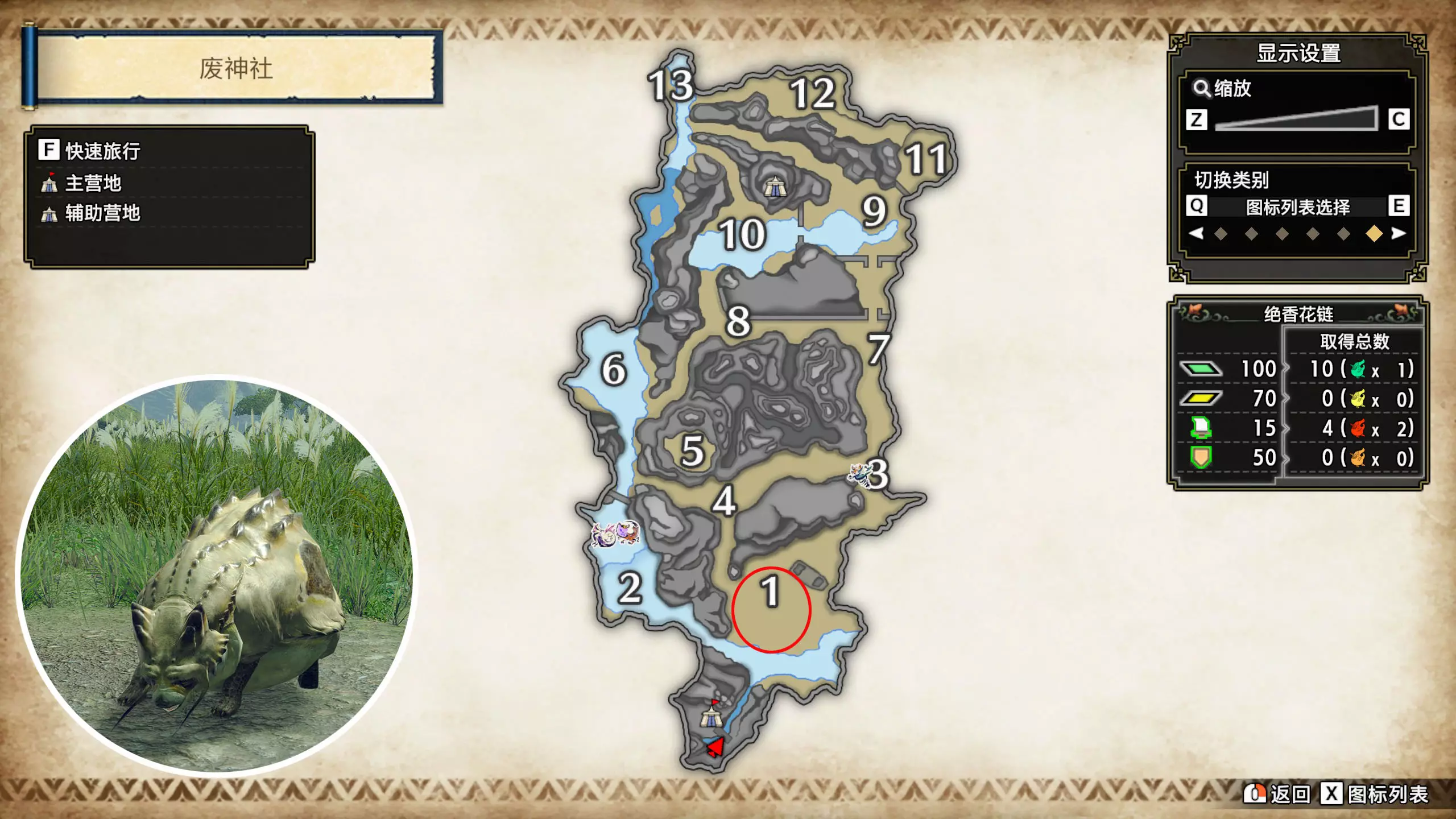 打开地图,按X显示图例,切换到原野。 选中【勾玉草(未发现)】便可在地图上显示未设置大翔虫的勾玉草。 勾玉草位置基本没有什么难度,知道方位,基本都能找到,按照下图排除即可。
