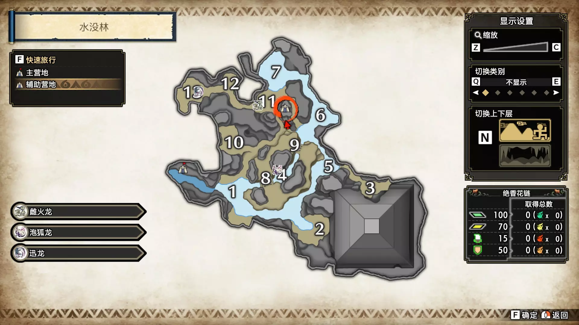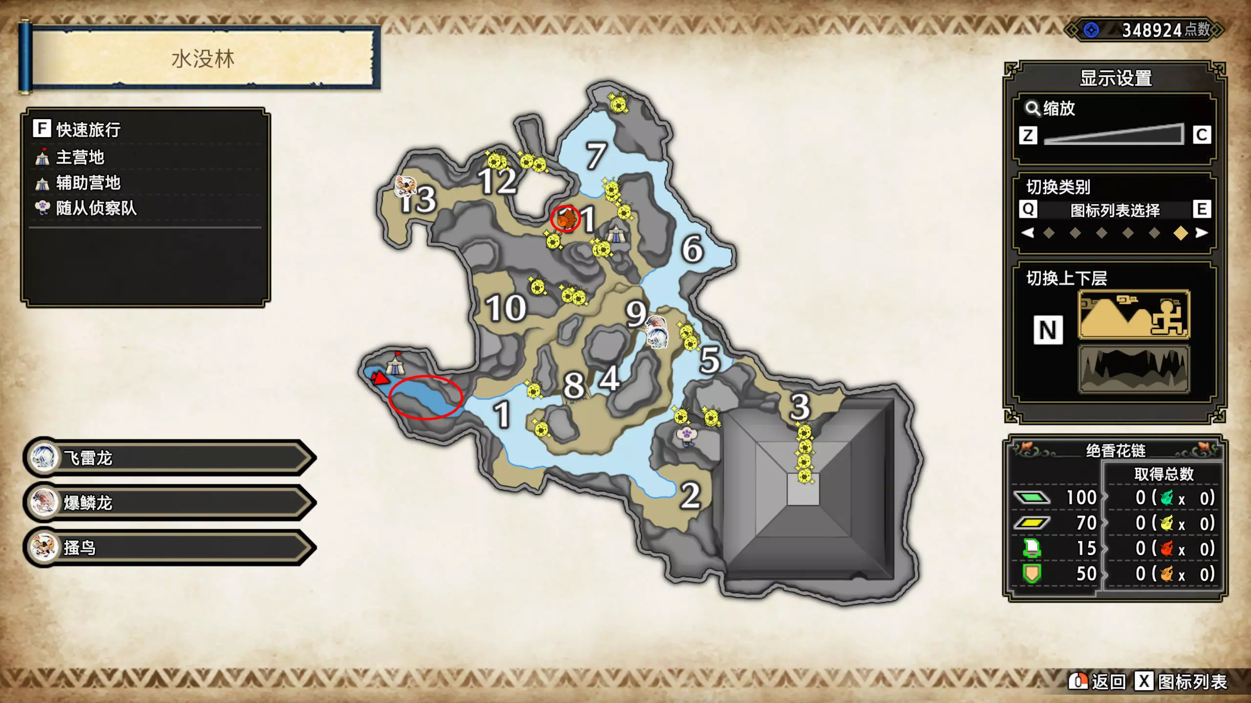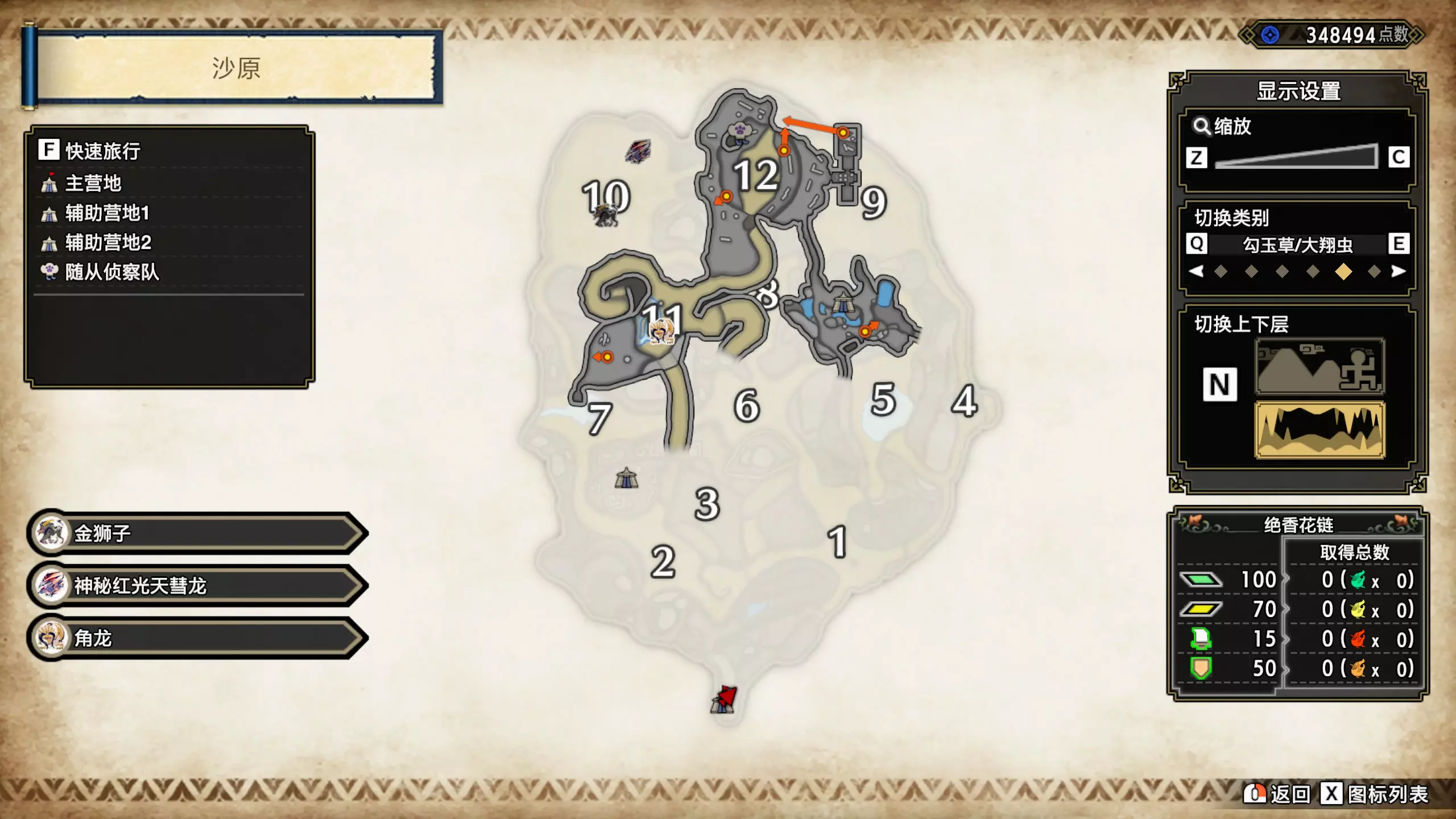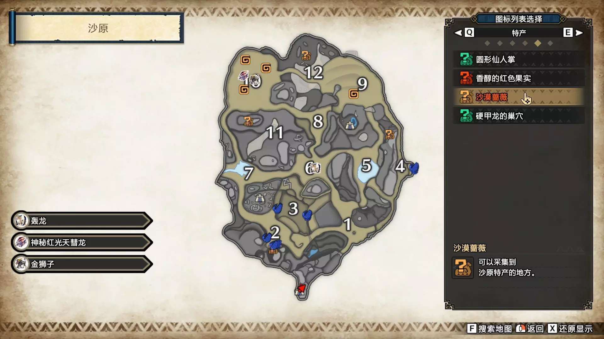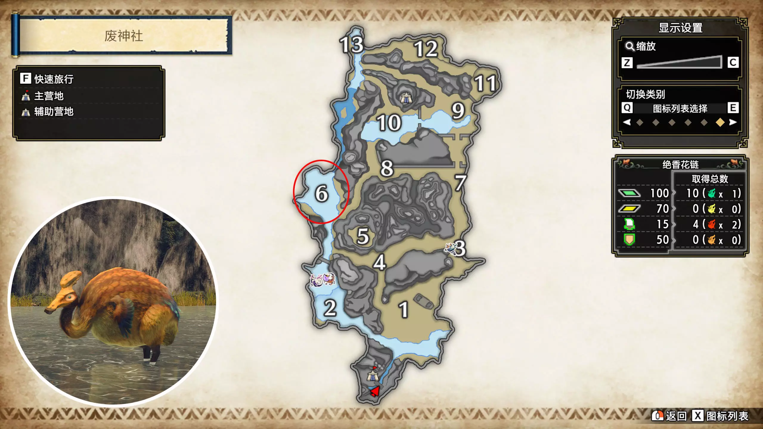 打开地图,按X显示图例,切换到原野。 选中【勾玉草(未发现)】便可在地图上显示未设置大翔虫的勾玉草。 勾玉草位置基本没有什么难度,知道方位,基本都能找到,按照下图排除即可。