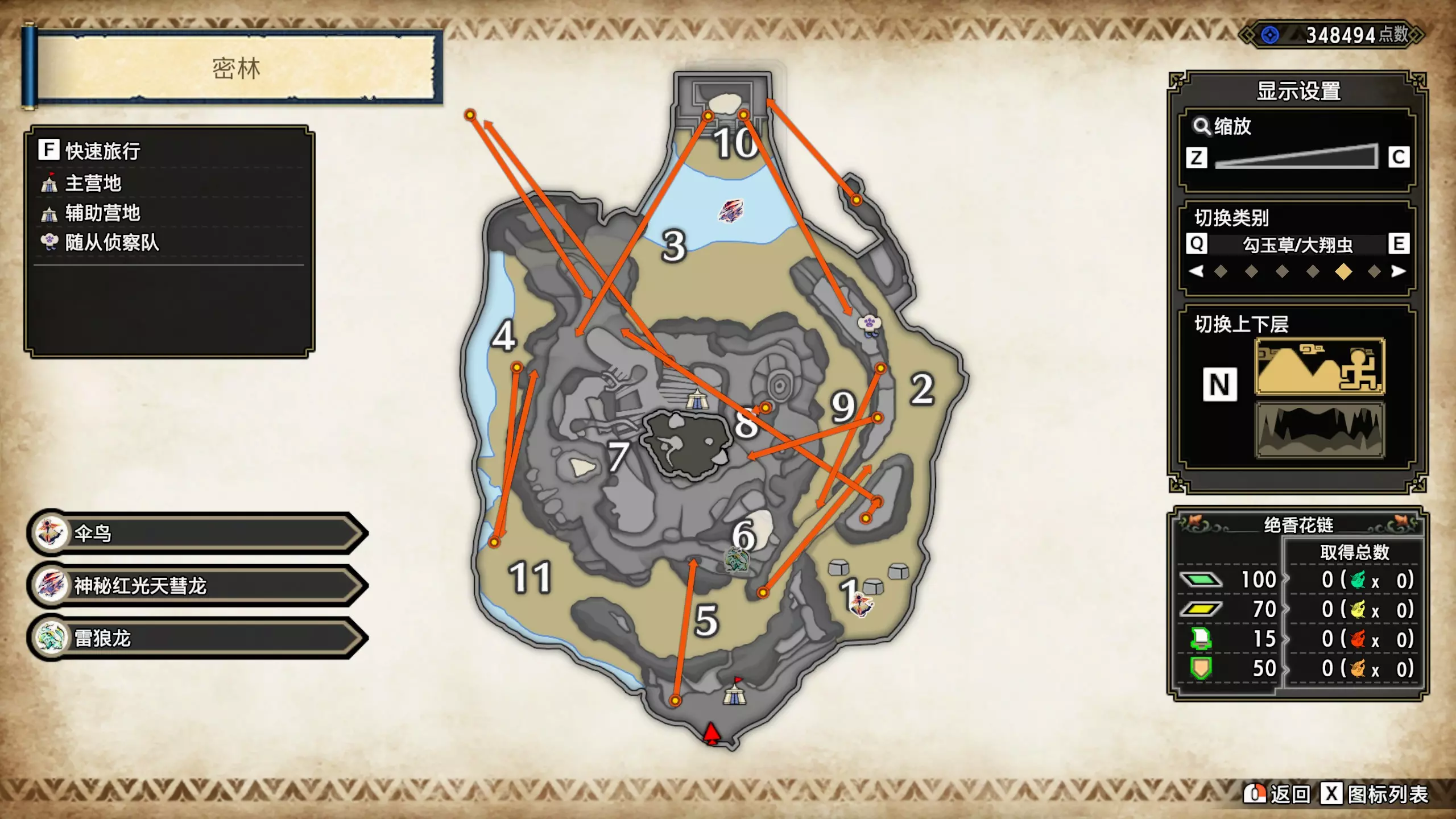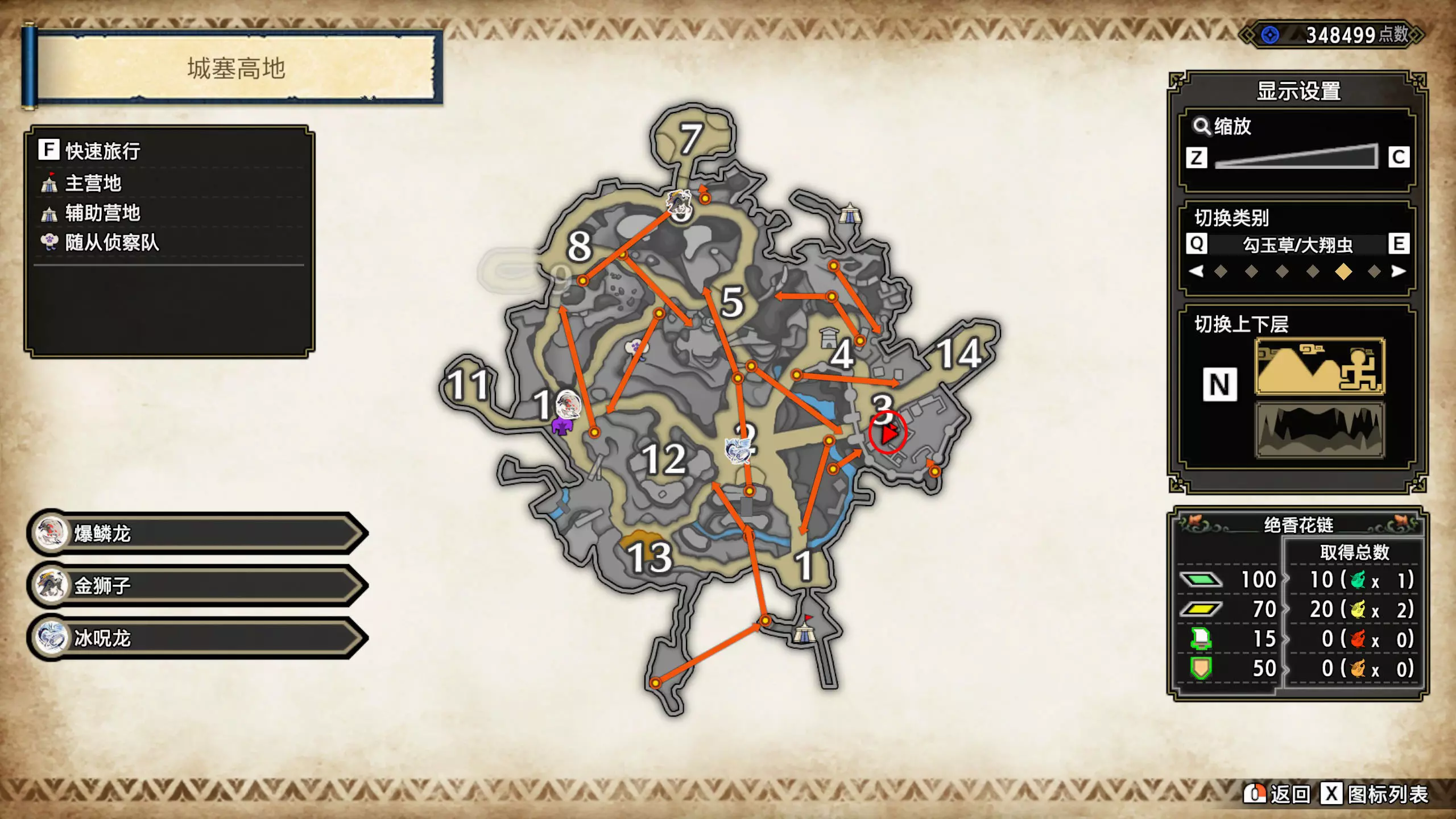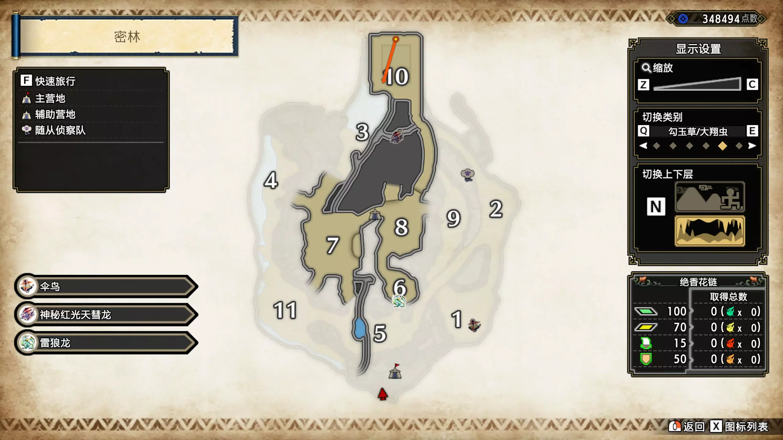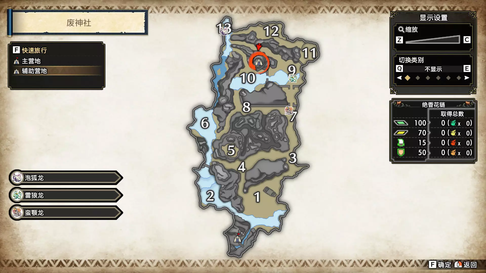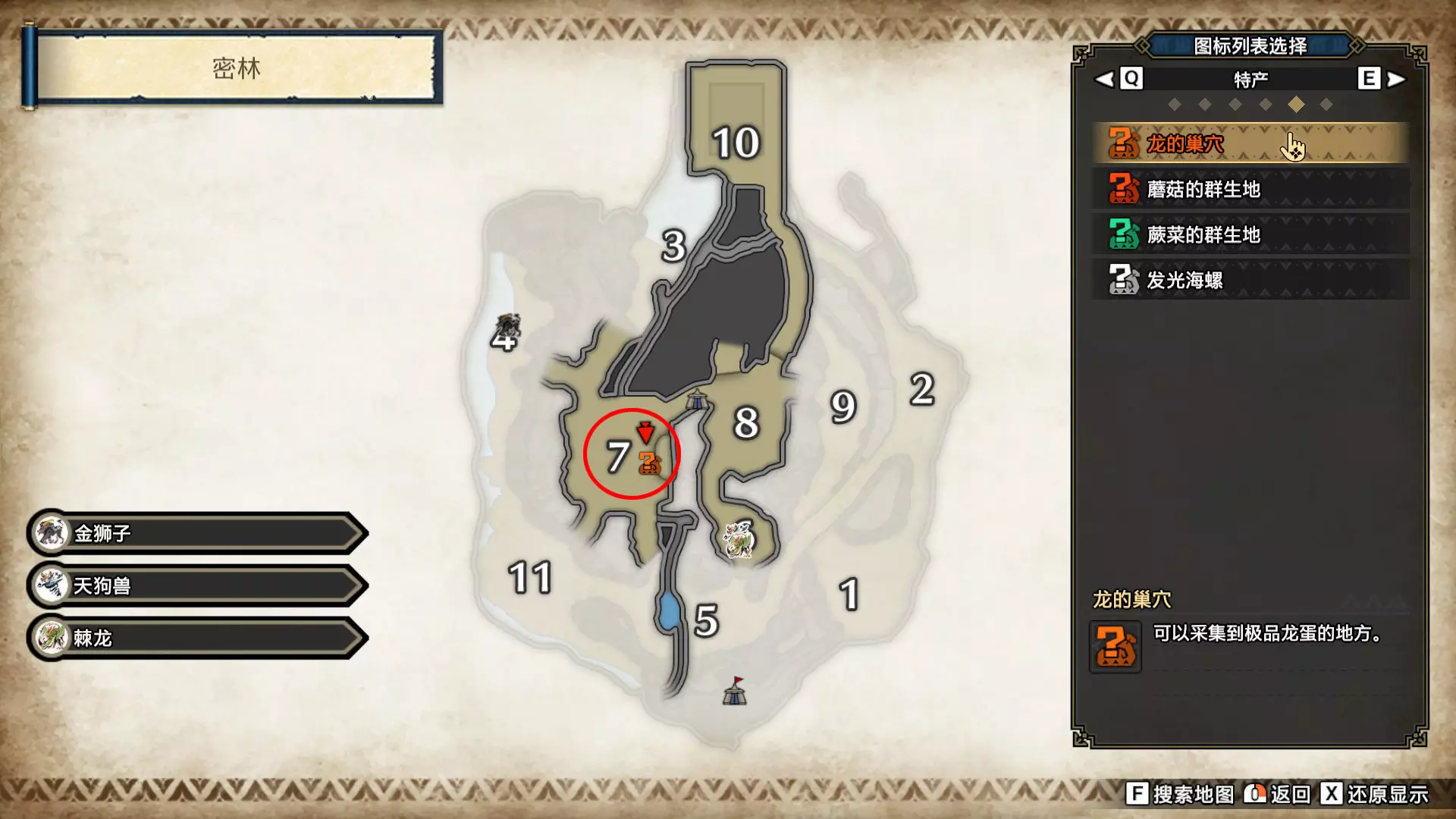 打开地图,按X显示图例,切换到原野。 选中【勾玉草(未发现)】便可在地图上显示未设置大翔虫的勾玉草。 勾玉草位置基本没有什么难度,知道方位,基本都能找到,按照下图排除即可。