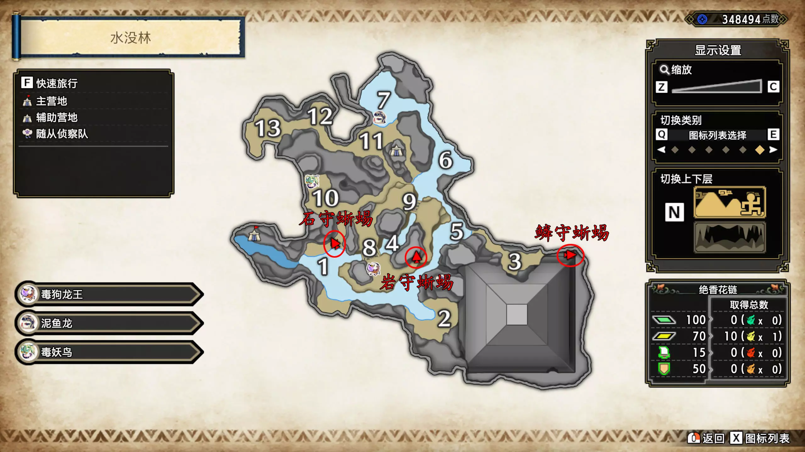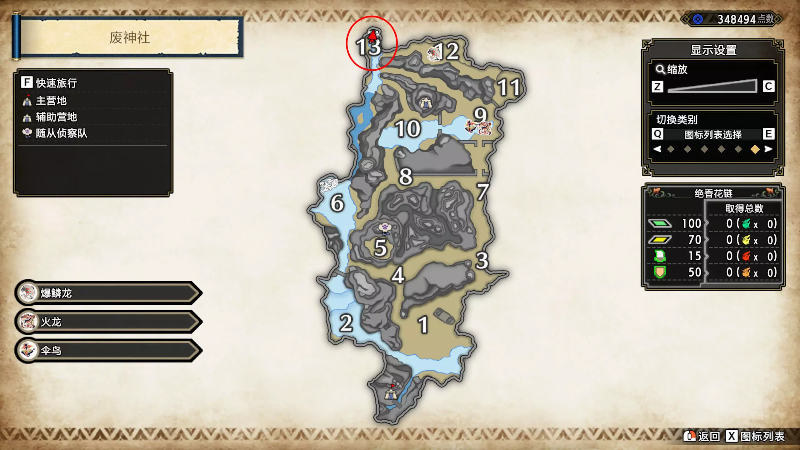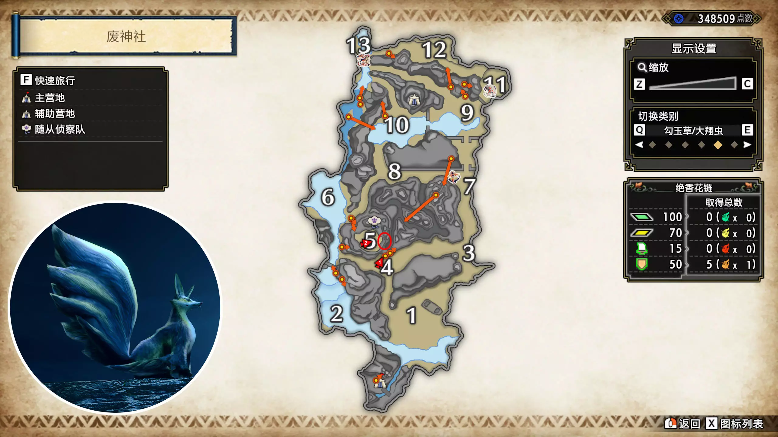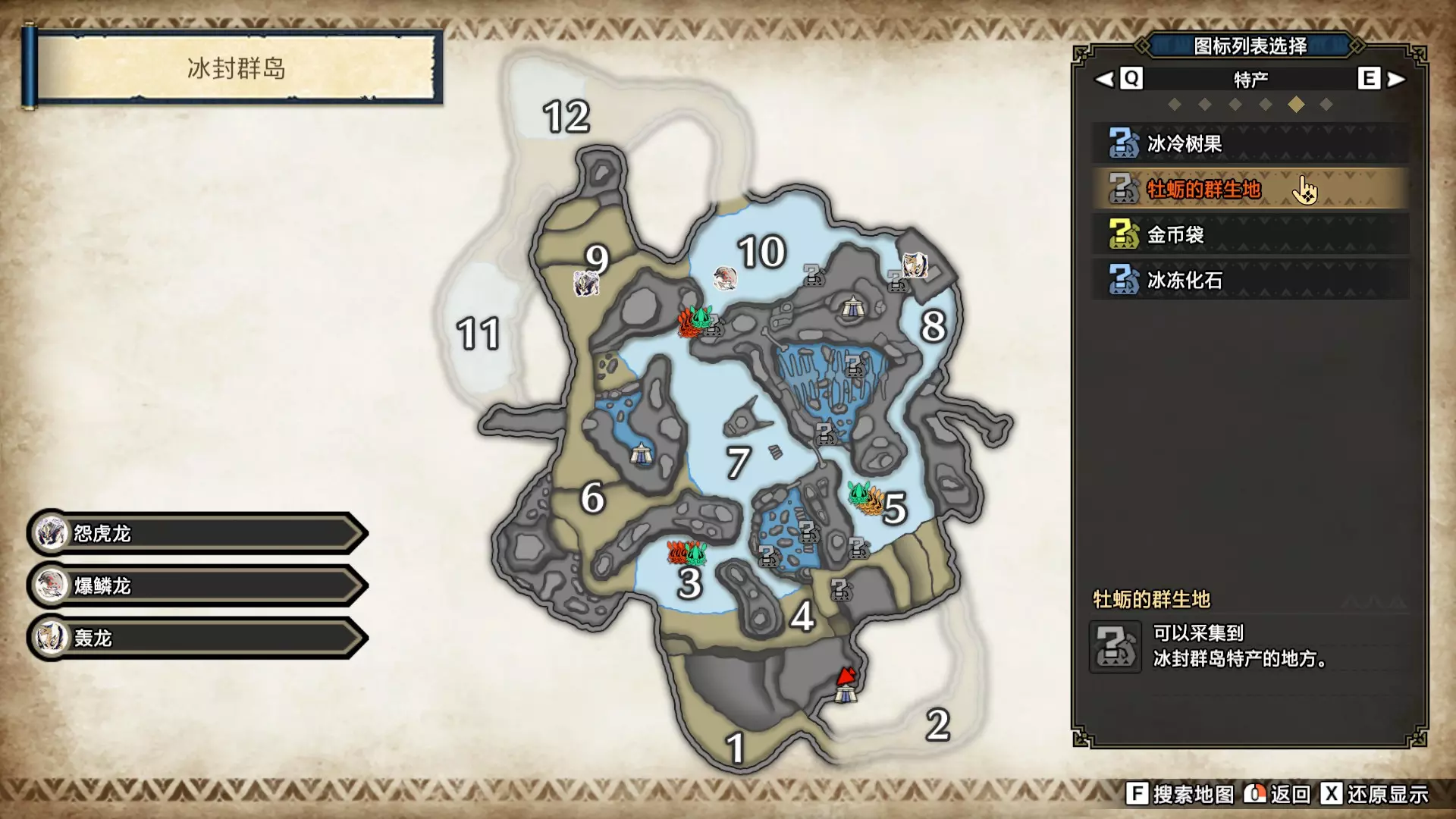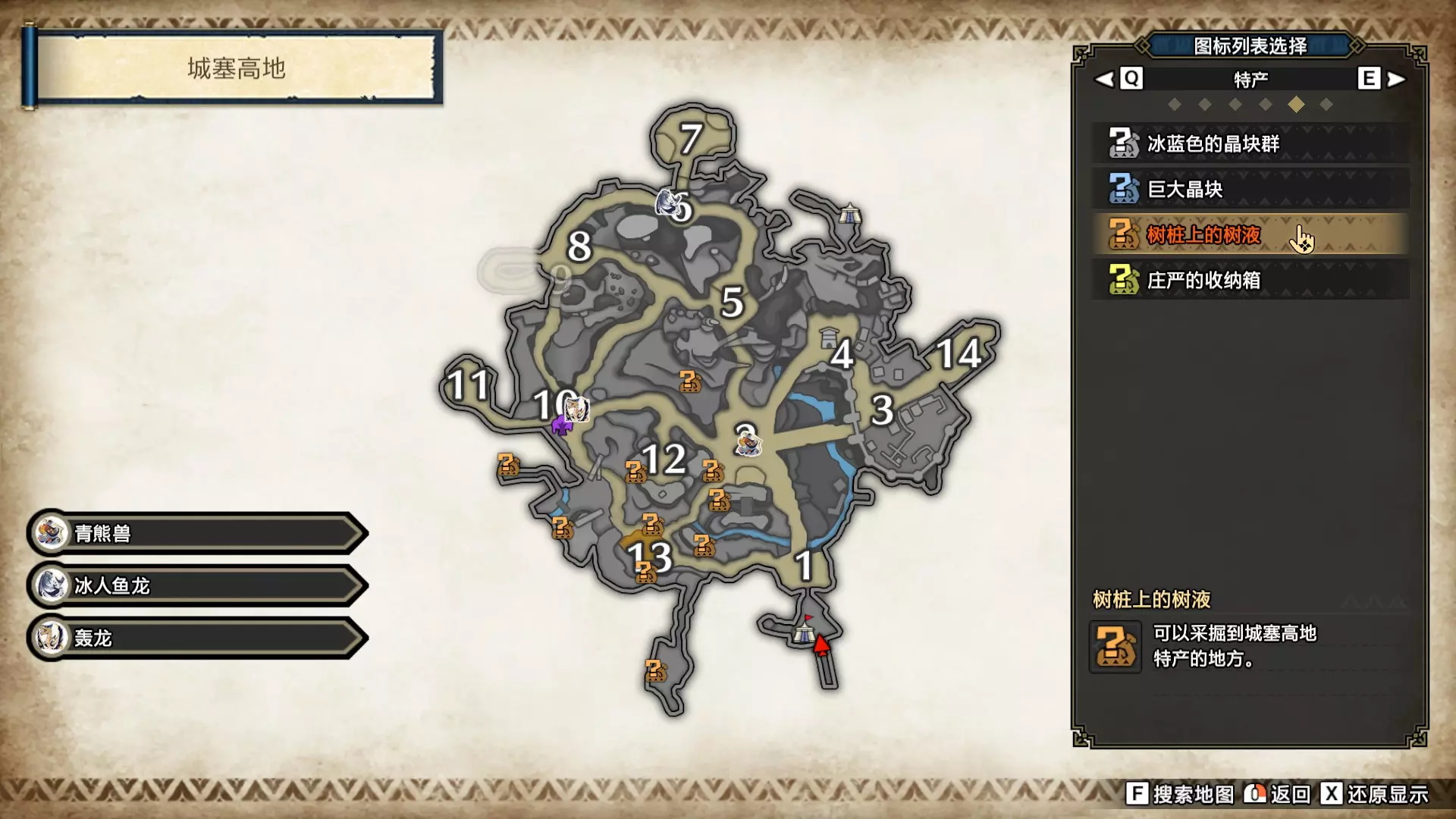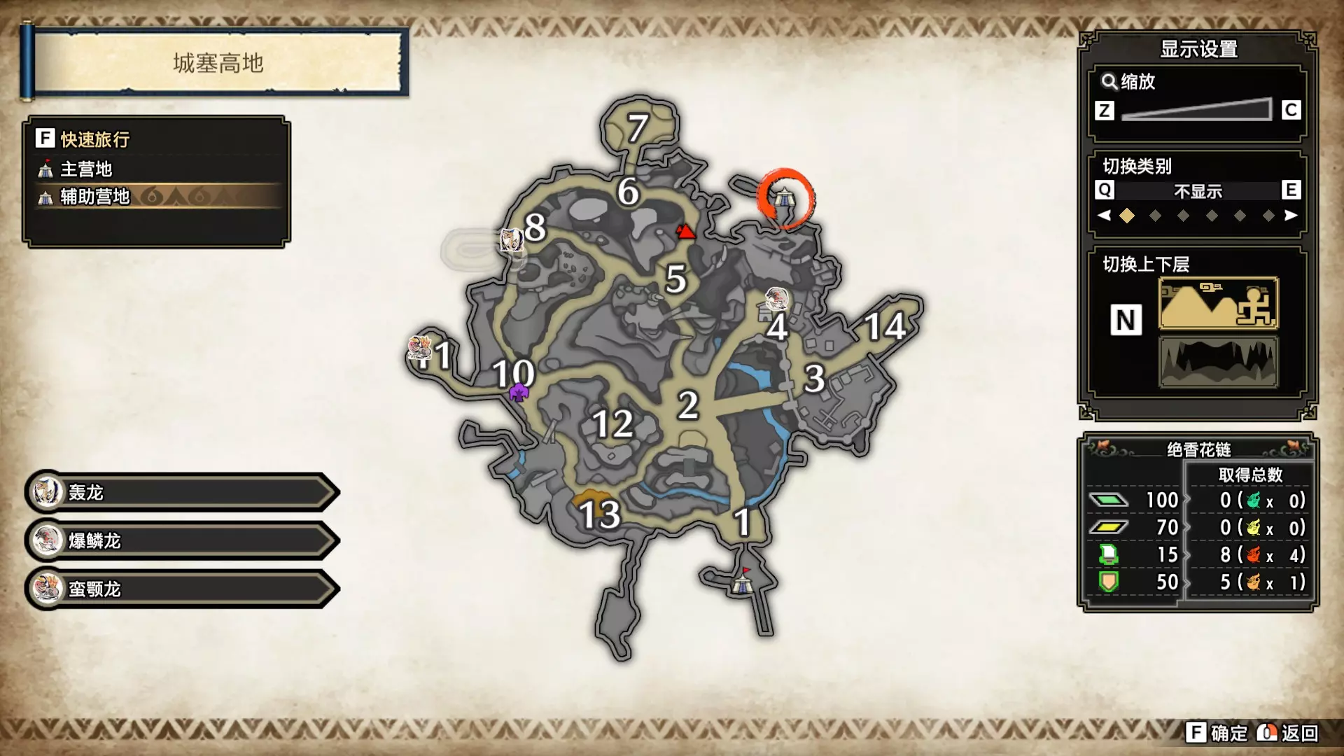 打开地图,按X显示图例,切换到原野。 选中【勾玉草(未发现)】便可在地图上显示未设置大翔虫的勾玉草。 勾玉草位置基本没有什么难度,知道方位,基本都能找到,按照下图排除即可。
