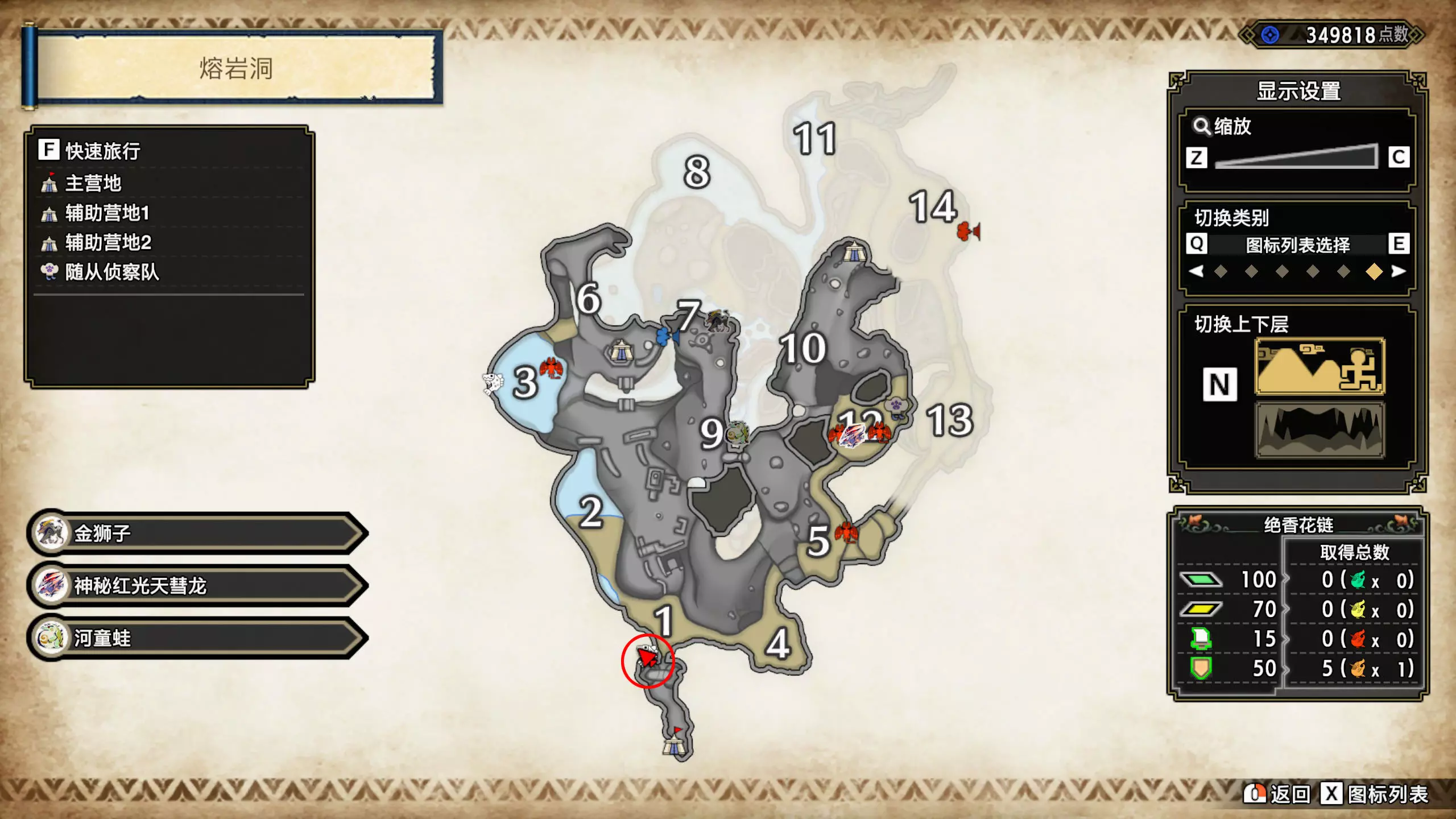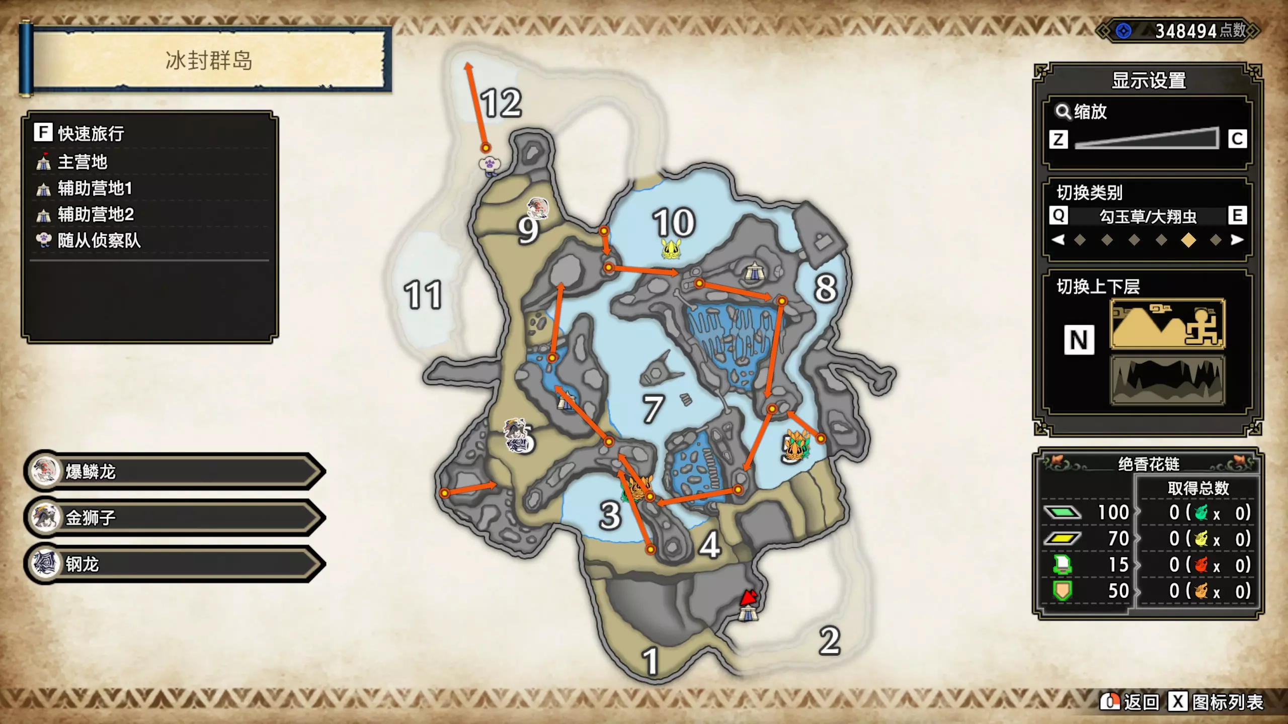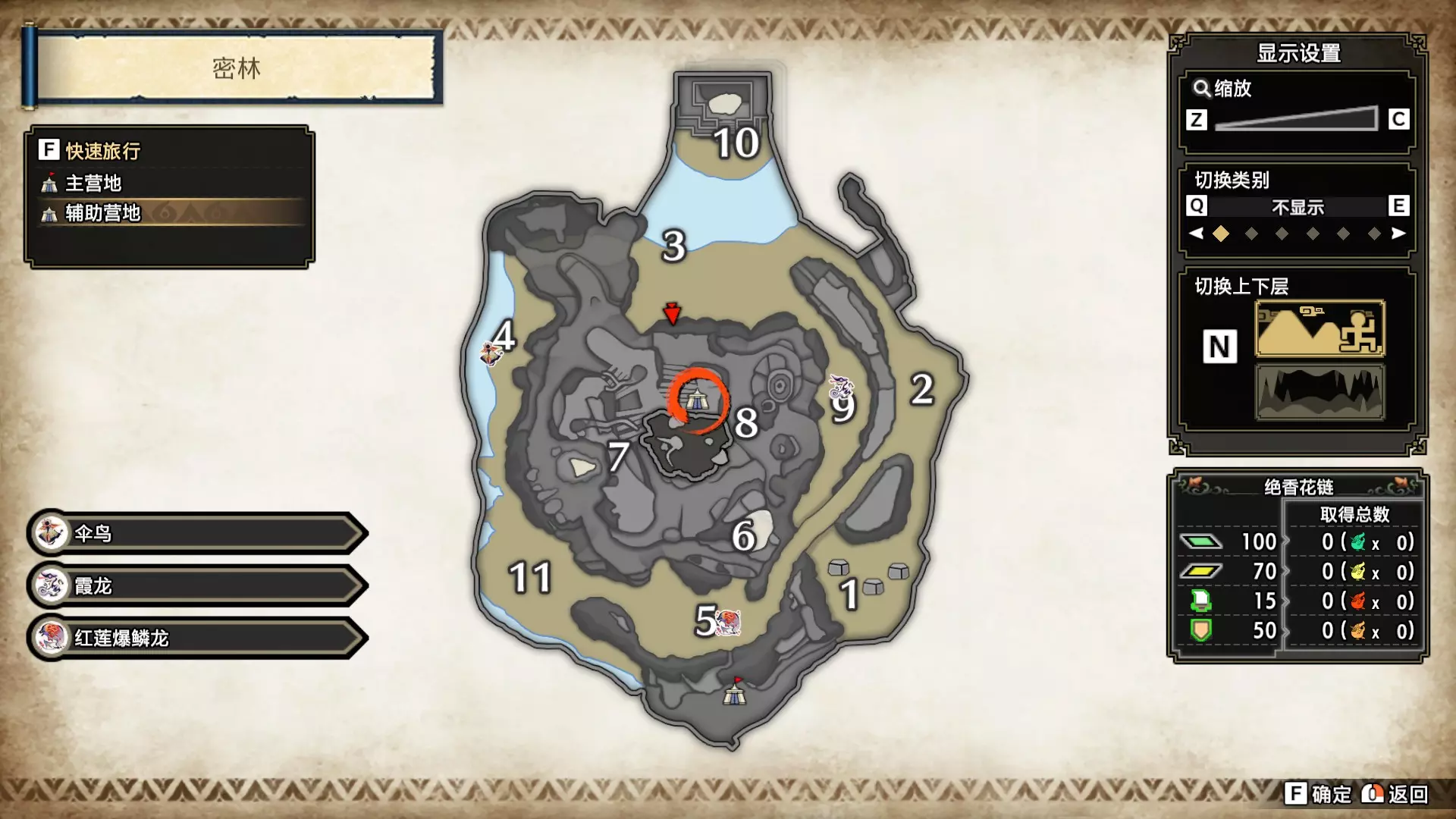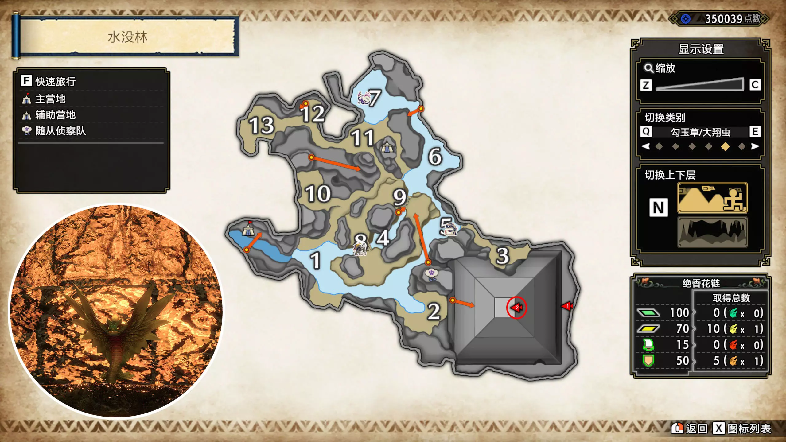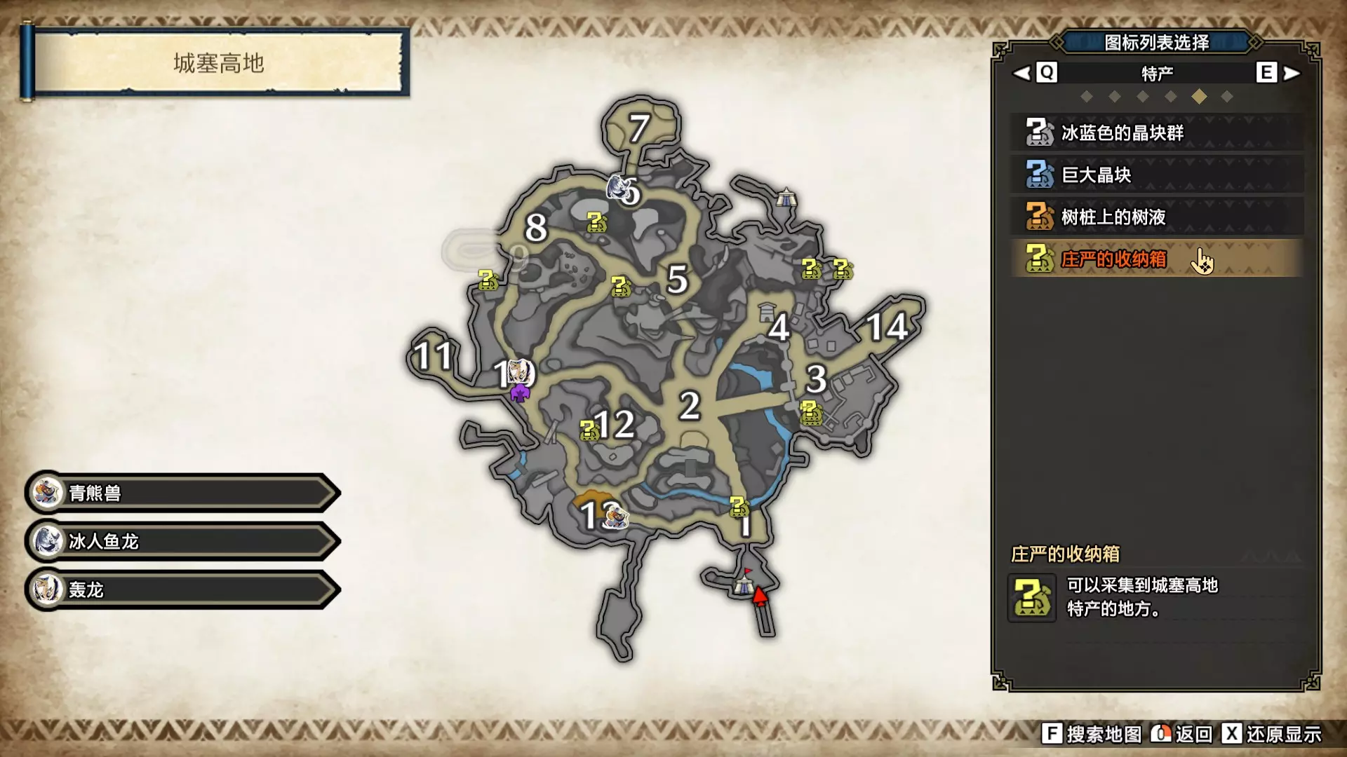 打开地图,按X显示图例,切换到原野。 选中【勾玉草(未发现)】便可在地图上显示未设置大翔虫的勾玉草。 勾玉草位置基本没有什么难度,知道方位,基本都能找到,按照下图排除即可。