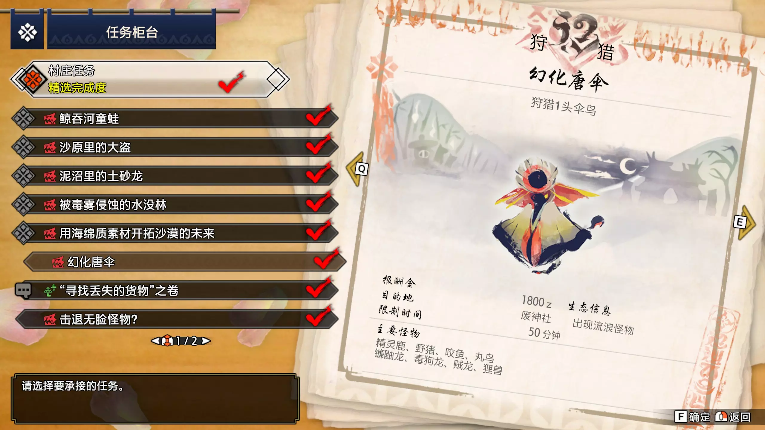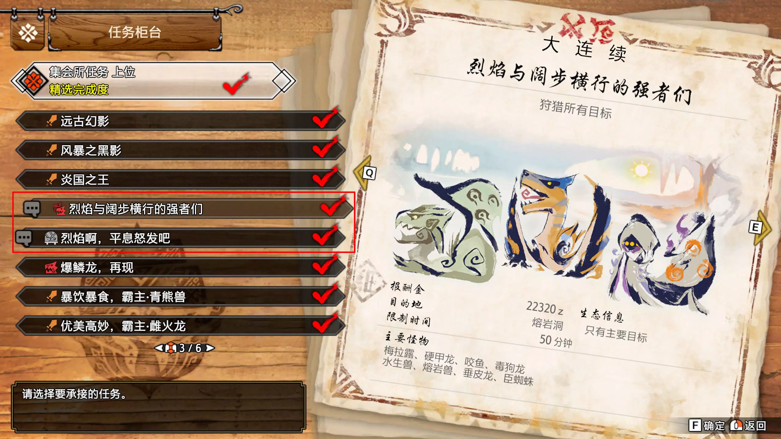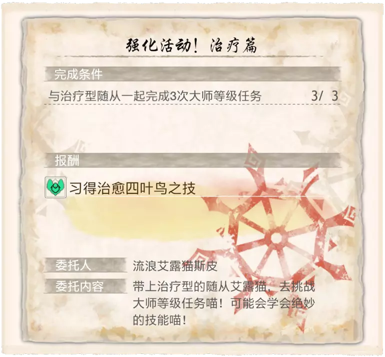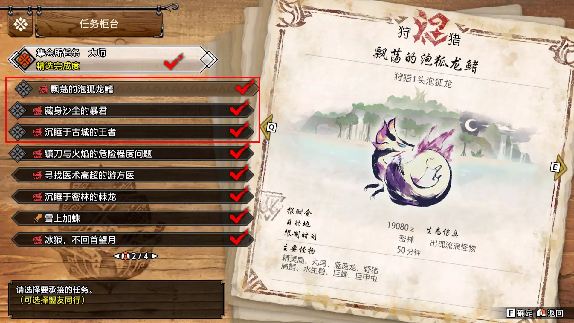 任务名称 完成条件 密林的辅助营地·确保安全 在密林讨伐8只盾蟹 城塞高地的辅助营地·确保安全 在城塞高地讨伐8头狡狗龙 华丽喷火的搭档 捕获1头绯天狗兽 赏月夜的白兔兽 捕获1头大师等级的白兔兽 强化技术结晶 捕获1只将军镰蟹 只求再见美丽人鱼一面 捕获1头冰人鱼龙【需钓到旗鱼才可解锁任务】 忙碌的调查队员发来的捕获委托 捕获1头冰狼龙 红鬼的建议 捕获1头大师等级的轰龙 目标是千刃般的箭矢 捕获1头千刃龙 ……是捕获冰牙龙的委托 捕获1头大师等级的冰牙龙 轮廓鲜明的面具 捕获1头大师等级的怨虎龙 捕获高贵黑蚀龙的委托 捕获1头黑蚀龙 凶暴之由 捕获1头电龙 捕获凶猛棘龙的委托捕获1头棘龙 捕获劲爆优惠的爆鳞龙! 捕获1头大师等级的爆鳞龙 冰封群岛出现巨人? 拍摄海蛞蝓坊主的照片 让故乡老友看看福木兔 在埃尔迦德拍3只福木兔的照片 那种美丽的红色极品 捕获1只炽妃蜘蛛 强化活动!治疗篇 与治疗型随从一起完成3次大师等级任务 强化活动!协助篇 与协助型随从一起完成3次大师等级任务 强化活动!爆破手篇 与爆破手型随从一起完成3次大师等级任务 强化活动!收集篇:与收集型随从一起完成3次大师等级任务 强化活动!战斗篇:与战斗型随从一起完成3次大师等级任务 随从的主人 爱之挑战:3只随从的技能记忆力达到8 习得训练 严酷的训练地点篇:在熔岩洞讨伐8只大师等级的臣蜘蛛