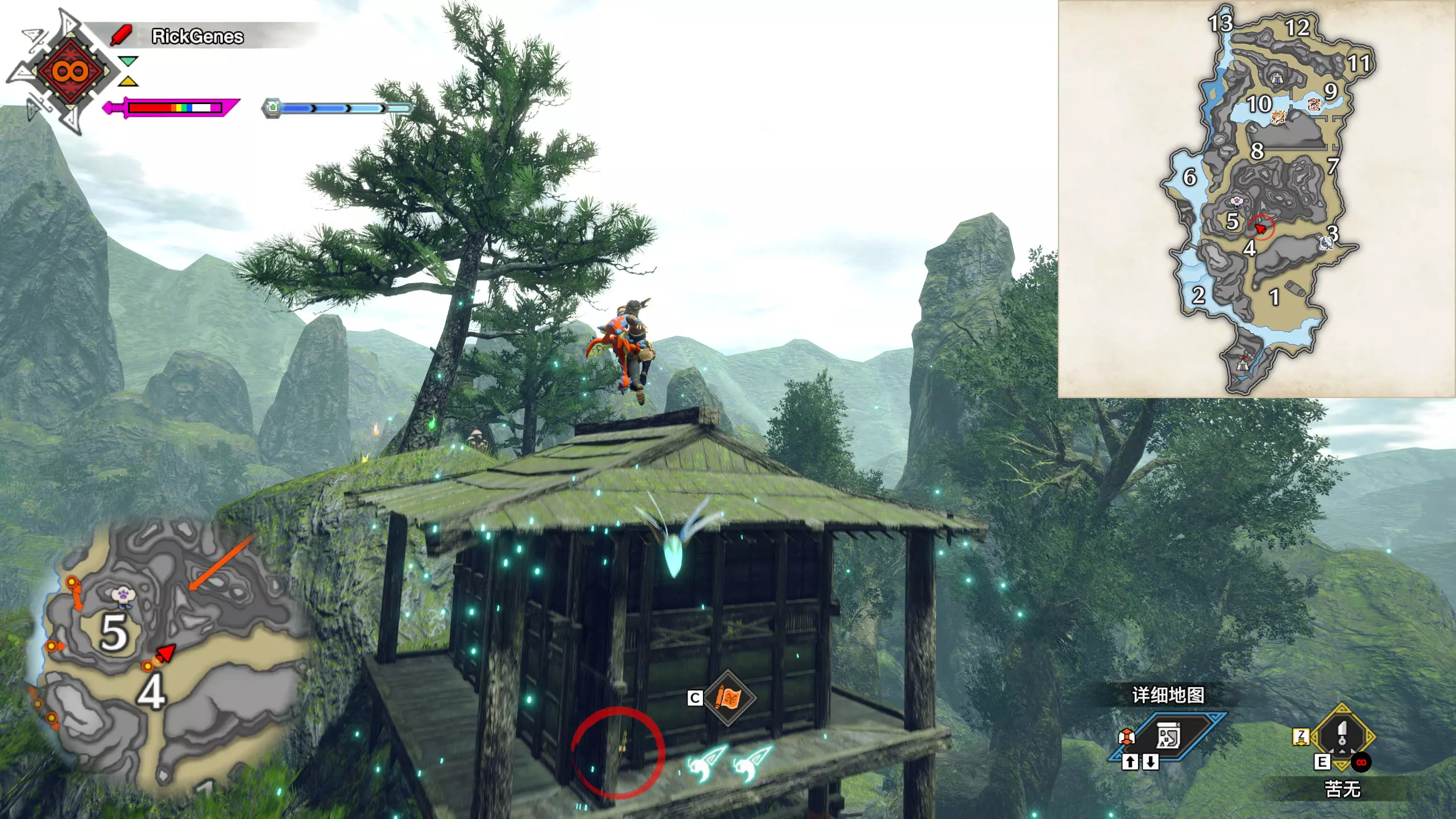 右侧:从12区向左攀爬藤蔓,攀爬到第二个藤蔓后,前往营地。左侧:从1区攀爬藤蔓,一直往营地方向前进。