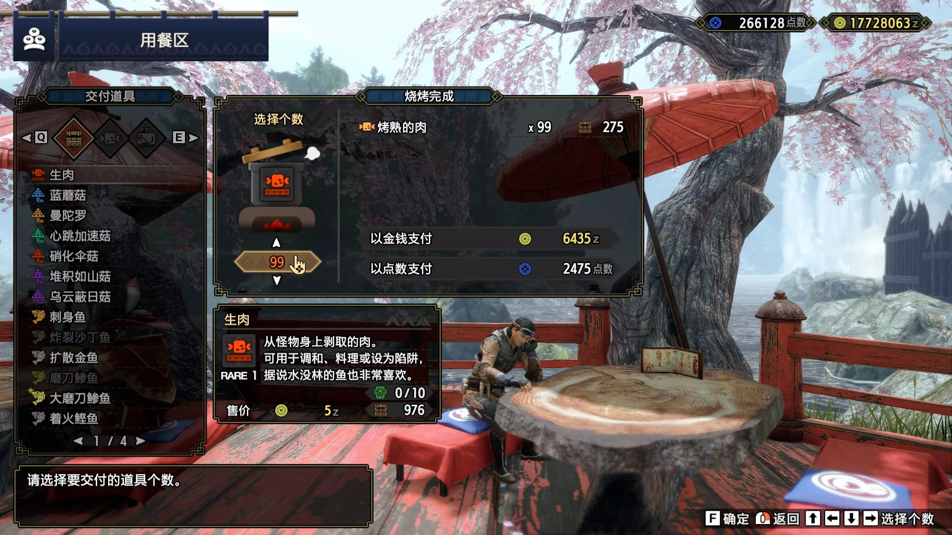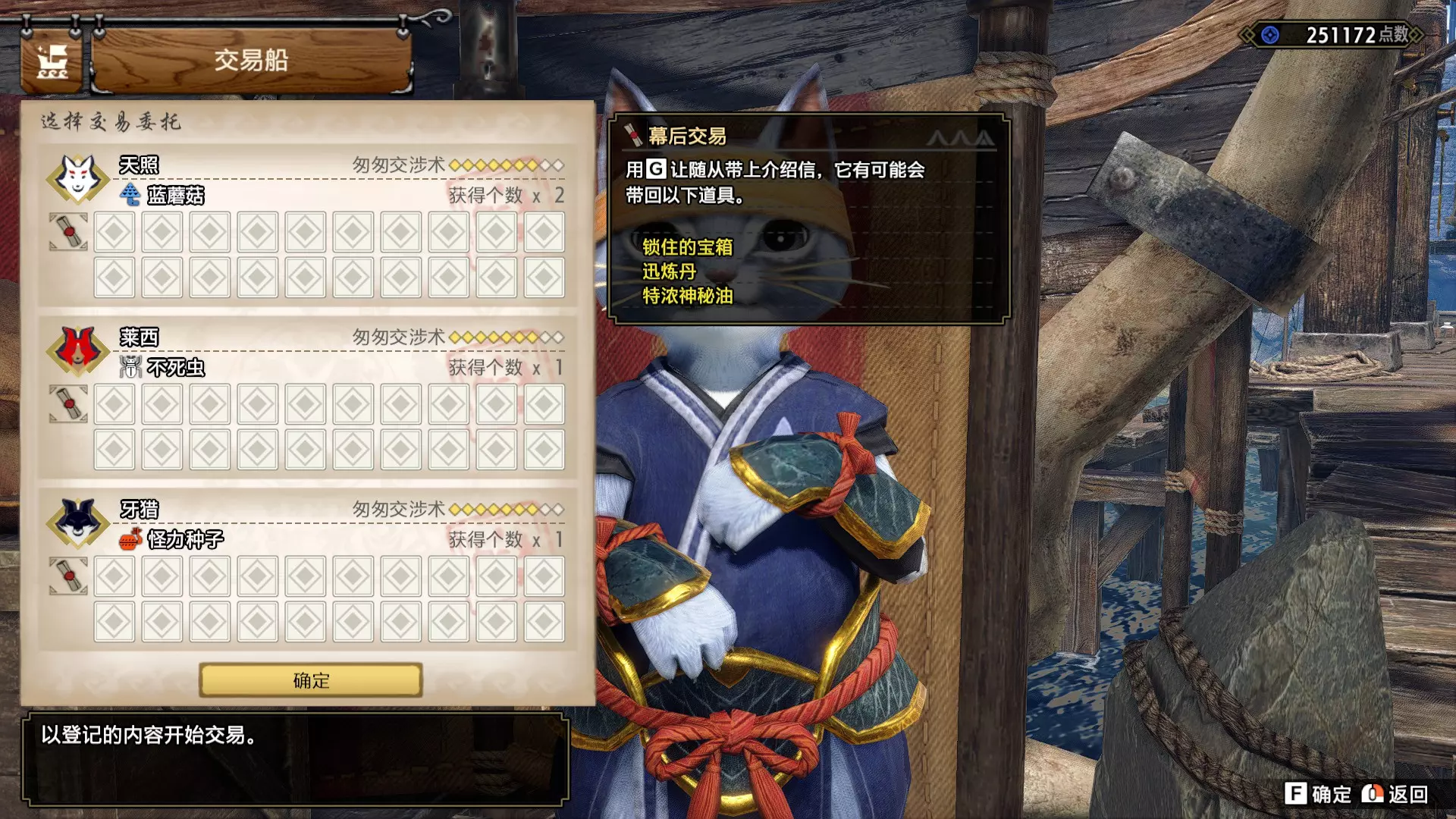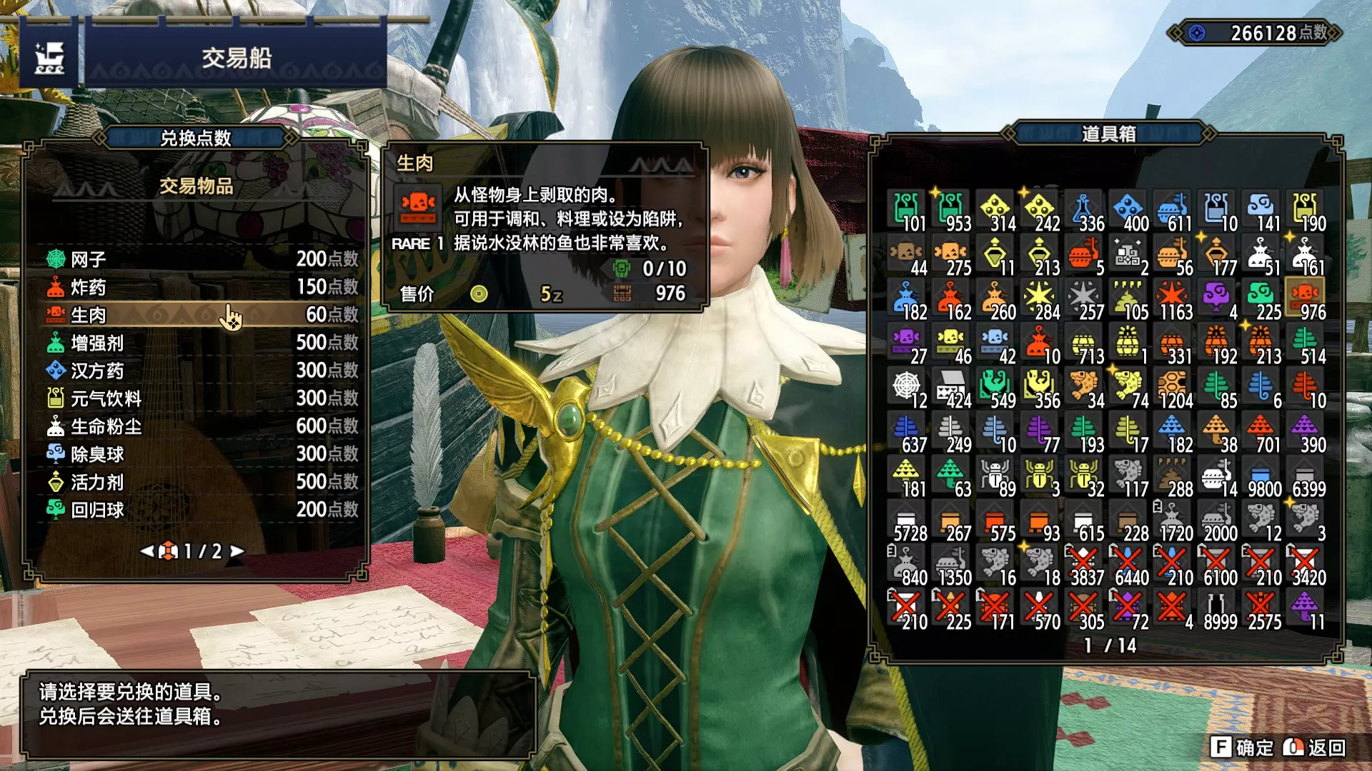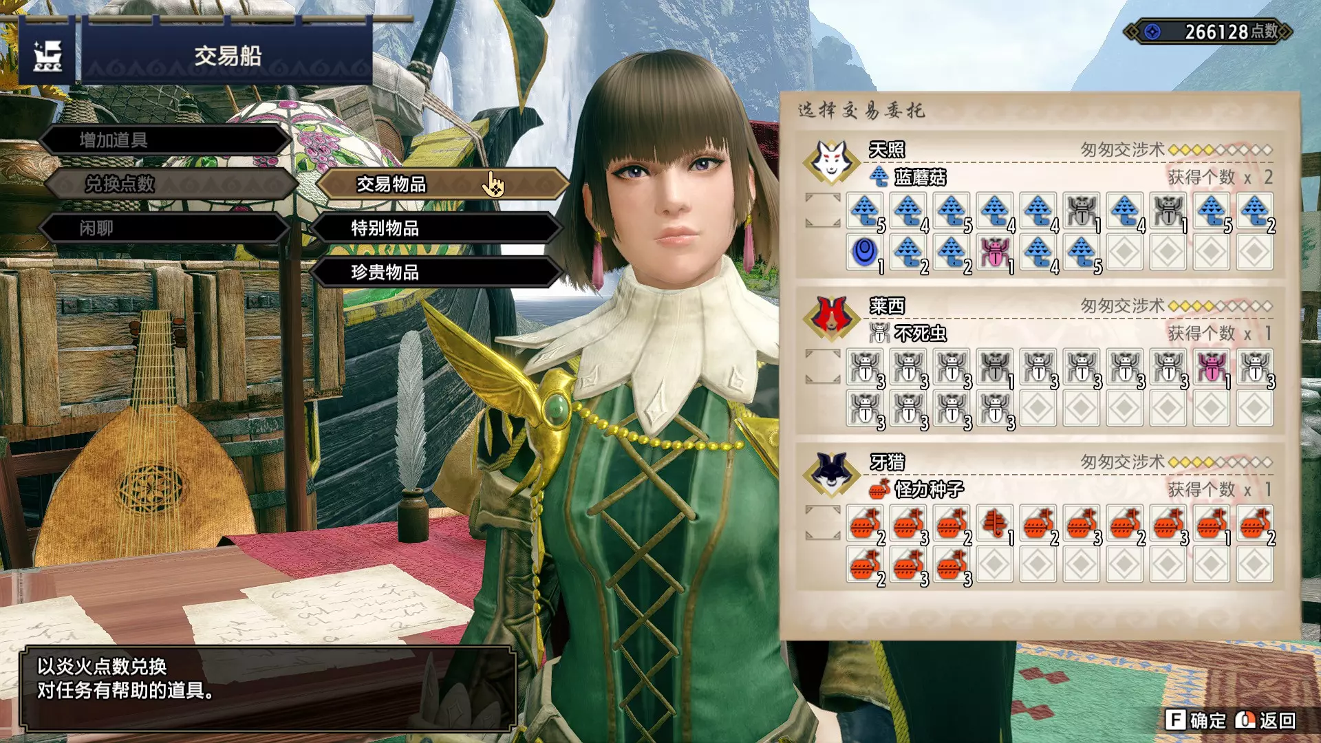 在交易船选择交易物品,购买若干生肉。若点数不足,可通过交易船收集蓝蘑菇来补充。