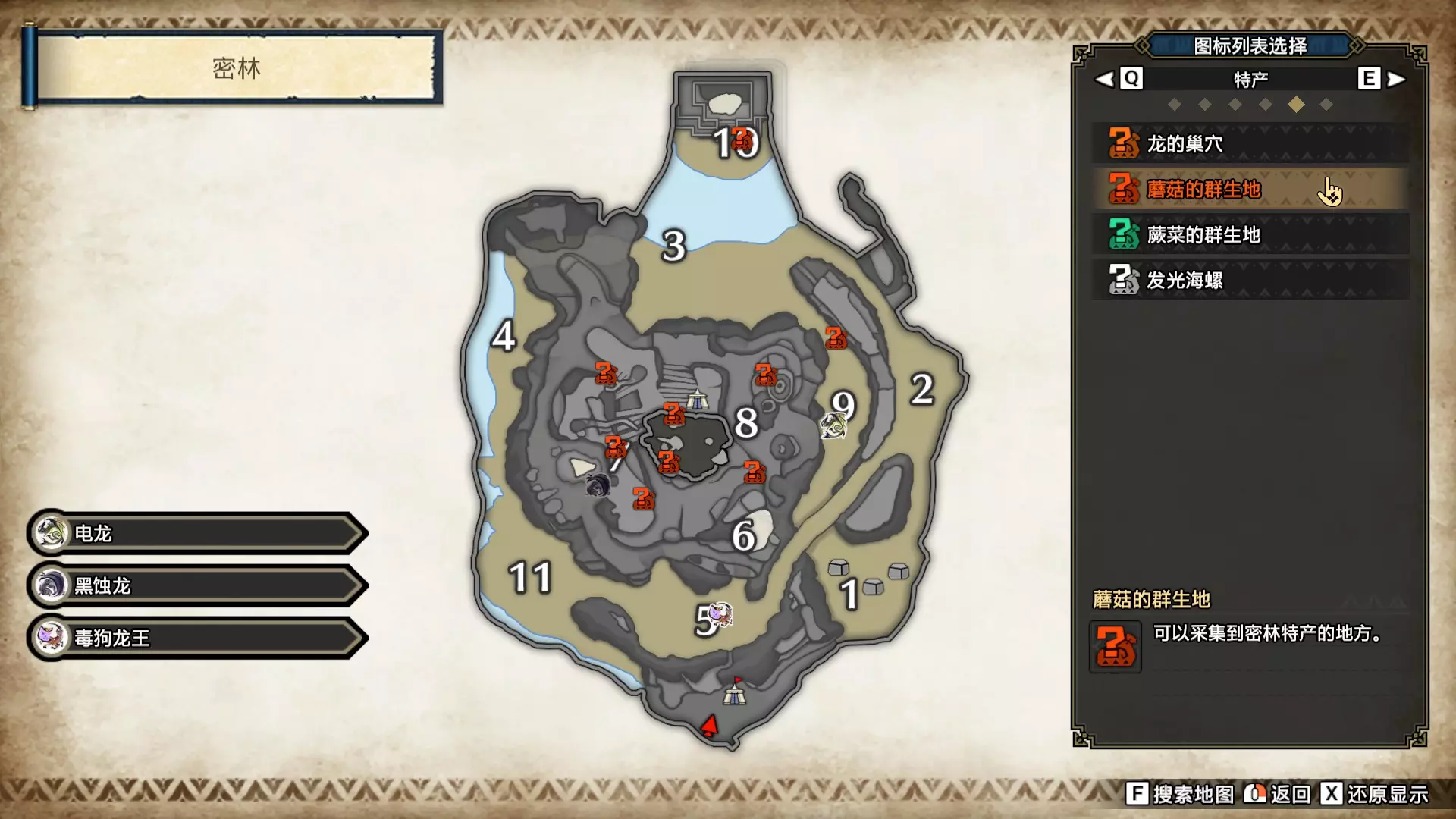 密林1可拍摄:鬼偶蛛、变色虫、穿刺乌贼、变幻翔虫・红、变幻翔虫・金。