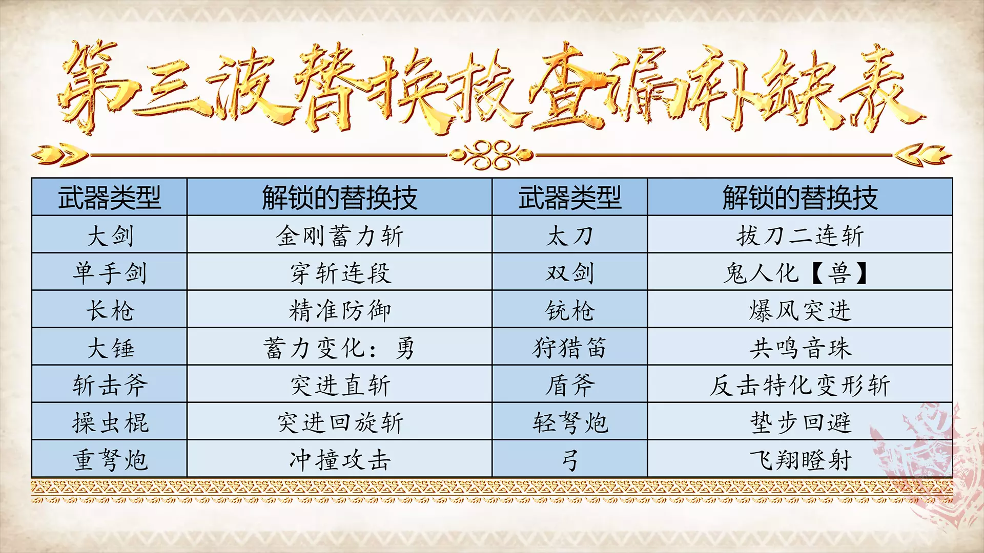 每种武器生产或强化累计8次即可领取对应替换技,重复制作无效,可回溯返还素材。