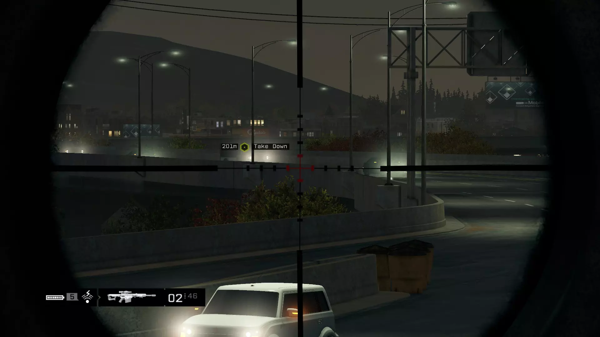 B) 使用狙击步枪从远处逐个消灭敌人,甚至可以射击目标车辆的轮胎以阻止其逃跑。正如我之前所说,购买M107狙击步枪会很有用。请注意,如果你没有处理其他敌方车辆,只专注于让目标车辆无法移动,他们会向你驶来。所以要准备好上车或战斗。 这个例子就是我所说的从远处狙击目标。在这里,我远远开到路线前方,使用【Destroyer】从远处使目标车辆无法移动。然后只需将他消灭,并在支援到来前驾车离开。即使没有【Destroyer】,你仍然可以狙击轮胎,他们就会停下来。
